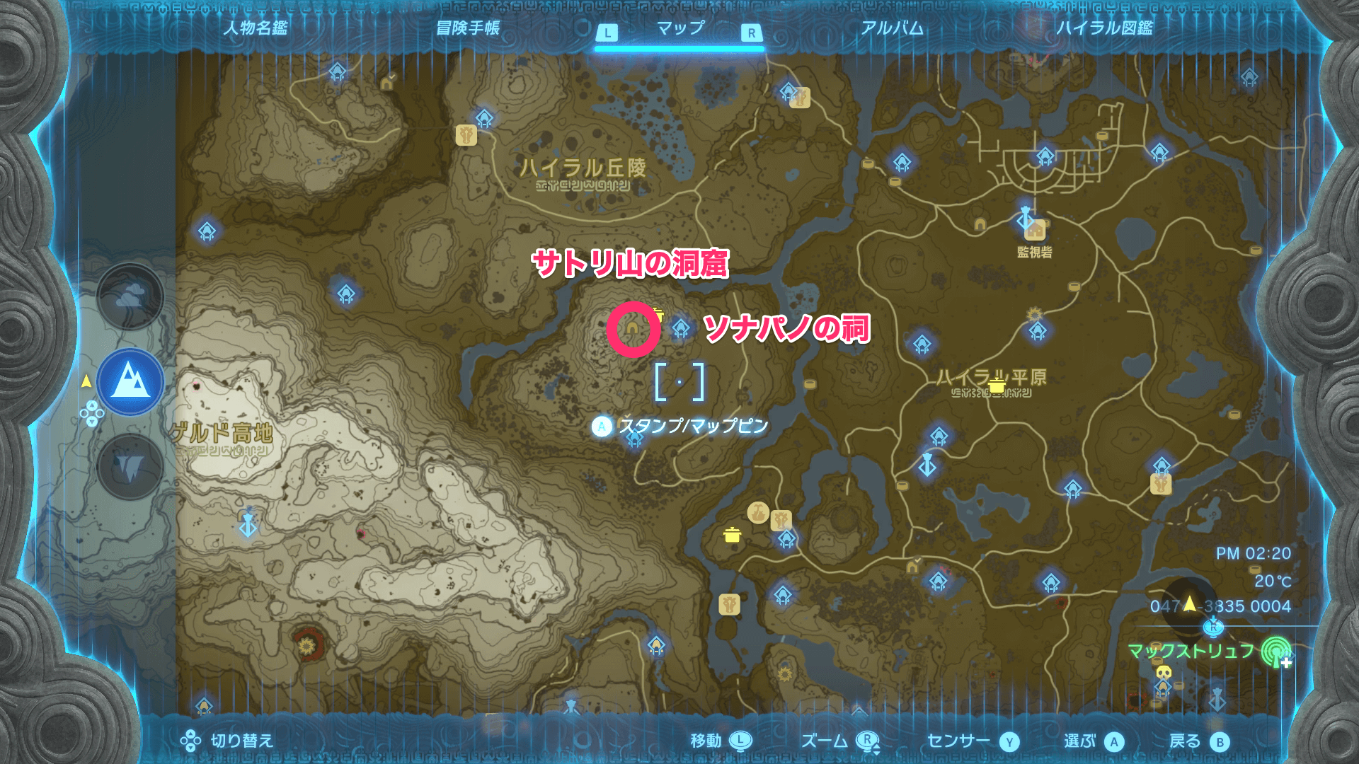 マックストリュフは、サトリ山の洞窟にある。サトリ山の洞窟の近くにソナパノの祠があるので、祠にワープして向かおう。