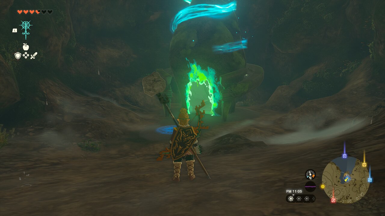 祠のある「黄泉の川の滝裏洞窟」は、黄泉の川水源近くの滝に向かって右手に入口がある。ライクライクと光る獣が目印になるので、地上では遠くからでも発見がしやすい。ただし、上空からだと視認が難しいため、滝に向かって右側に着地するという意識で降下しよう。