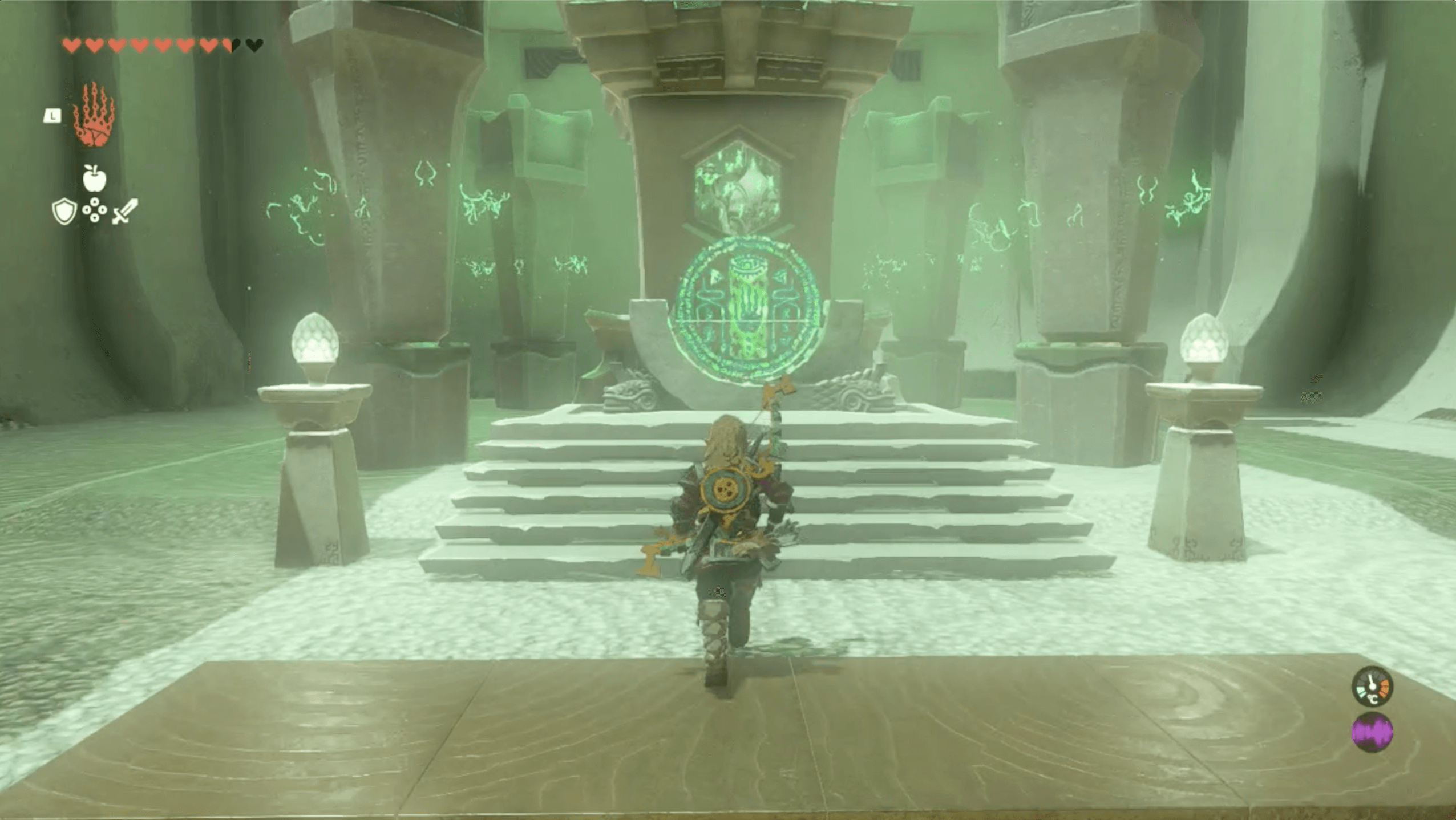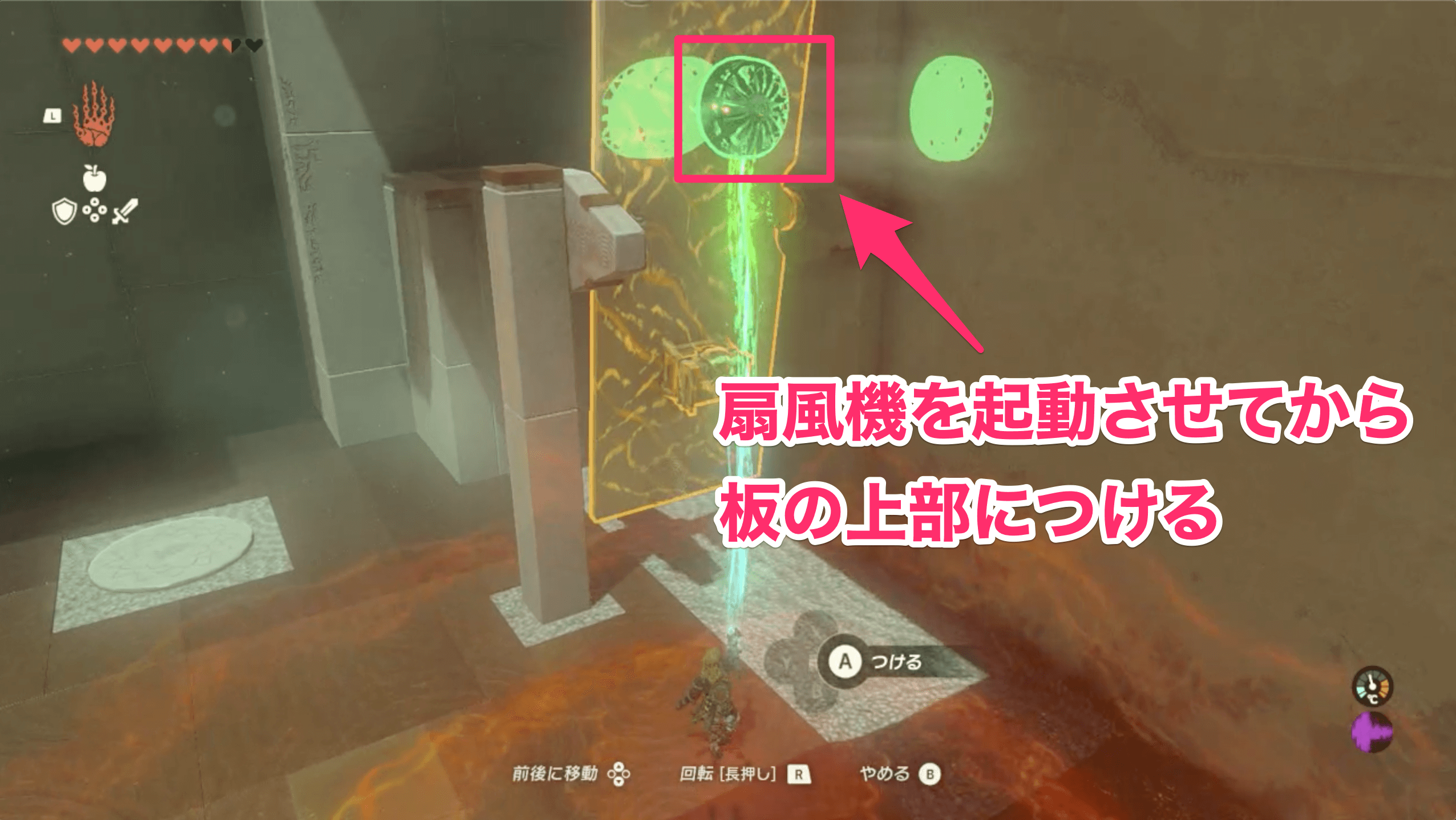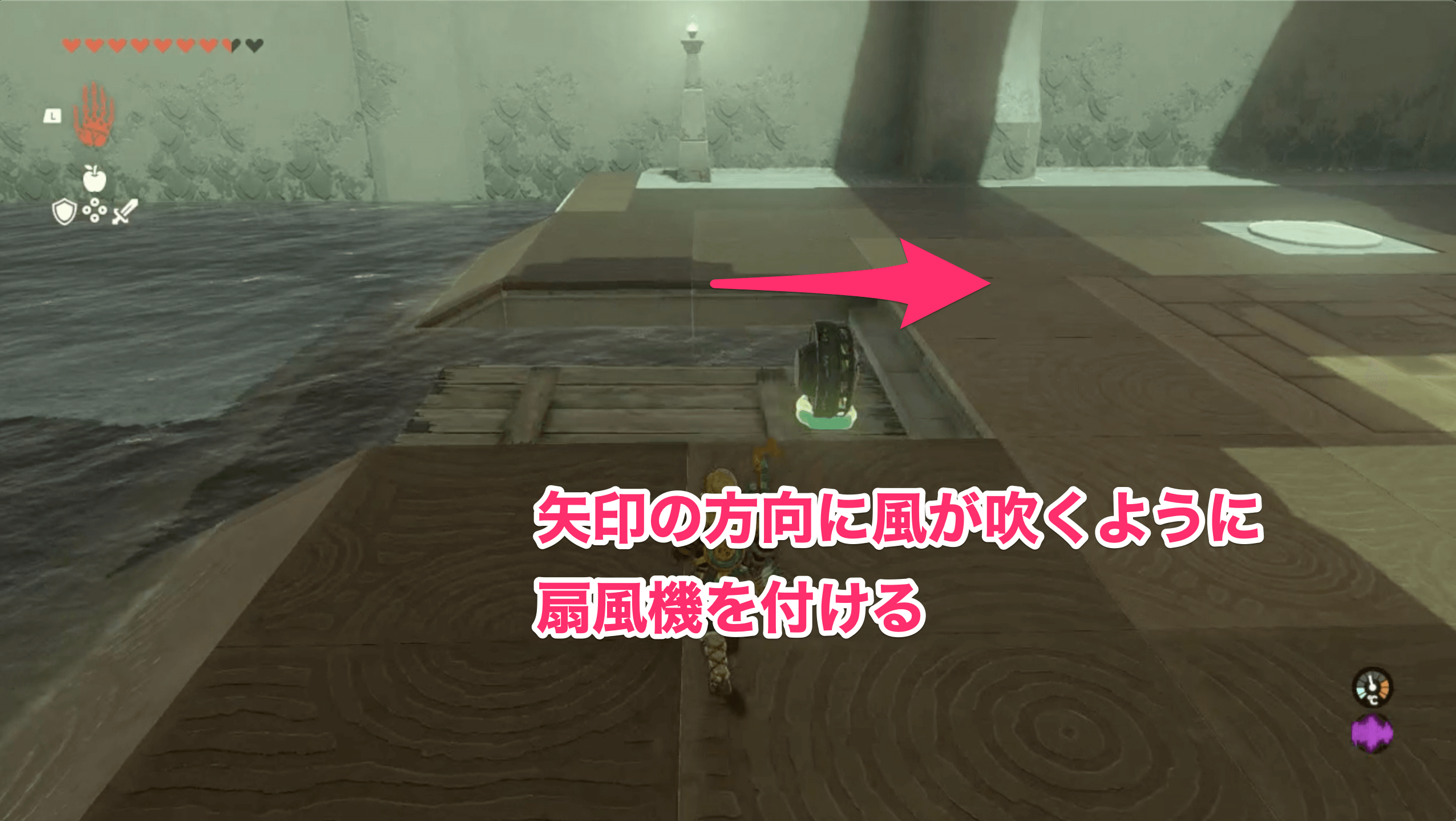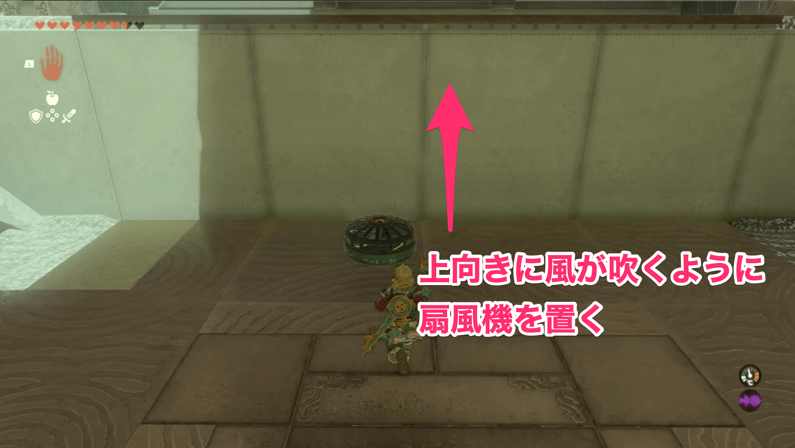 イショダグンの祠では、扇風機を使って奥に進んで行く。なお、奥に進むには、進行方向に合わせてウルトラハンドで扇風機の向きを変える必要があるため、風が出る方向を考えながら進んで行こう。