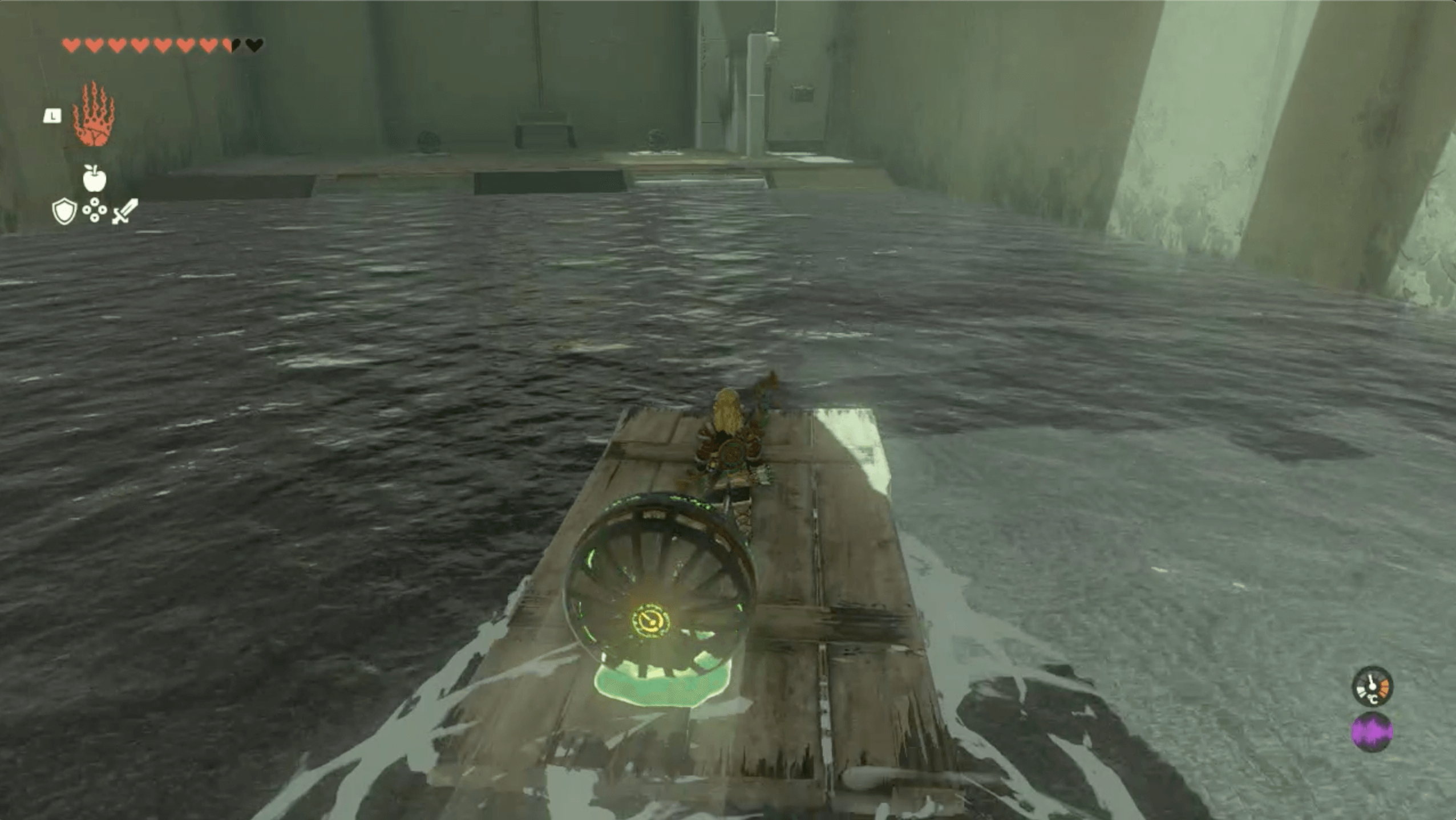 板で水上を進んで右手にある宝箱は、扇風機を起動させて風を吹かせ、板の上部に接着しよう。接着すれば板が水平になり、板の下からトーレルーフを使えば宝箱を回収できる。