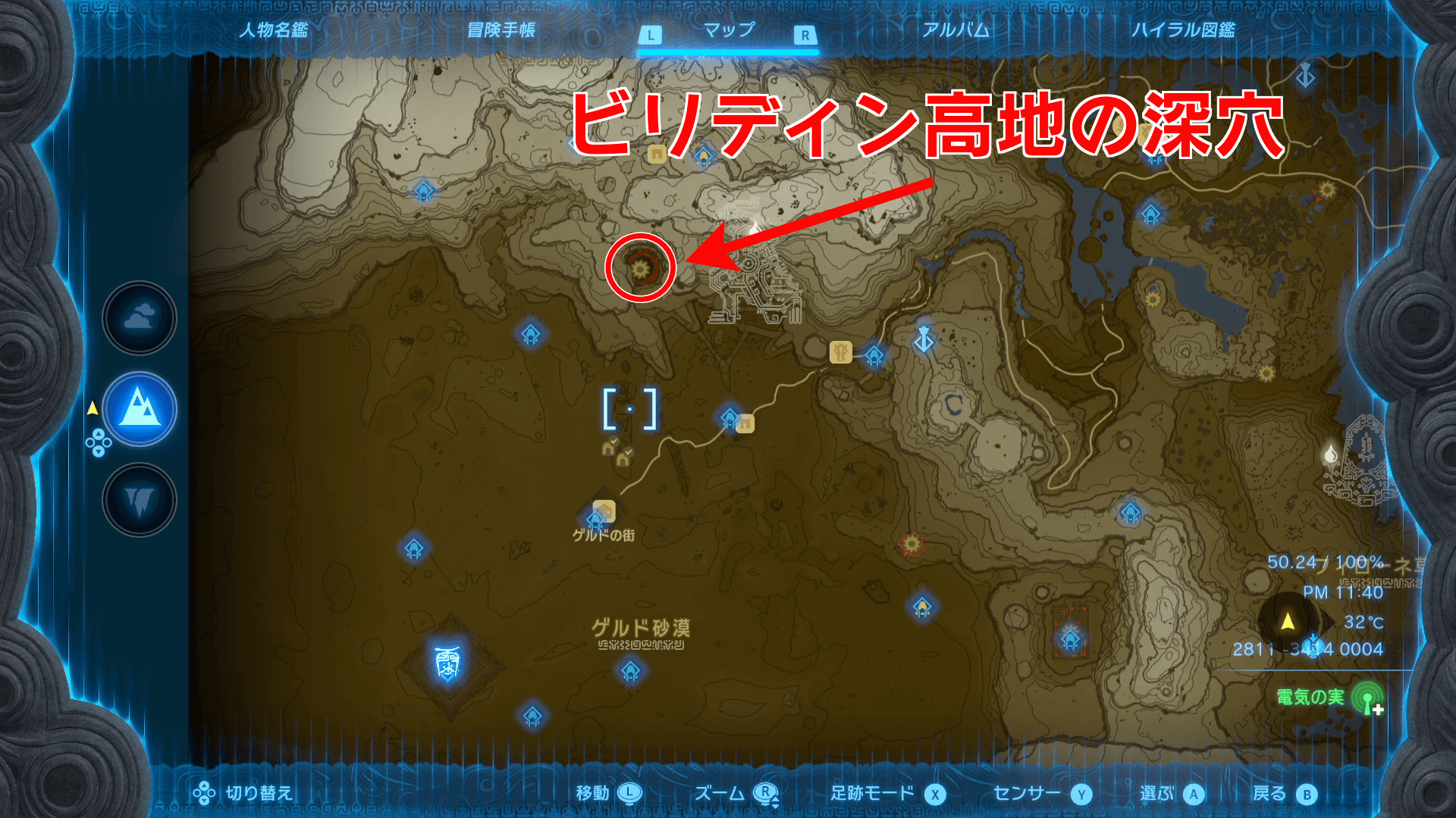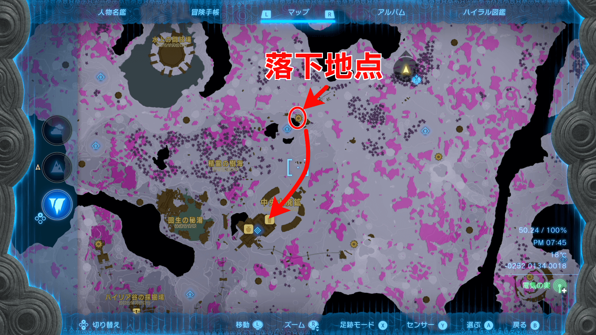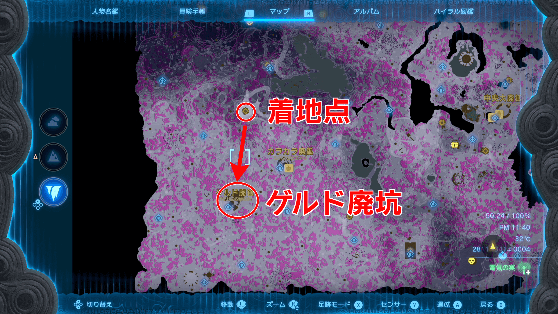ゲルド廃坑までは、地上の「ビリディン高地の深穴」から地底に降りていくのがおすすめ。地底からも像を辿れば行き着けるが、マップが解放されていない状態では、進みにくいため地上から行こう。