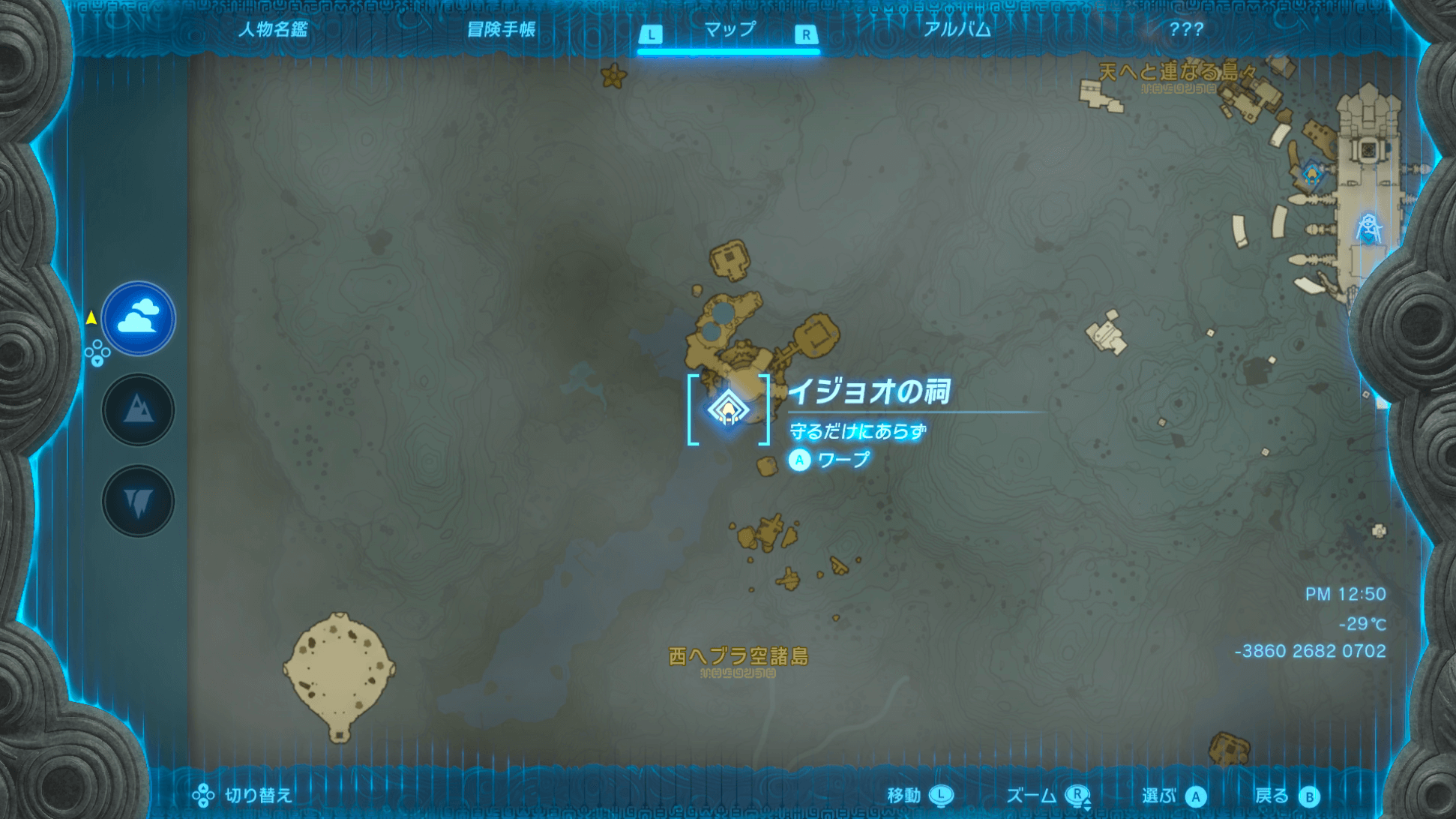 「イジョオの祠」は、メインチャレンジ「四地方の異変調査」で訪れる「風の神殿」から西に飛んだ場所に位置している。また、風の神殿から飛んでも、途中でがんばりゲージがなくなってしまうため、途中で着地する場所を決めてから向かおう。