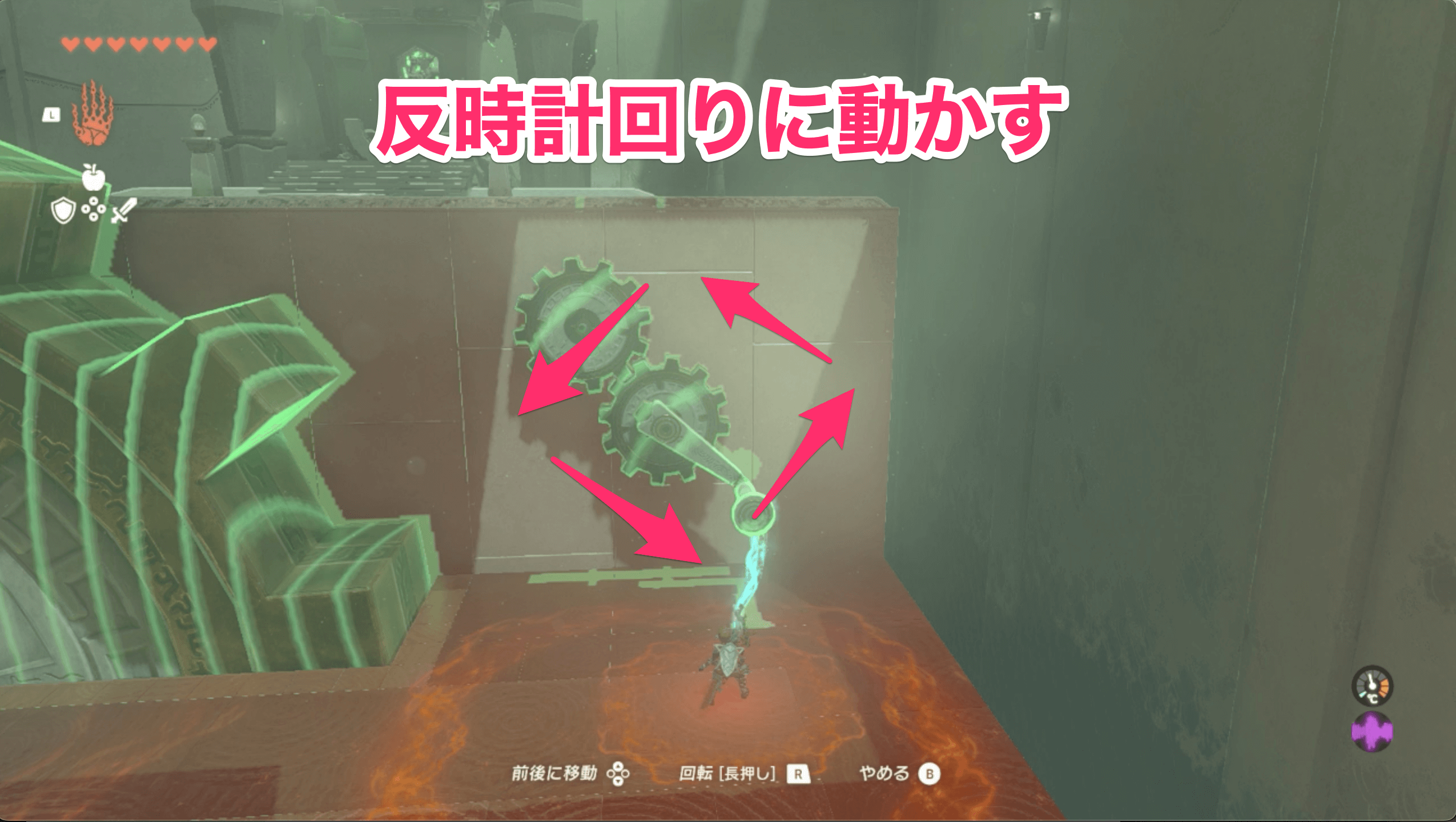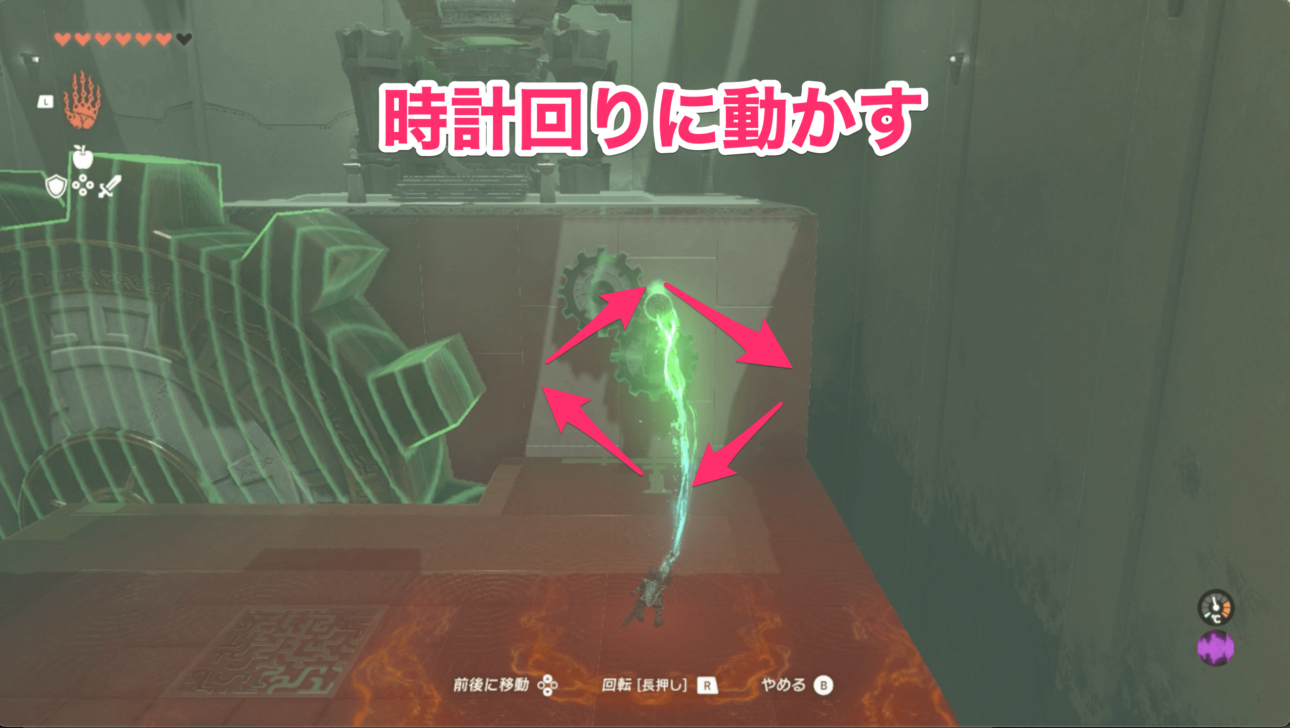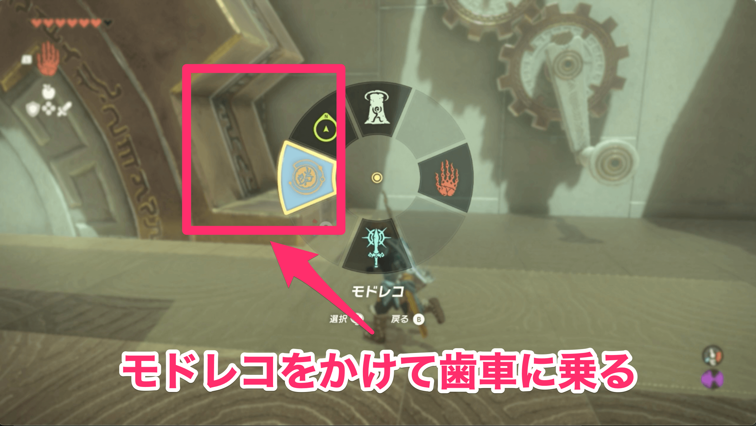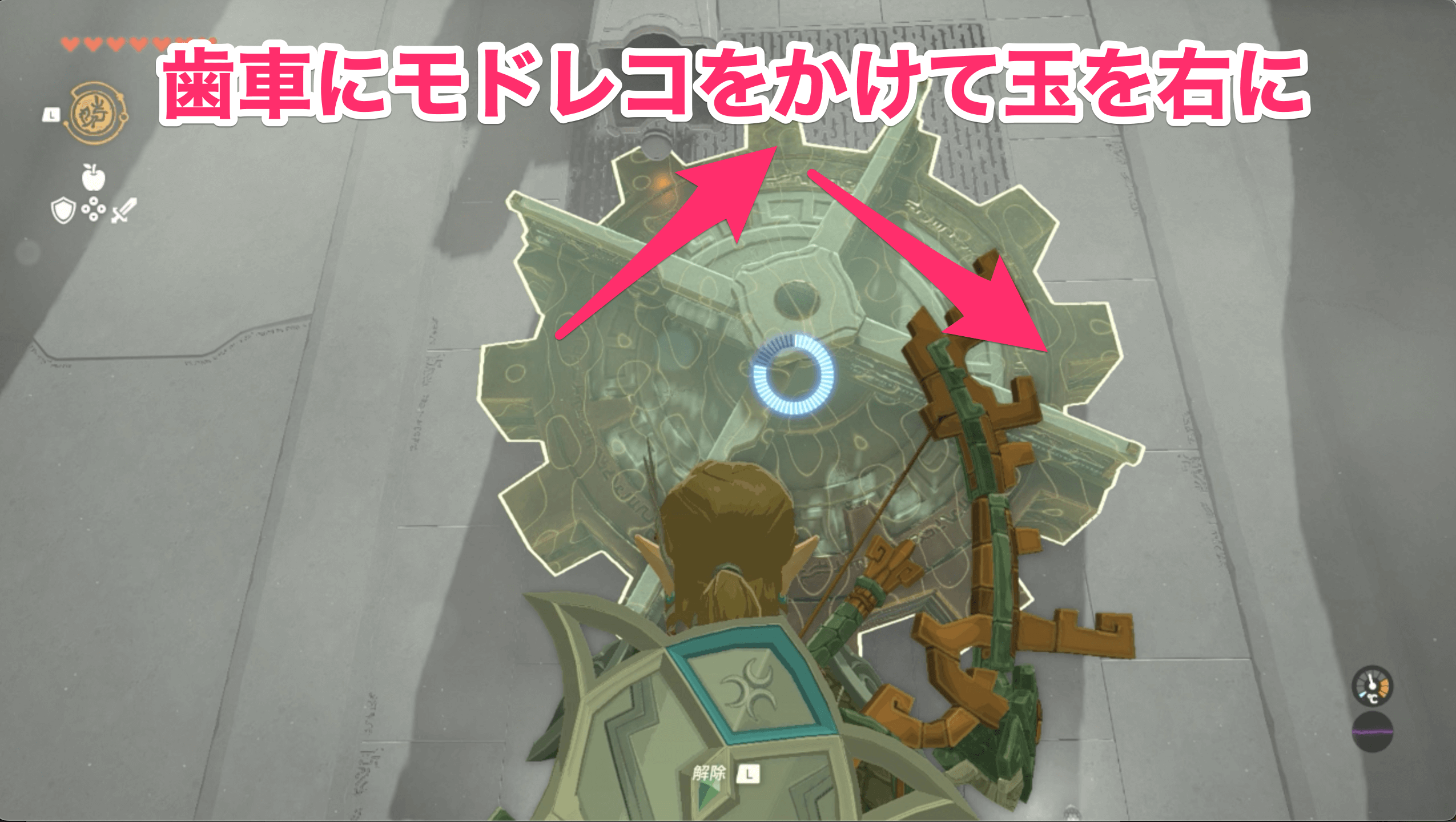 祠の中に入ったら、まず目の前にある大きな歯車にモドレコをかけて、落ちてくる玉を右側に誘導しよう。玉が下にある穴にハマれば、先へ進むための扉が開く。