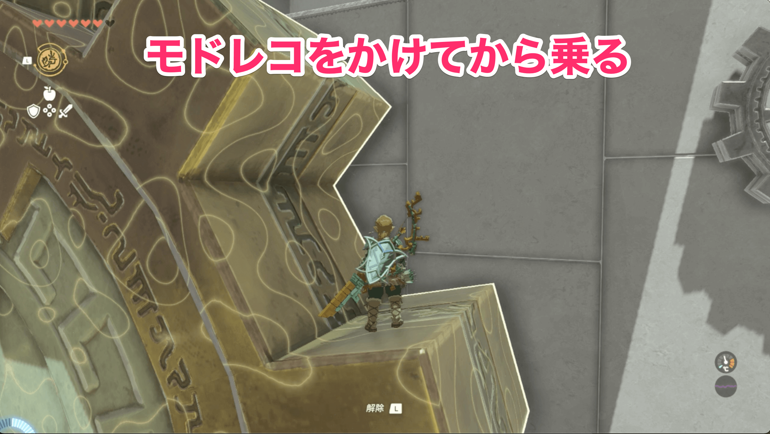 ハンドルの場所に戻ったら、ウルトラハンドを使ってハンドルを時計回りに動かそう。回した後に歯車にモドレコをかけて乗れば、ゴールである紋章のもとへ辿り着ける。