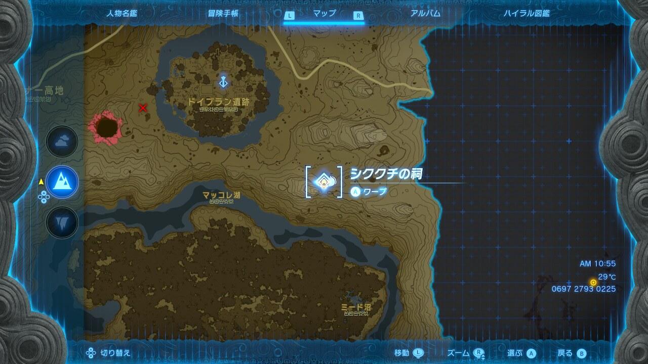 「シククチの祠」は、ドイブラン遺跡鳥望台の南東にある。まだ鳥望台を解放していない場合は、先に訪れておくと良い。鳥望台を使って飛び上がったら、南東方向へ進もう。