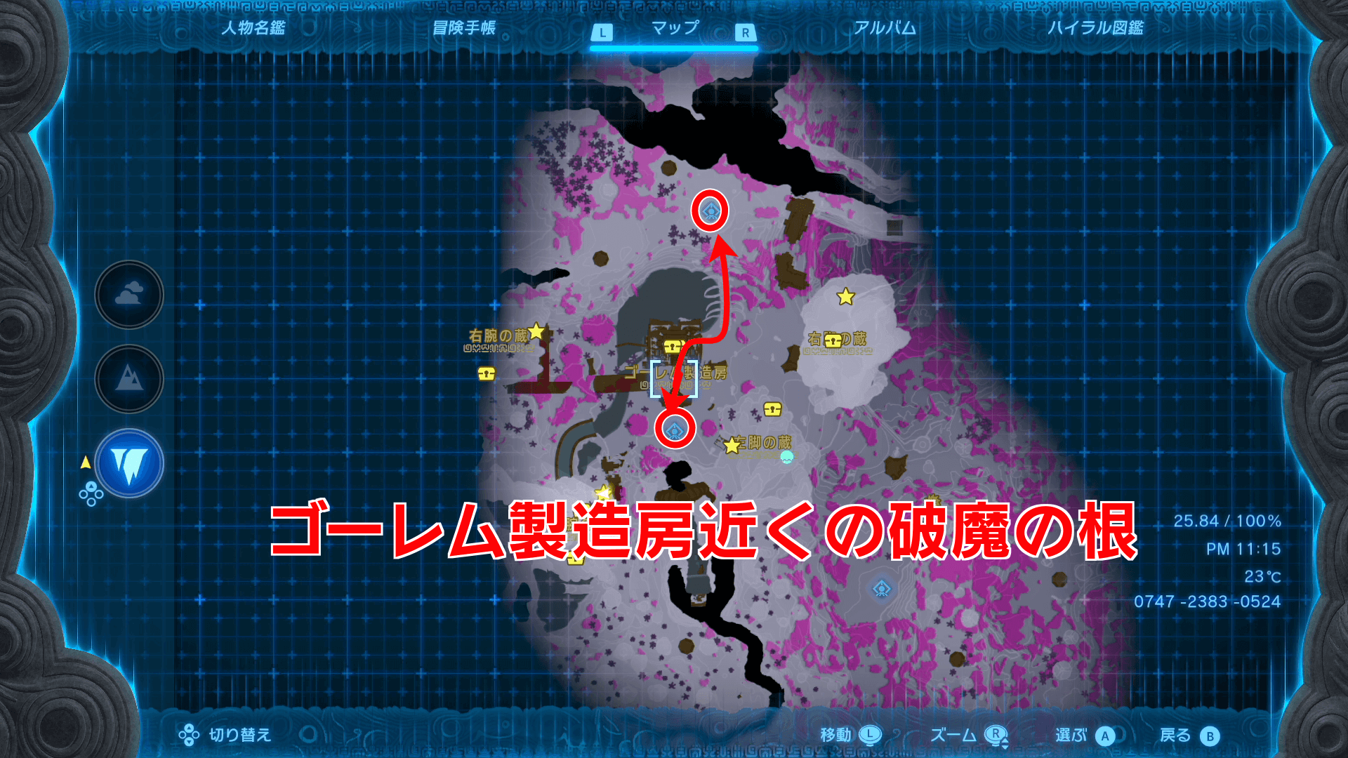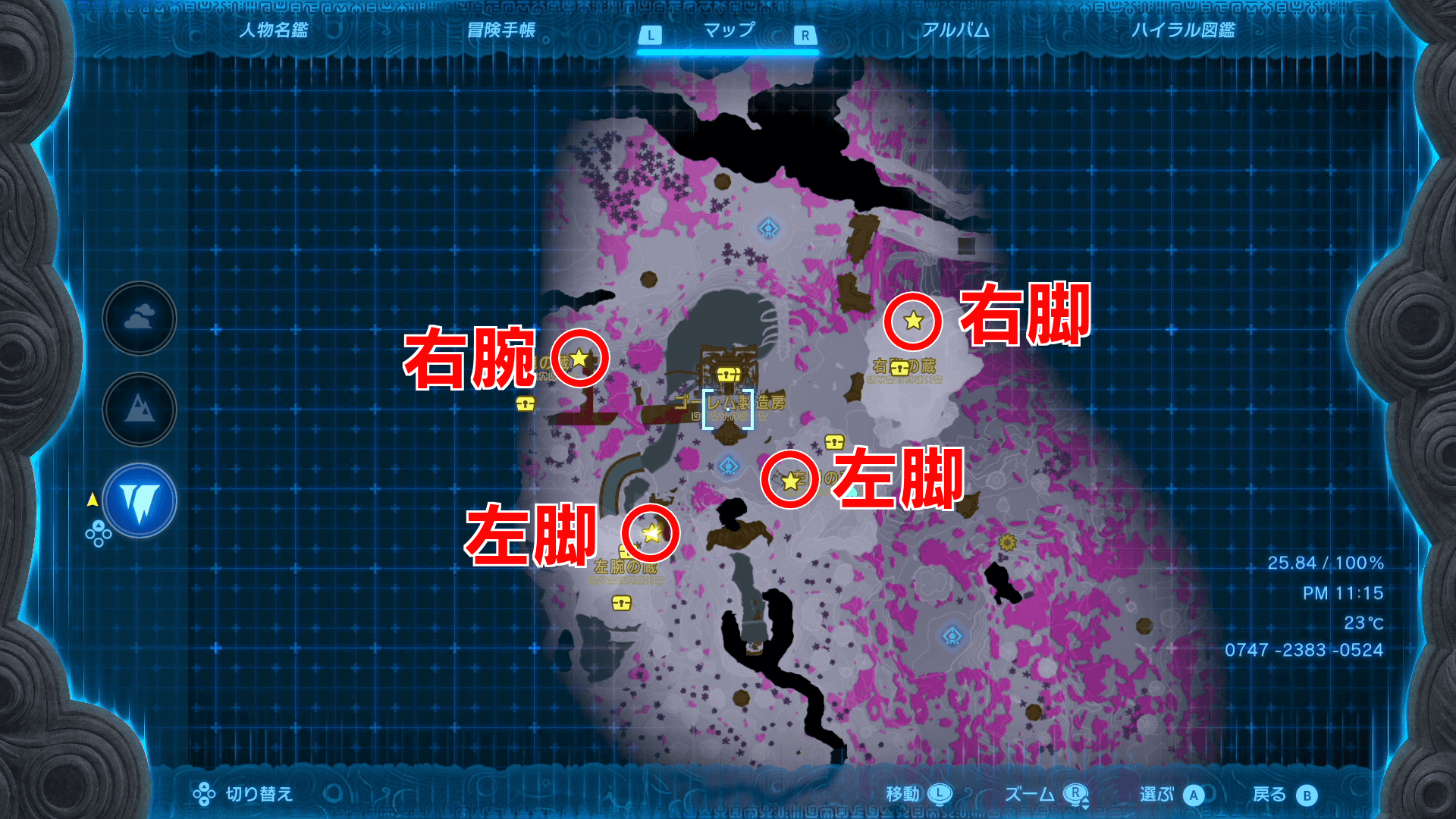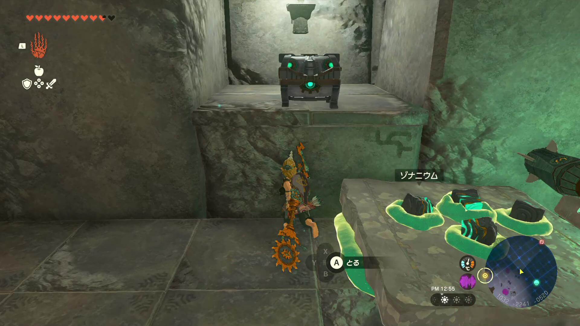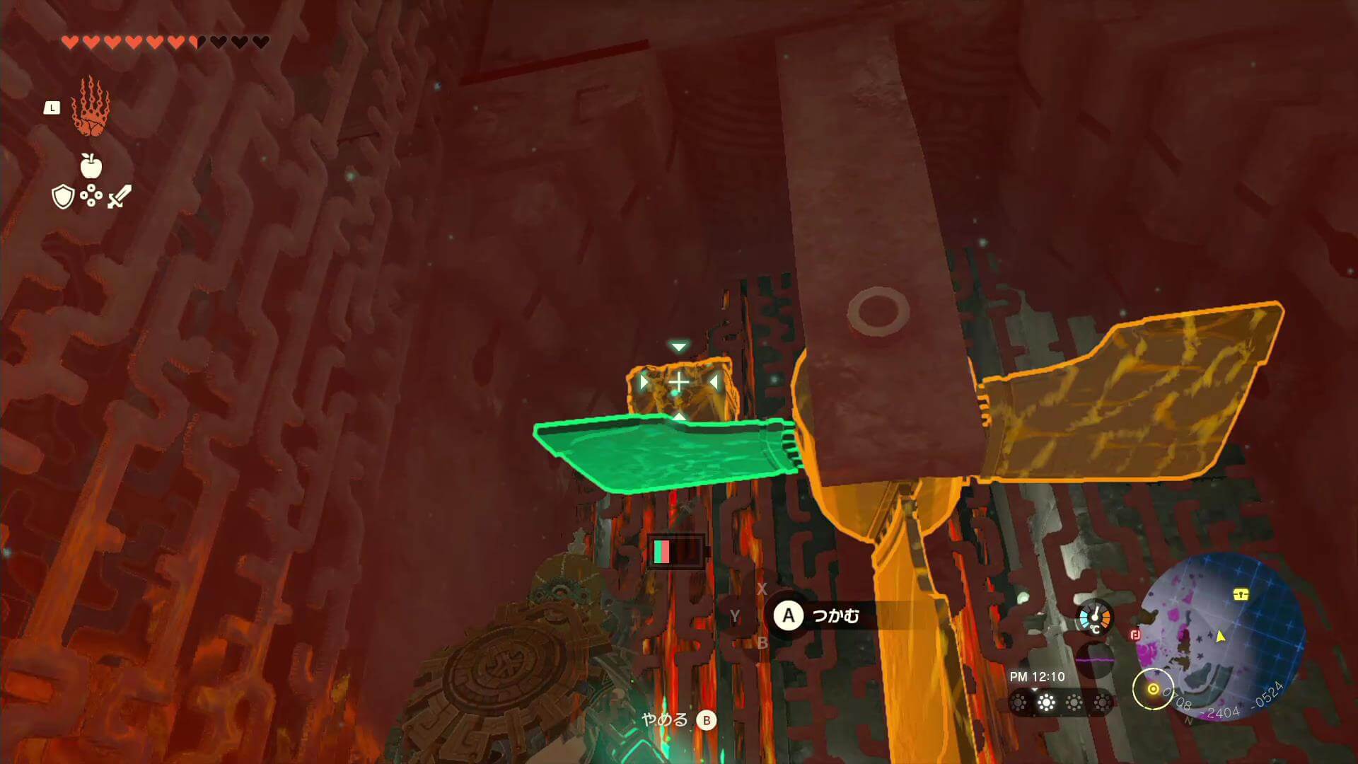 ゴーレムにパーツをくっつけたい時は、ゴーレムに乗ったままXボタンを押す。リンクのウルトラハンドではパーツをくっつけられないため、ゴーレムを強化する時は乗ってからパーツに近づこう。
