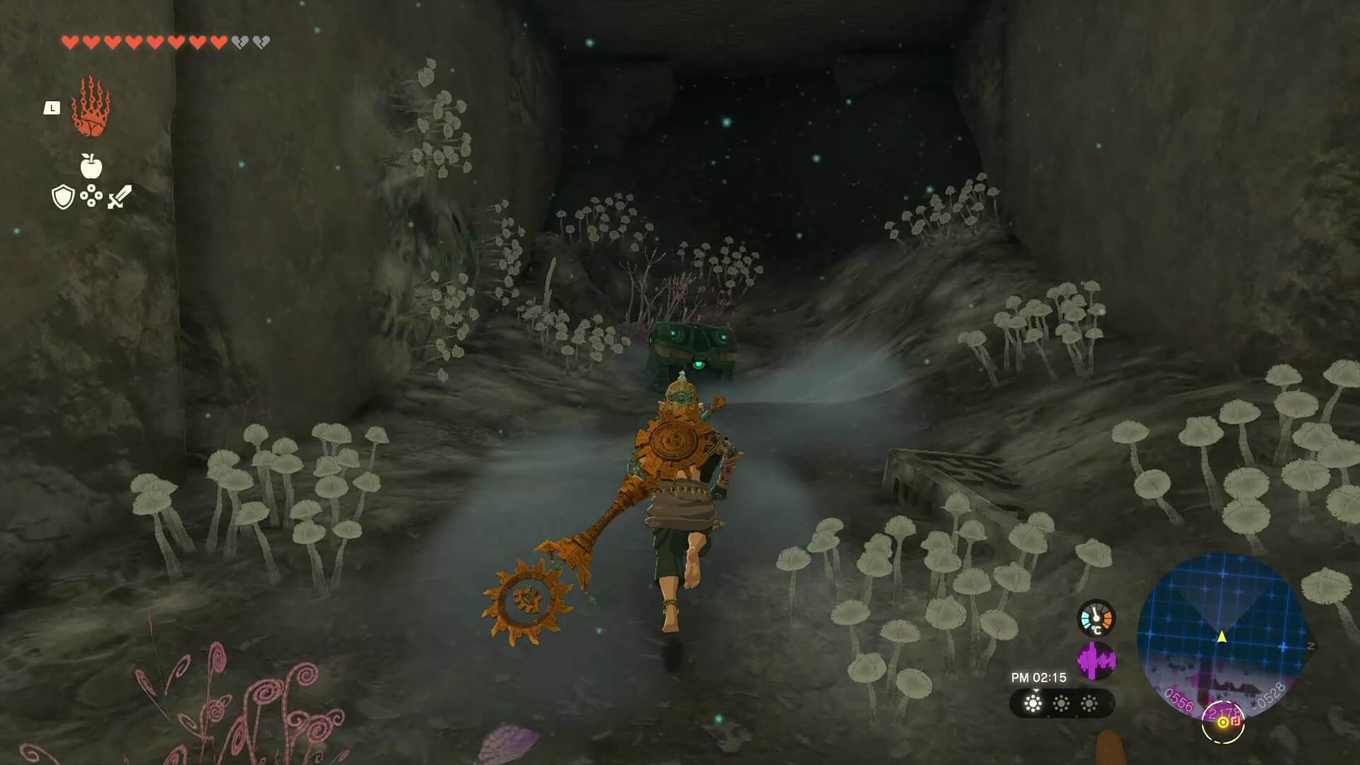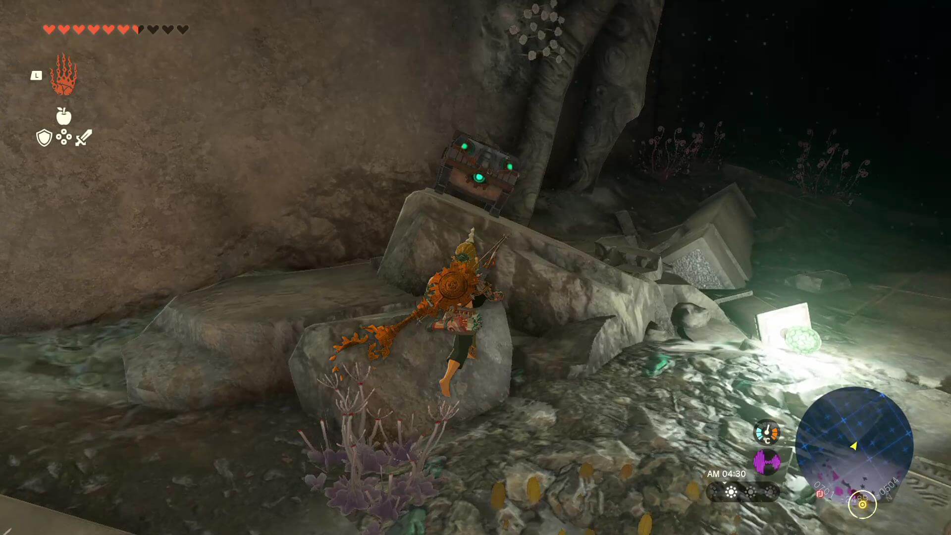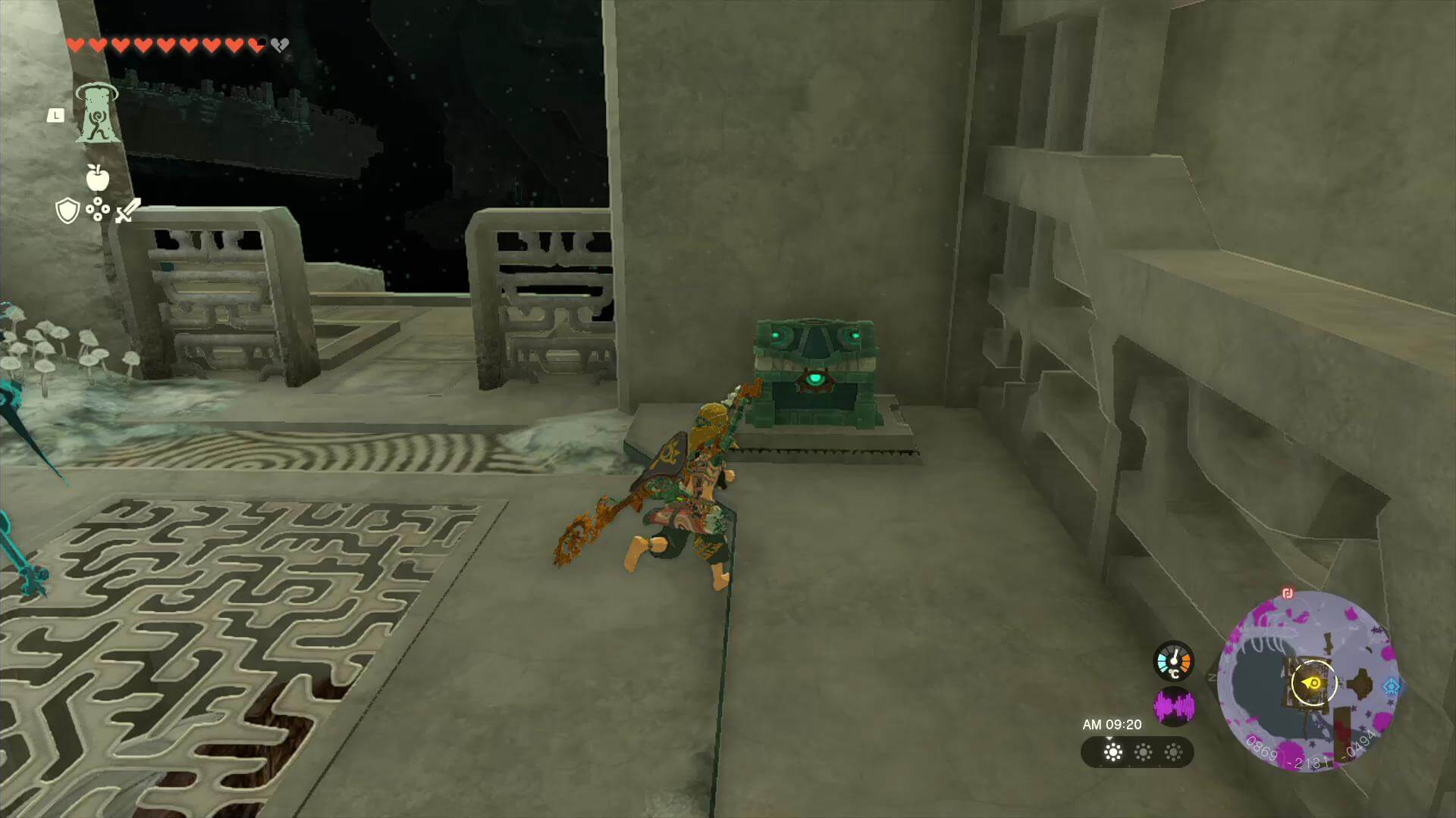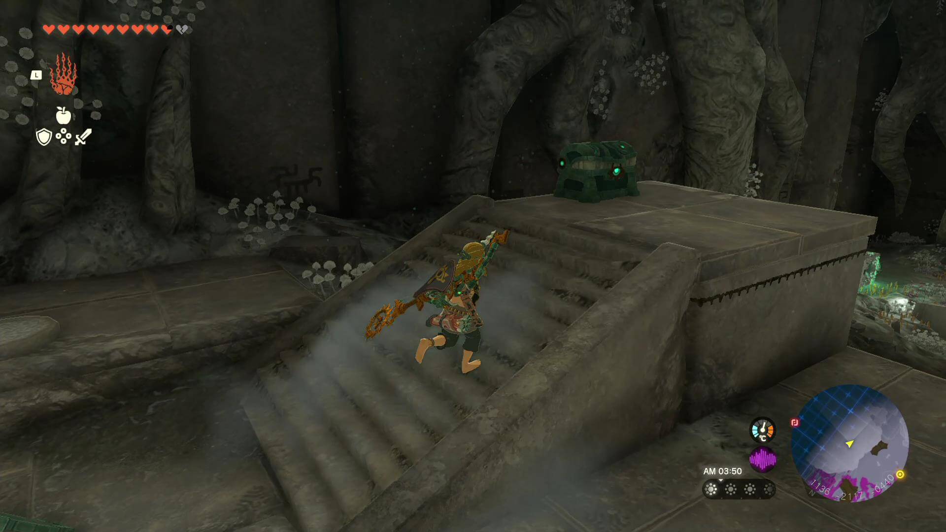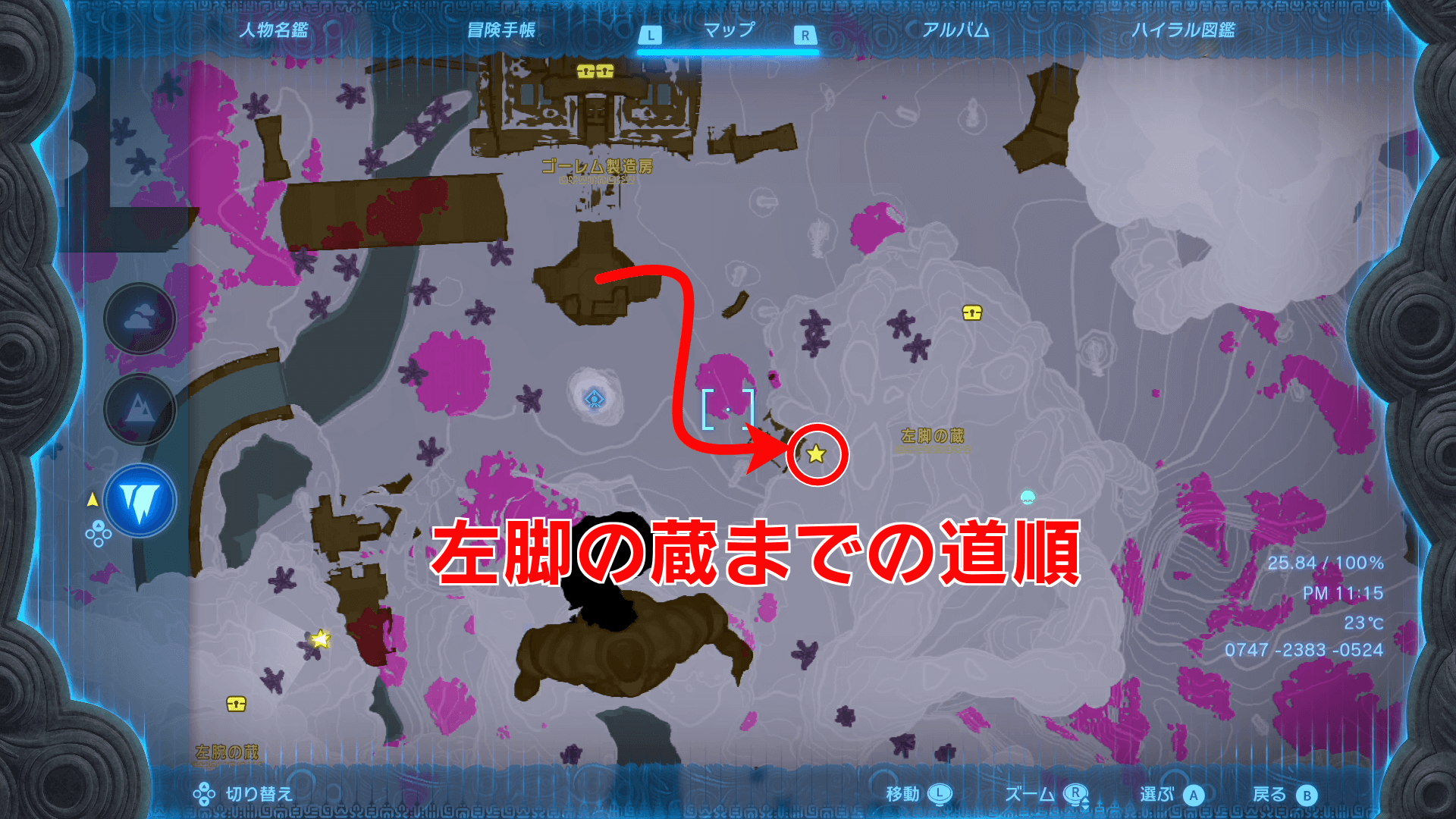 ゴーレムにパーツをくっつけたい時は、ゴーレムに乗ったままXボタンを押す。リンクのウルトラハンドではパーツをくっつけられないため、ゴーレムを強化する時は乗ってからパーツに近づこう。
