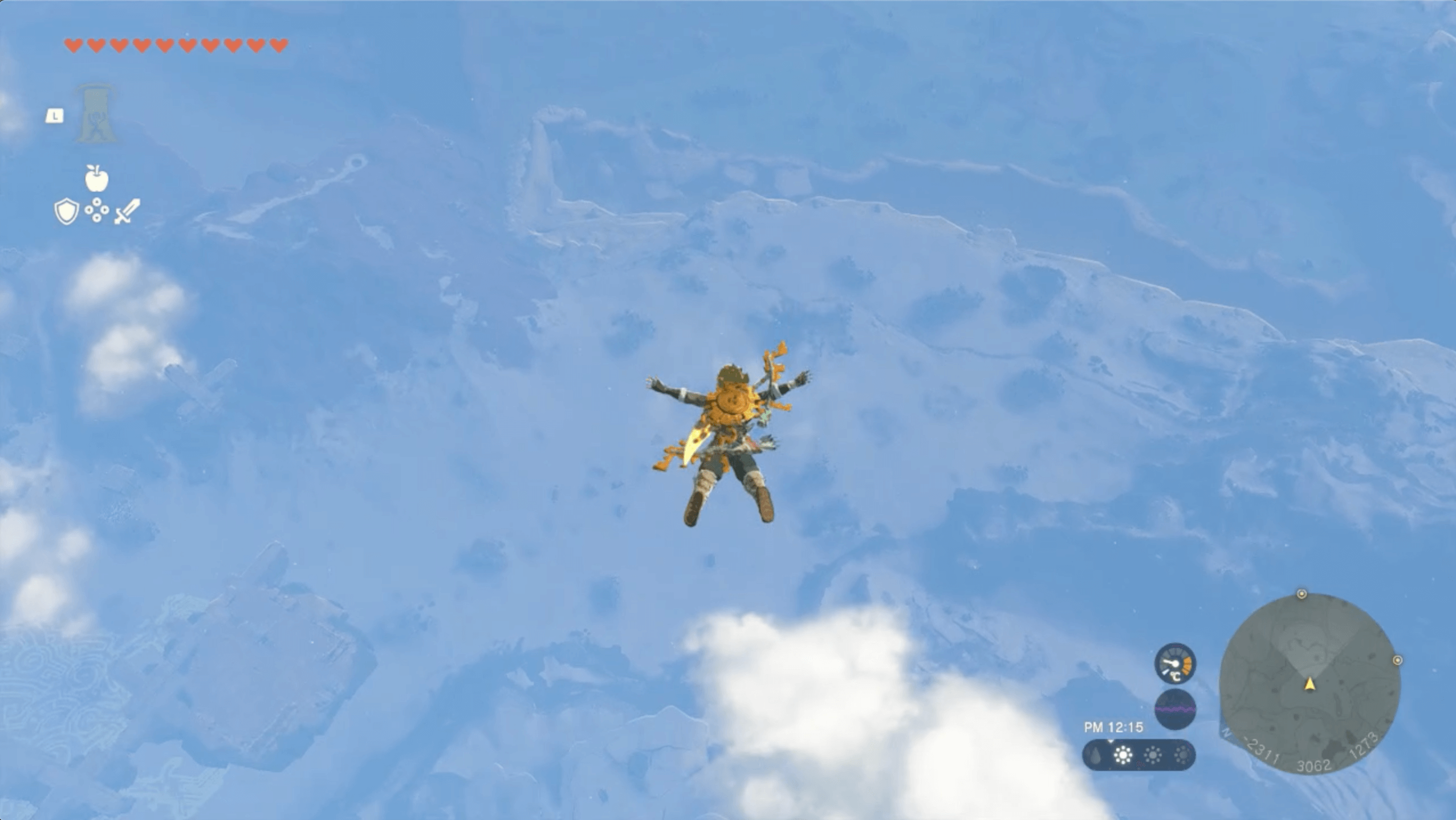 ツツキキ雪原鳥望台をジャンプしたら、まずは東ヘブラ空諸島を経由しよう。空島に着地したら、浮いている島を渡っていき、できる限り東に向かう。空島の最東端に到着したら、パラセールを使って「北ローメイ城跡」を目指そう。