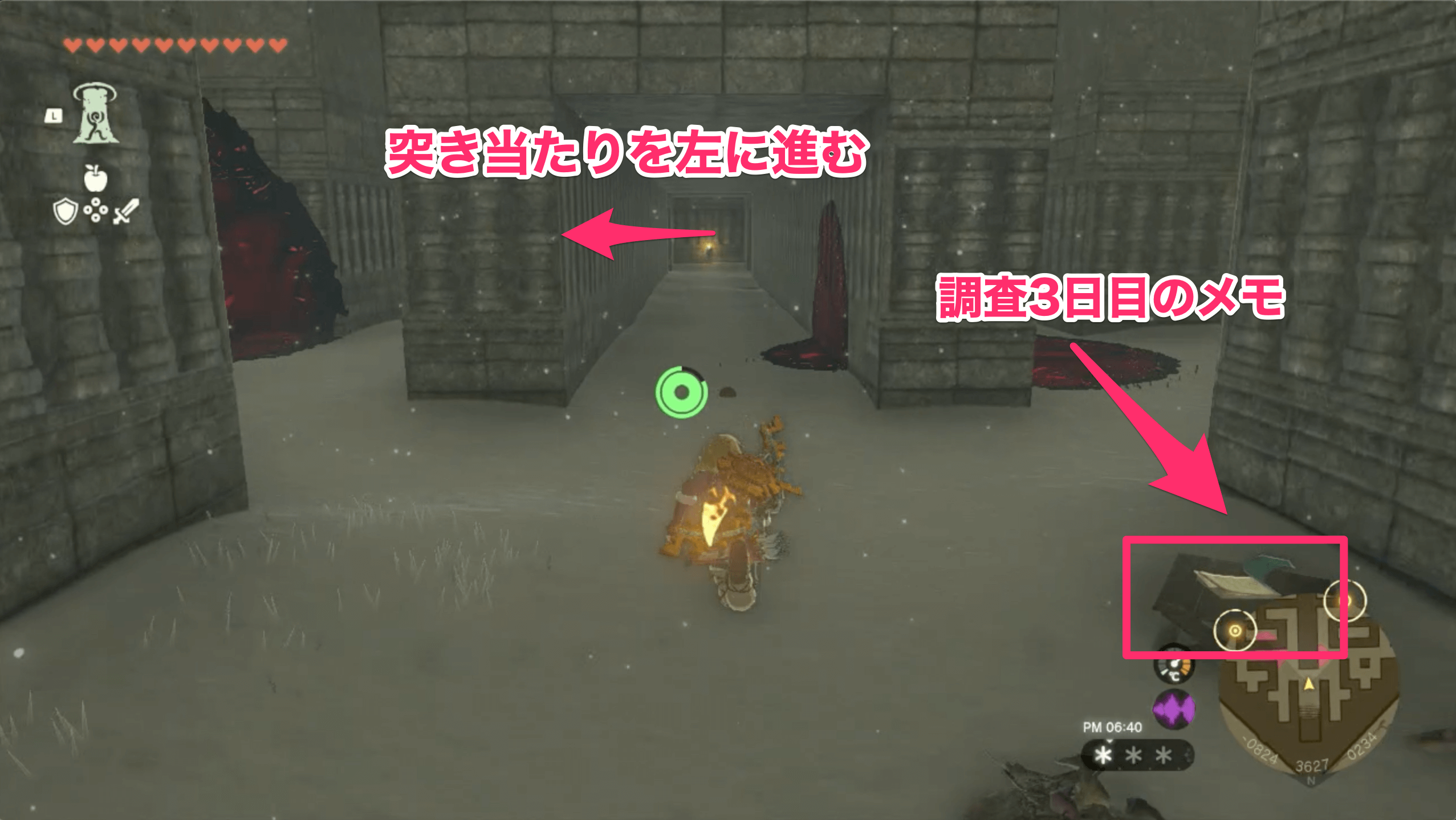 | 調査3日目のメモの左手にある通路を進み、突き当たりを左に曲がる |