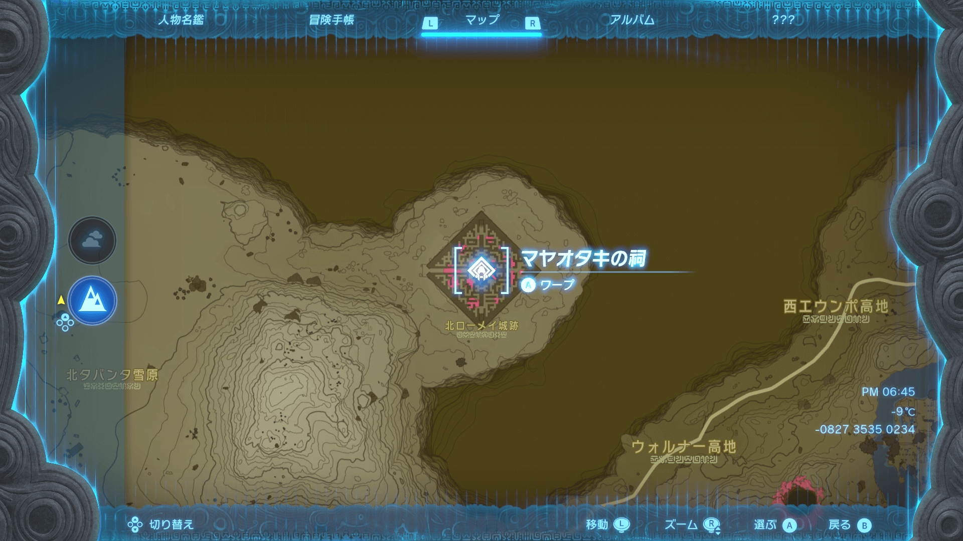 「マヤオタキの祠」は、近くにある「ツツキキ雪原鳥望台」から東にジャンプしよう。なお、ツツキキ雪原鳥望台があるエリアは、寒さガードレベルを1にしていないとダメージを受けてしまうため、防具や料理で対策しておこう。