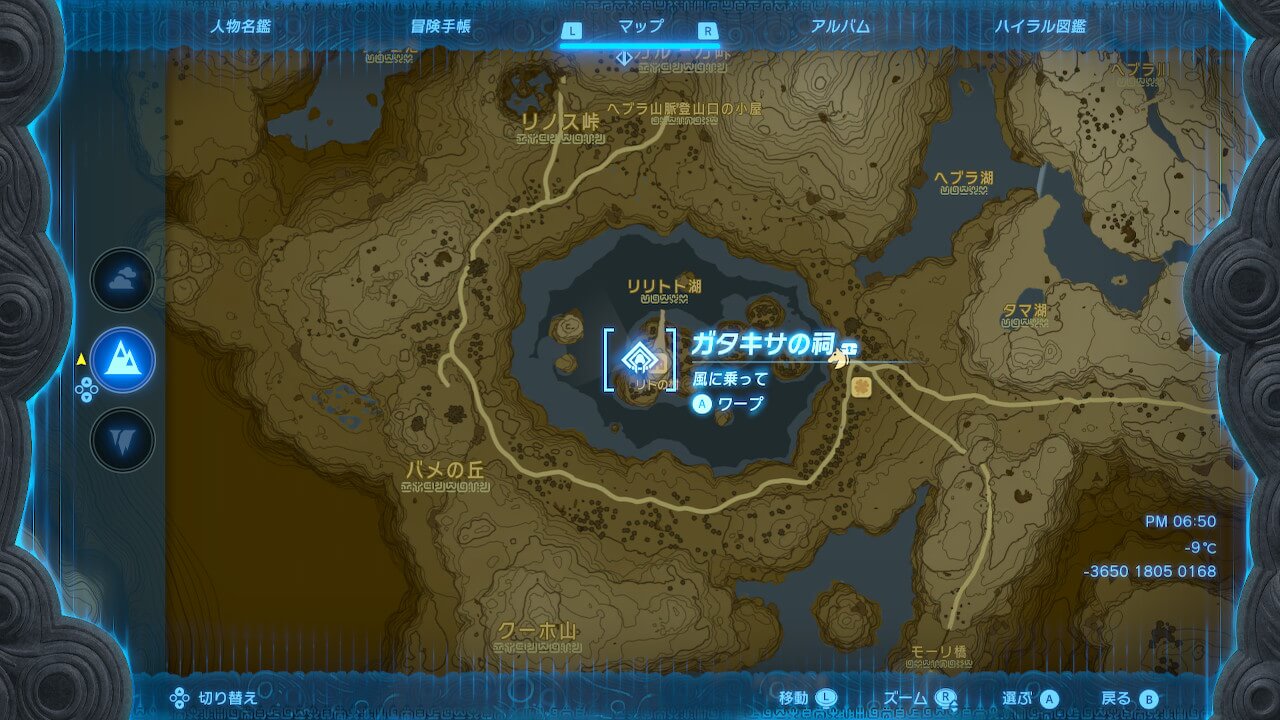 ガタキサの祠は、カルーガ岬鳥望台の南方向のリリトト湖に浮かぶ島にある。初期状態でもカルーガ岬鳥望台から直接滑空で辿り着ける距離にあるので、浮島などを経由する必要はない。