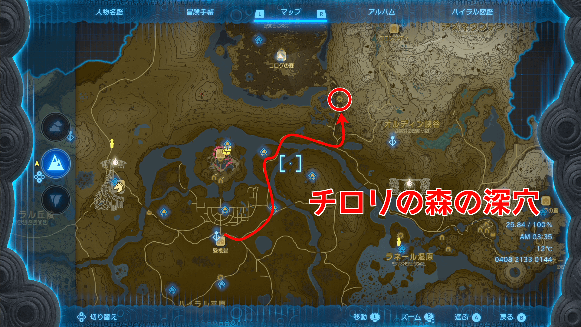 迷いの森は、地上からは入れない。パラセールで空からの侵入ももちろん、正面の入り口から入っても戻されてしまう。そのため、近くにある「チロリの森の深穴」から地底世界に行き、トーレルーフを使って迷いの森に入ろう。