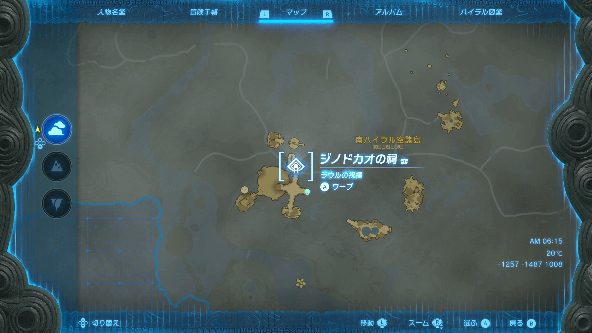 ジノドカオの祠は、南ハイラル空諸島にある。そのため、最も近いハイラル平原鳥望台から跳躍して向かうのがおすすめだ。しかし、祠のある浮島は高度が高く、距離も遠いので鳥望台から直接は届かない。まずは最も近い浮島へ向かおう。