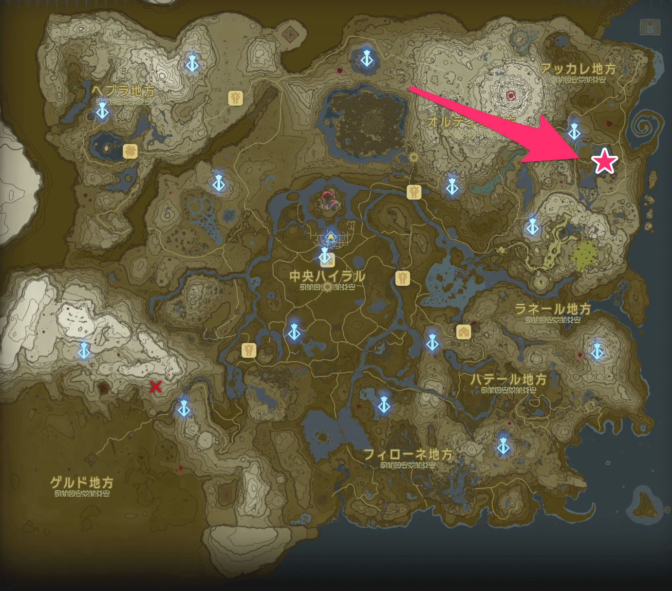 | 南東に飛んで、「ラシタキワカの祠」を目指す └すでに開放していたら、ここからスタートしよう |