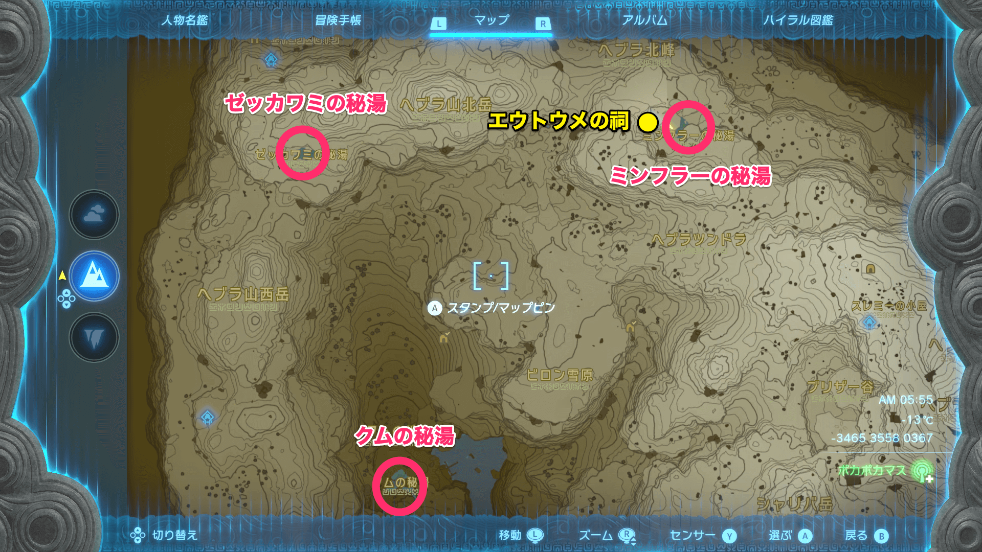 ポカポカマスは、ヘブラ地方にある秘湯で入手できる。3箇所全ての秘湯でポカポカマスを入手できるが、おすすめはエウトウメの祠のすぐ近くにあるミンフラーの秘湯だ。