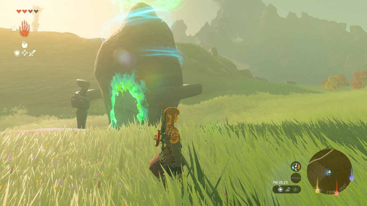 鳥望台から跳躍したら、「ヒガッカレ平原の深穴」を目印に北東へ進もう。高度が下がってくると深穴の側にある祠も見えてくるので、パラセールで位置を調整しつつ着地すれば、シナタニカカの祠にたどり着ける。
