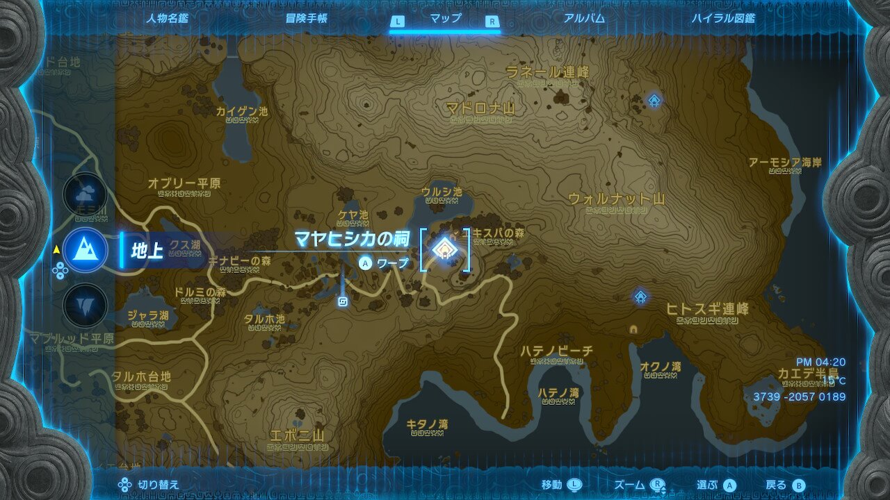 マヤヒシカの祠は、洞窟内にある。そのため、上空や外部からの発見が難しいので、まずはハテノ村を目標に付近へ向かおう。ハテノ村に到着したらマップを拡大してハテノ牧場を目指して北東方向に進むと良い。