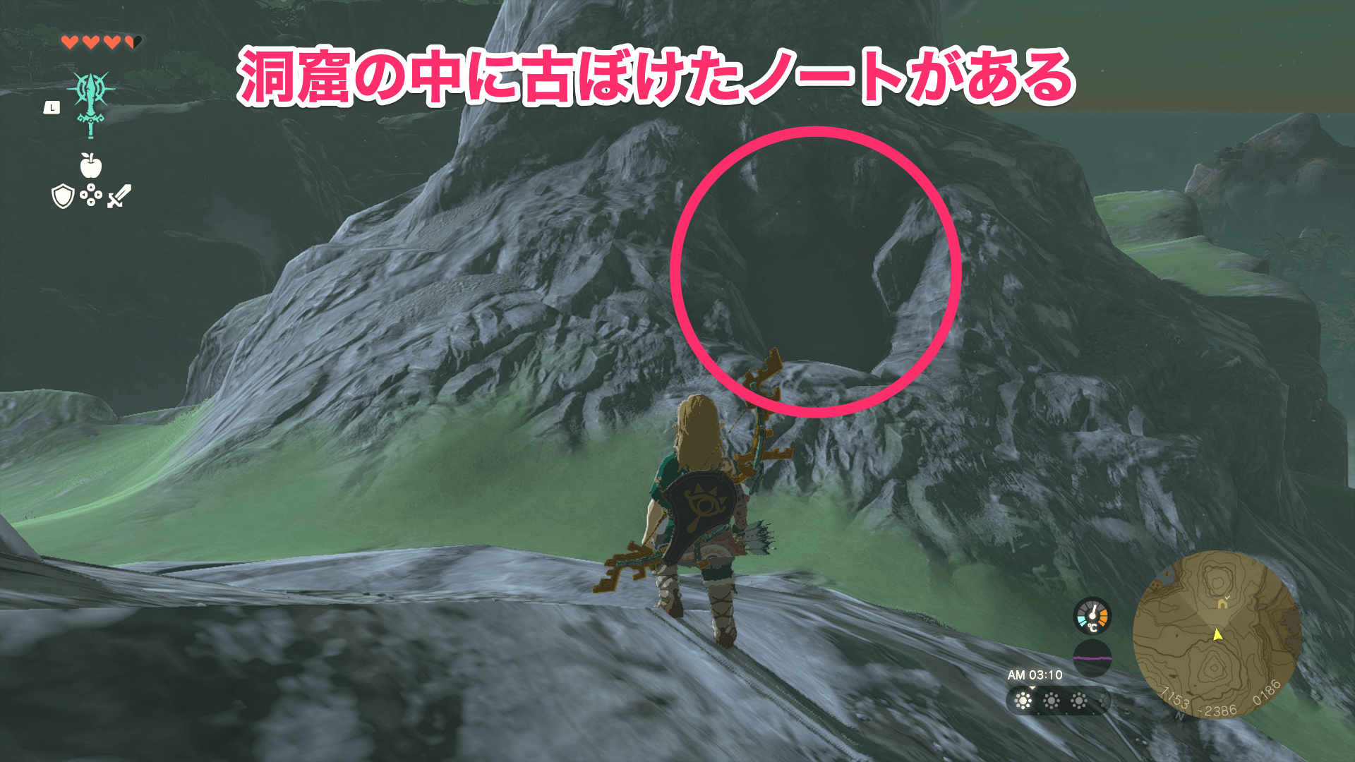 ビトゥオ谷に着地したら、ピンの周辺を探索して洞窟の入り口を見つけて入ろう。洞窟に入ってしばらく進むと、チャレンジの開始条件である「古ぼけたノート」が見えてくる。