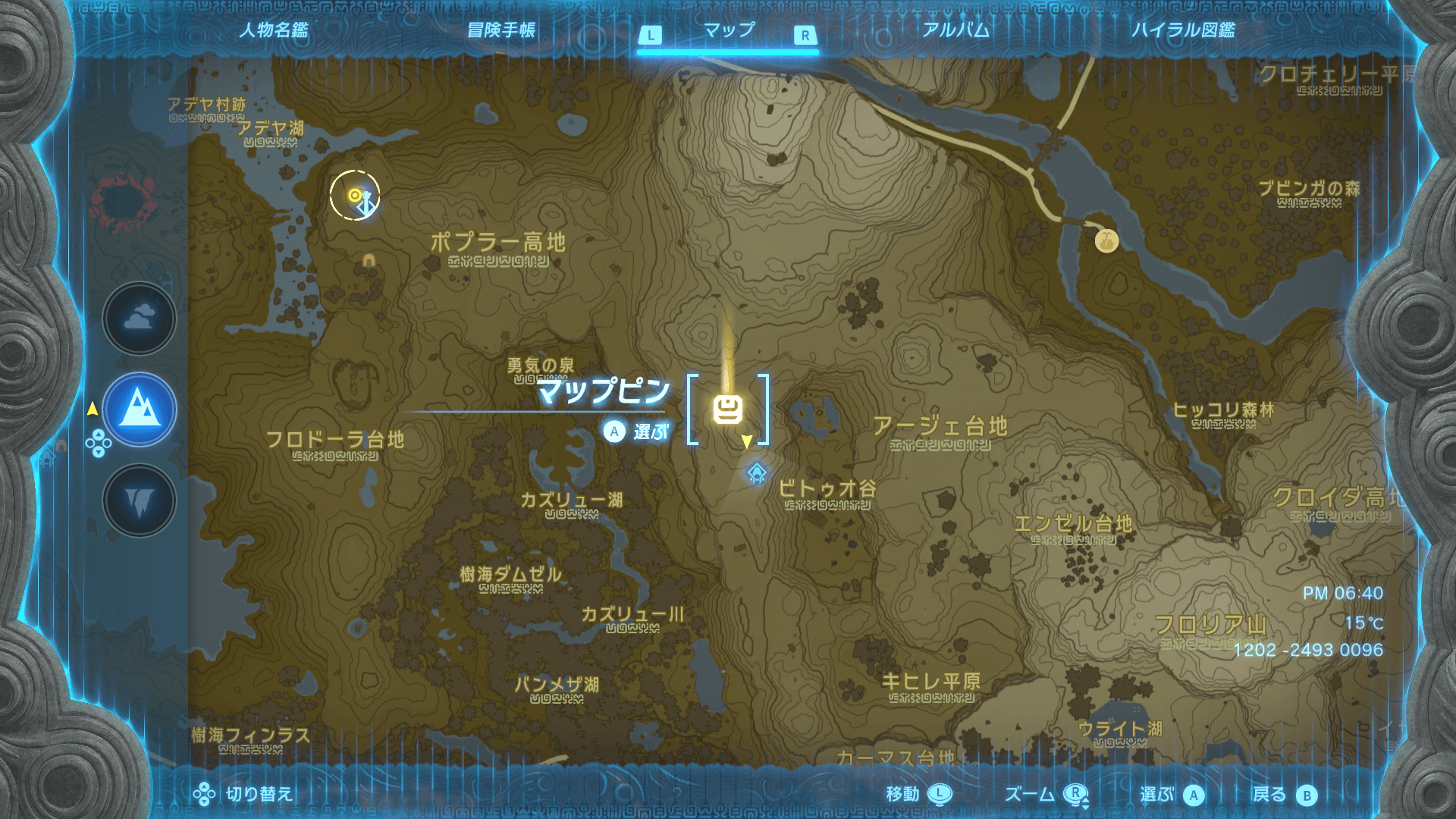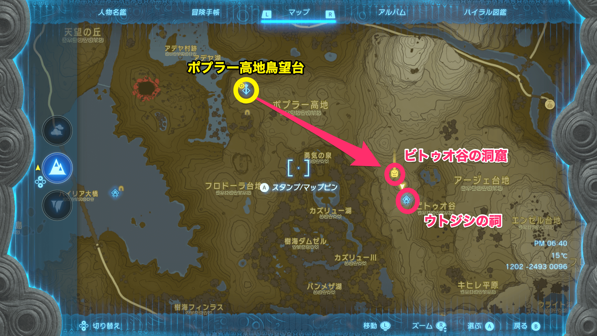 槍投げの言い伝えの受注場所へ行くために、まず「ビトゥオ谷の洞窟」の位置にピンを打とう。洞窟はポプラー高地鳥望台の南東、カズリュー湖の東の山肌にある。