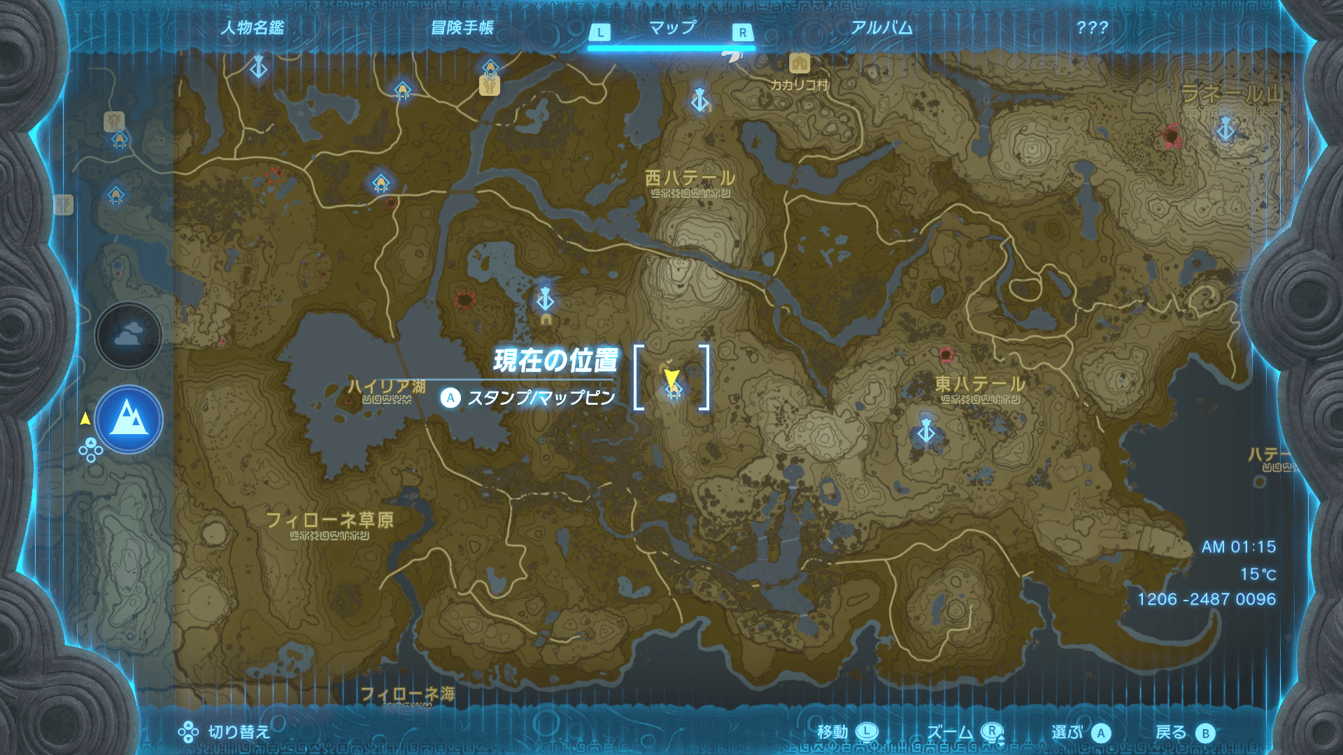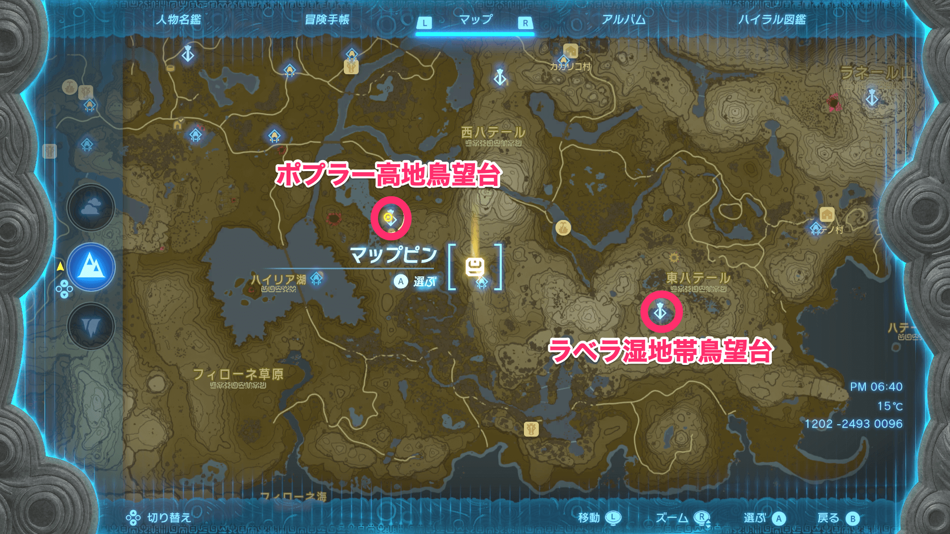 ピンを打ったら、ポプラー高地から跳躍して南東へ進もう。がんばりゲージが無くなったら着地して、ピンを目指して進むと洞窟の入り口が見えてくる。