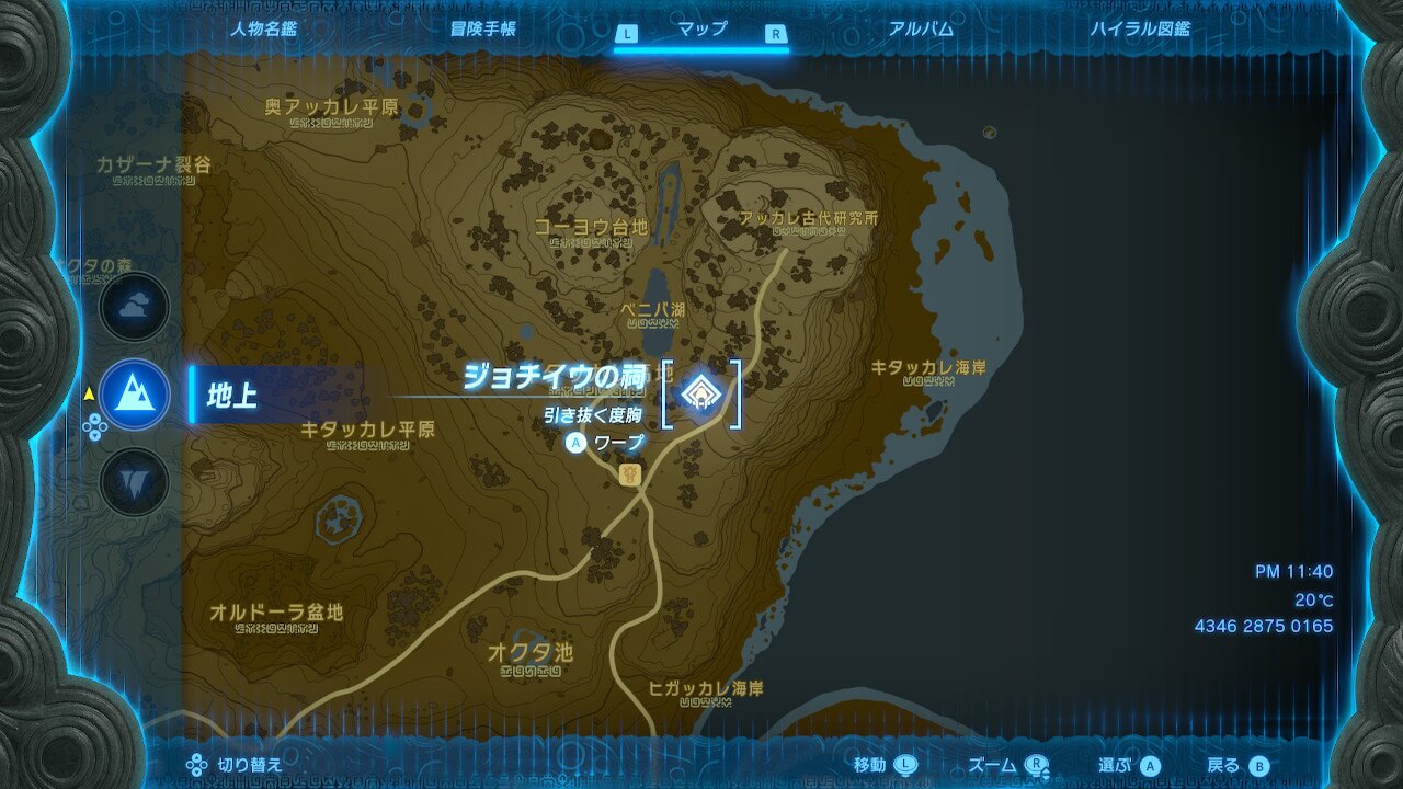 ジョチイウの祠は、マップ右上に表示される、アッカレ地方の半島にある。基本的に開けた地形のため、ウルリ山鳥望台から北東方向へ進めば迷わずに到達しやすい。