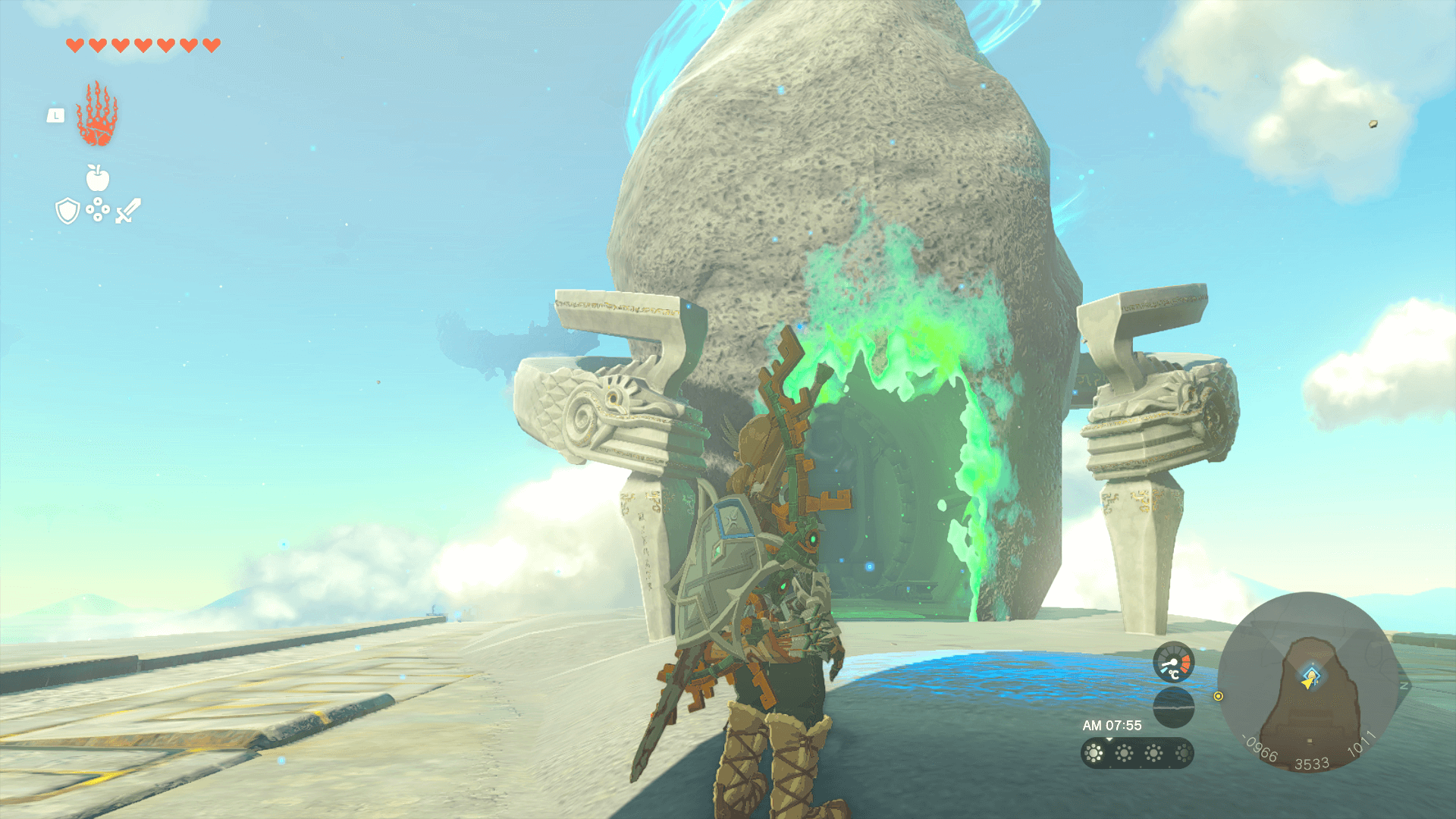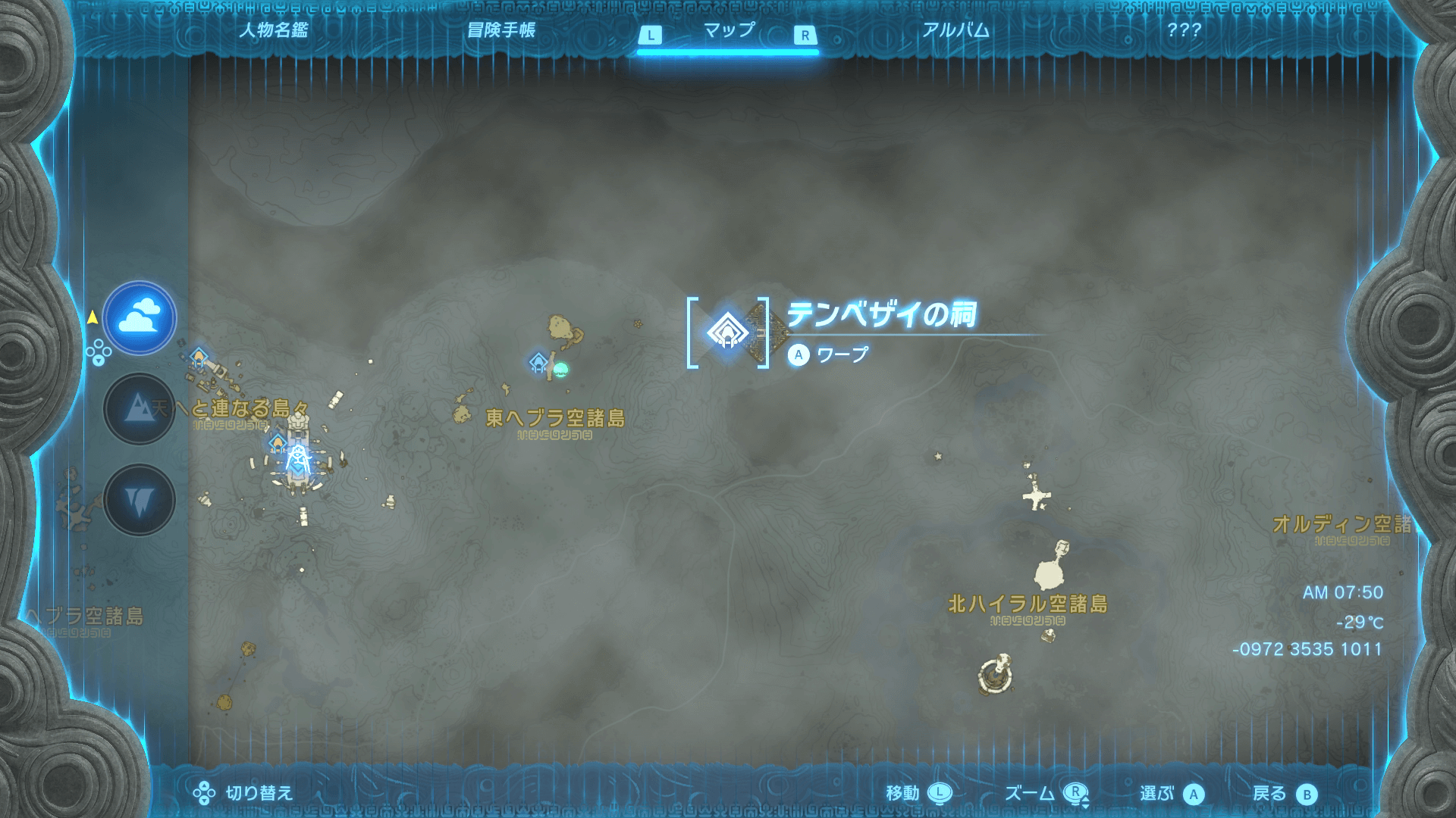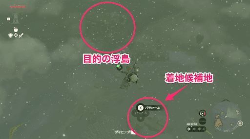 初期状態でテンベザイの祠へ向かうためには、東へブラ空諸島の浮島を経由する必要がある。目的は最も大きな浮島だが、直接向かうには距離があるため、付近の浮島に着地してから浮遊する足場とゾナウギアを利用して進もう。