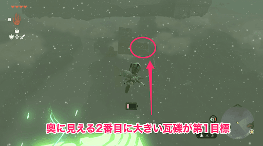 初期状態の場合、扇風機を4回起動させると足場の耐久に限界が来る。点滅の速度で消滅するタイミングを測れるので、ギリギリまで飛距離を稼いでからパラセールを開いて瓦礫に向かおう。第一目標は上から2番目にある瓦礫だが、届かない場合は他の瓦礫に着地しても問題ない。