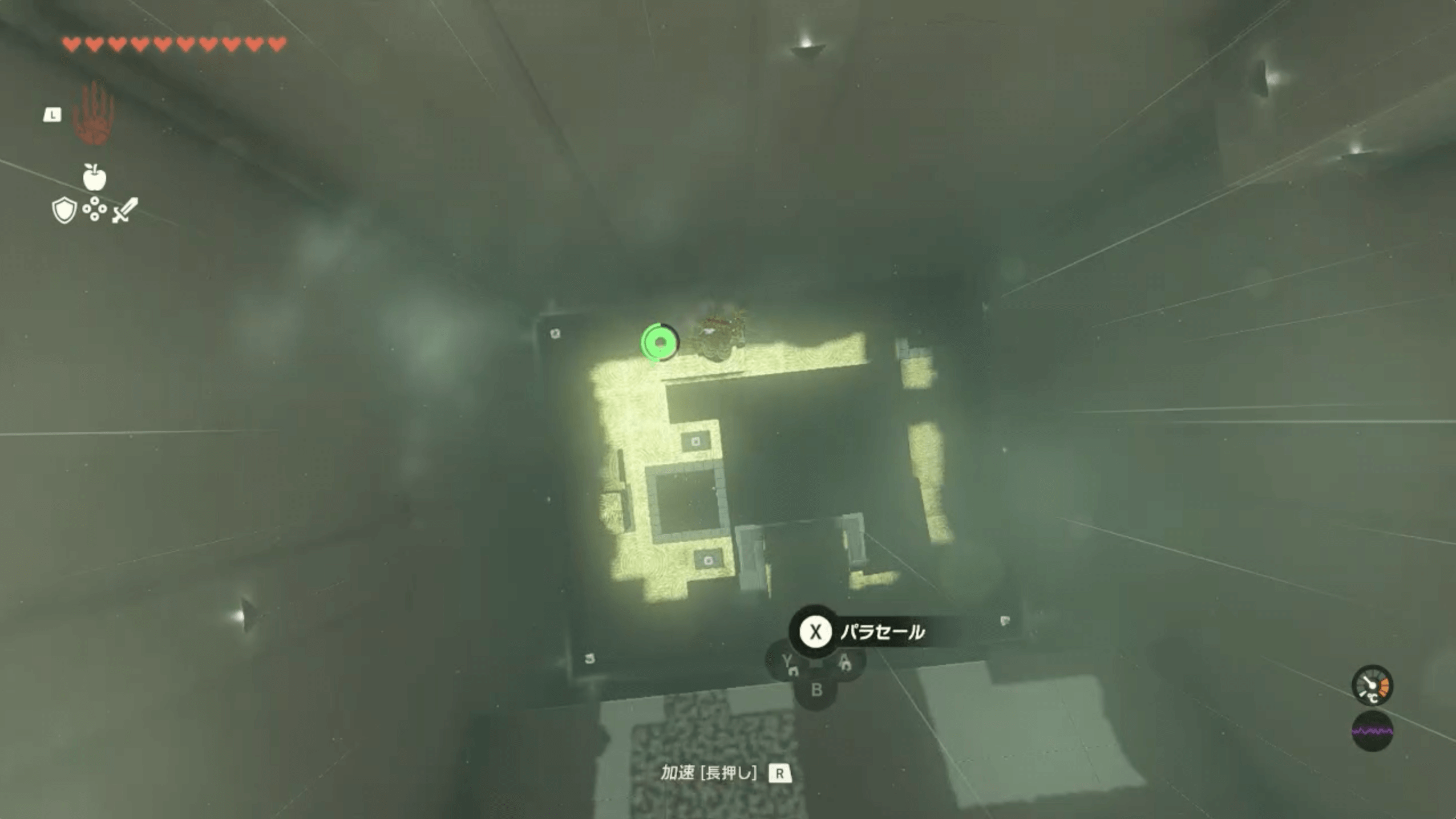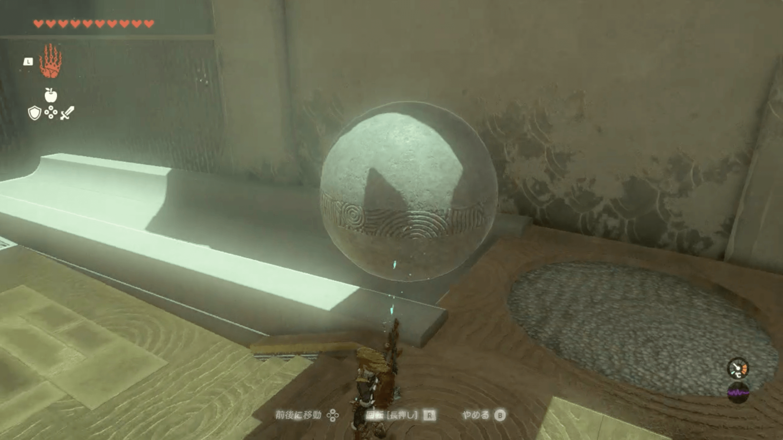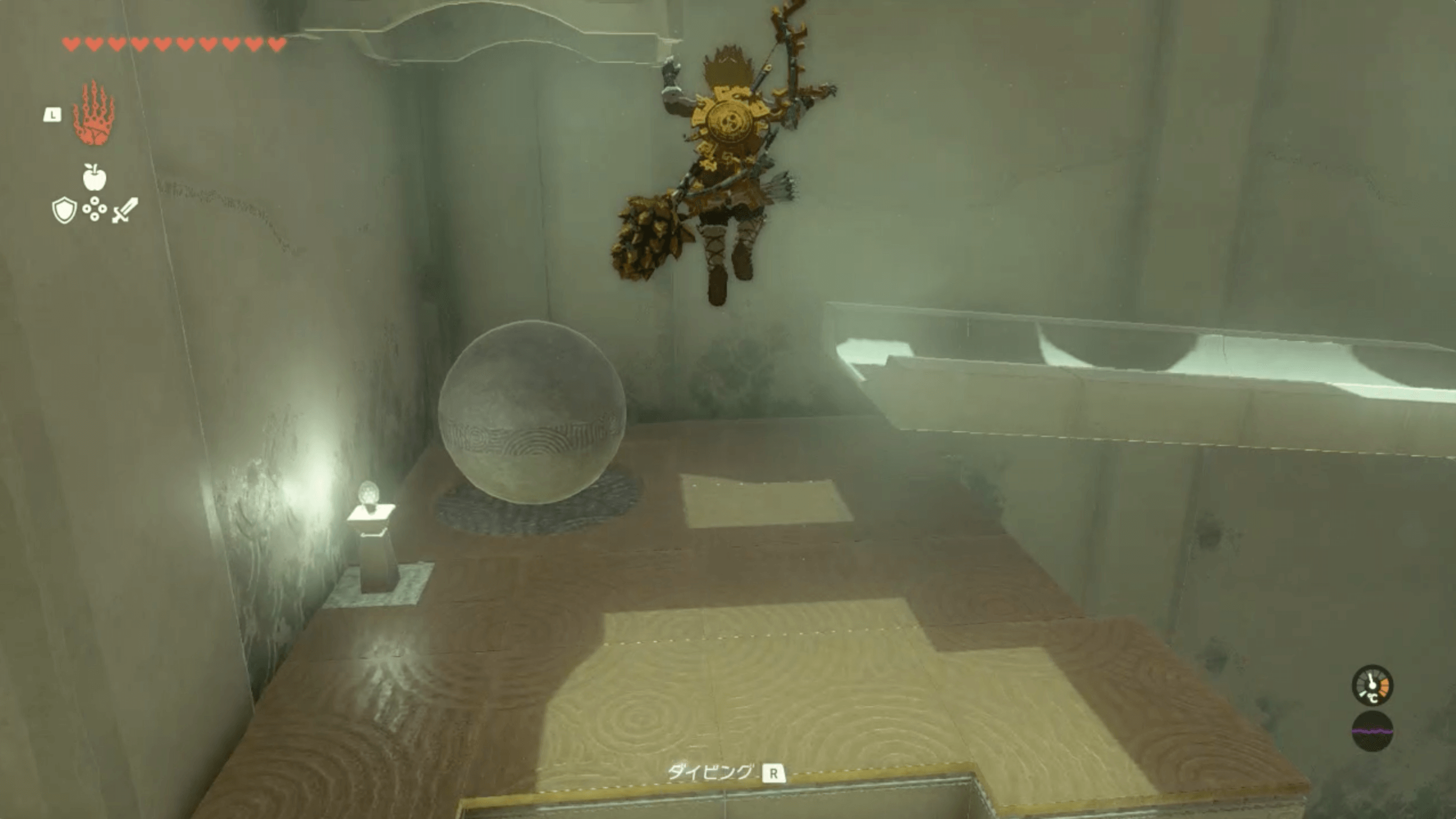 ジャンプ台で最上部まで移動して、大きな球を転がしたら、ダイビングで飛び降りてパラセールで着地しよう。通常通り飛び降りると球より下に到着できず、棒を攻撃してスイッチを押せる位置に移動させられない。事前に、飛び降りる位置を確認して一気に飛び降りよう。
