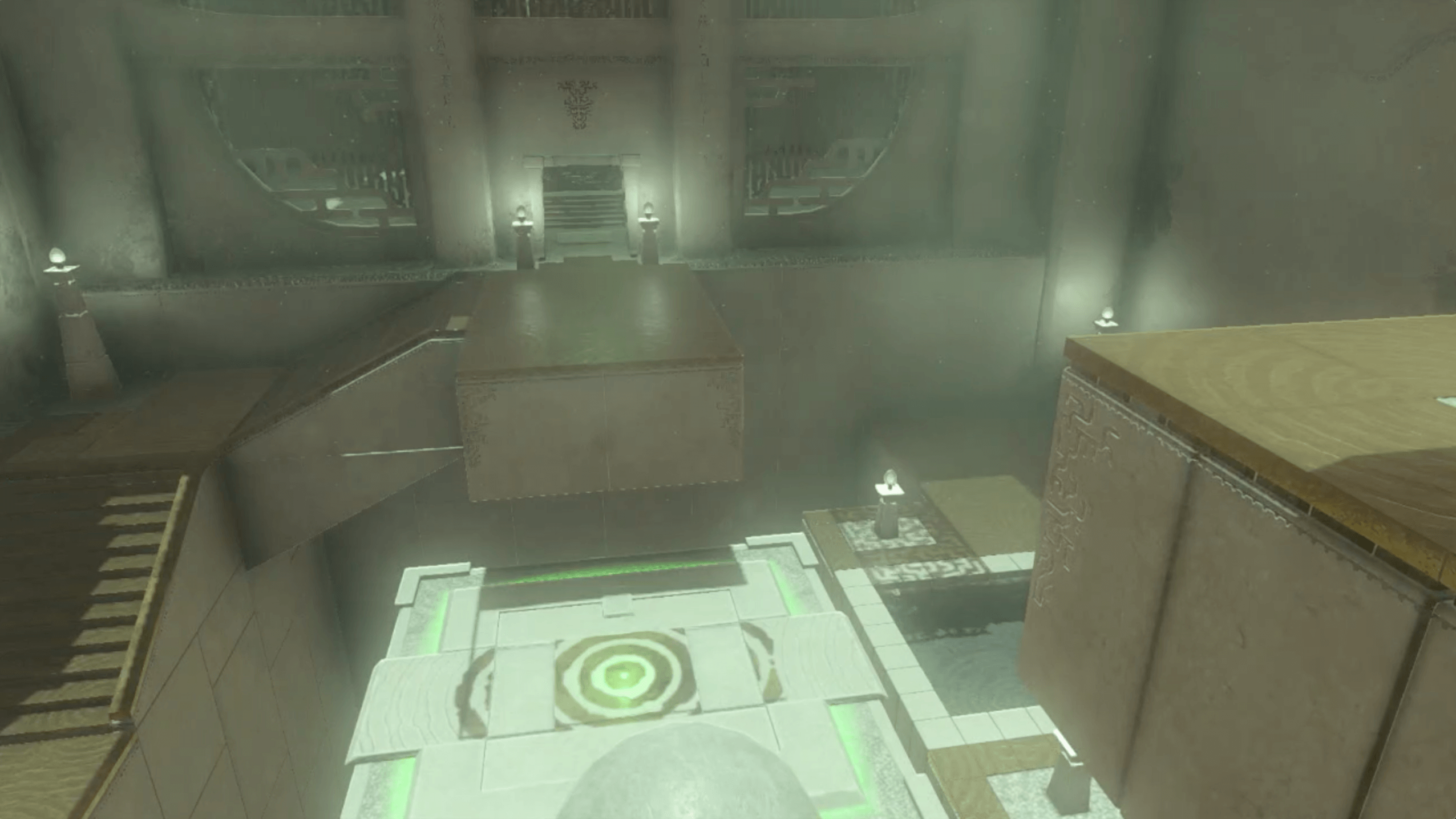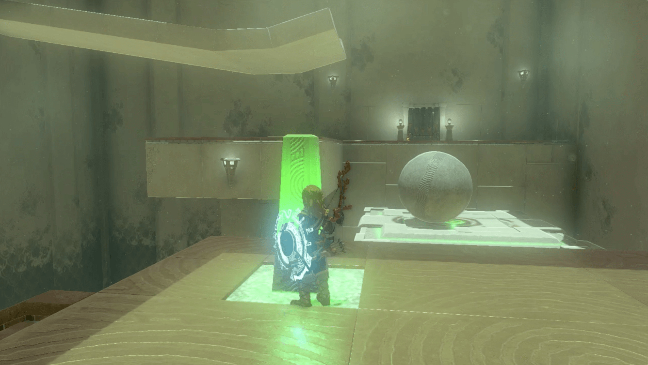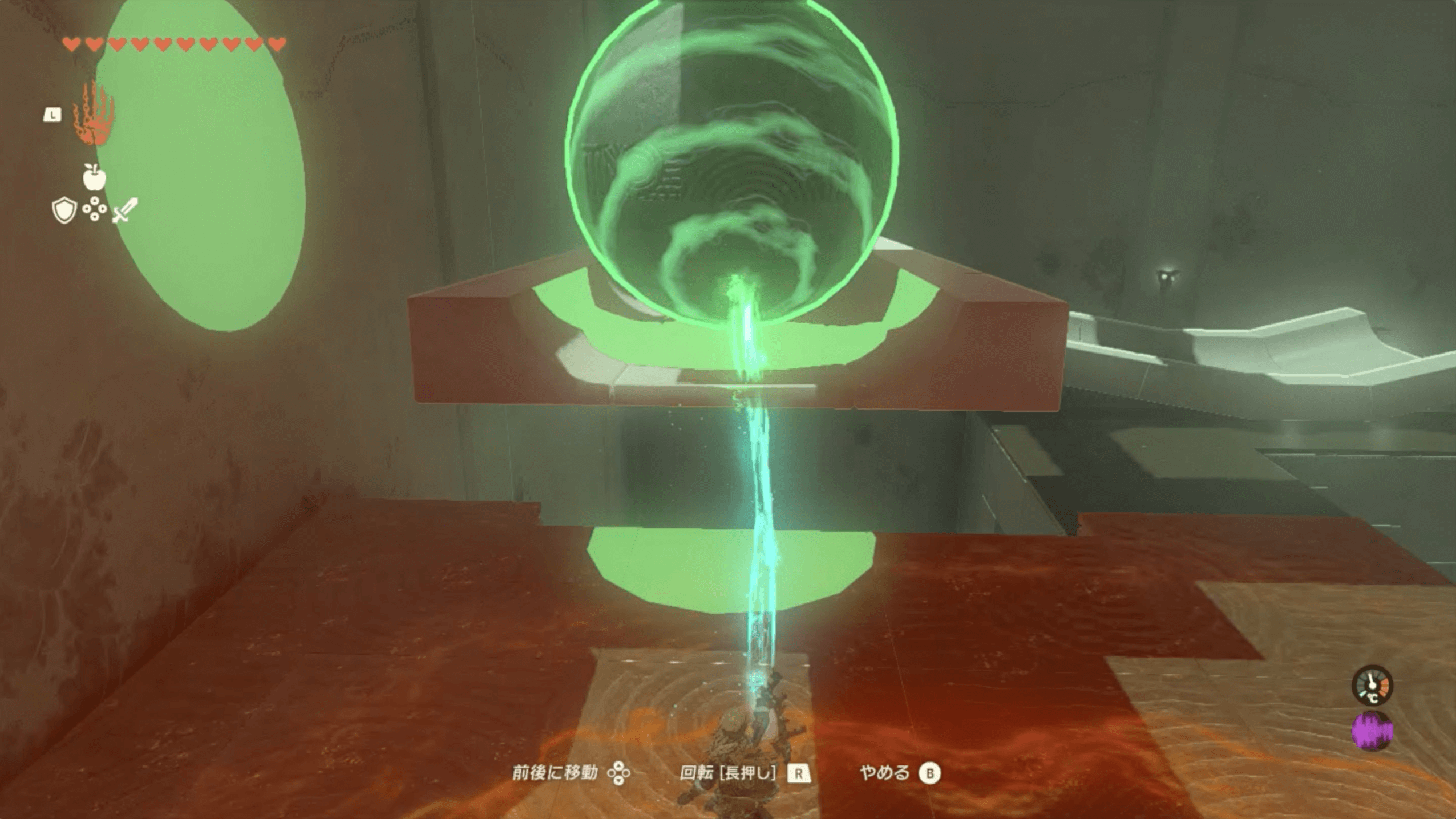 ジャンプ台で最上部まで移動して、大きな球を転がしたら、ダイビングで飛び降りてパラセールで着地しよう。通常通り飛び降りると球より下に到着できず、棒を攻撃してスイッチを押せる位置に移動させられない。事前に、飛び降りる位置を確認して一気に飛び降りよう。