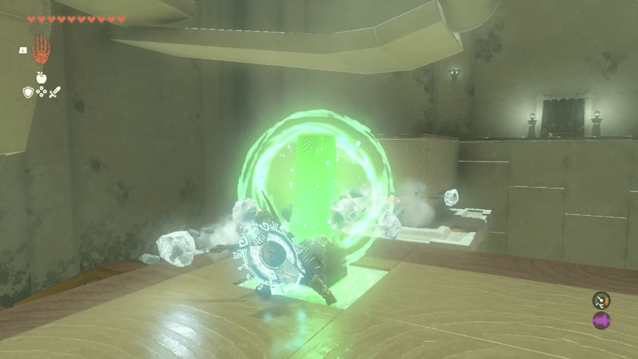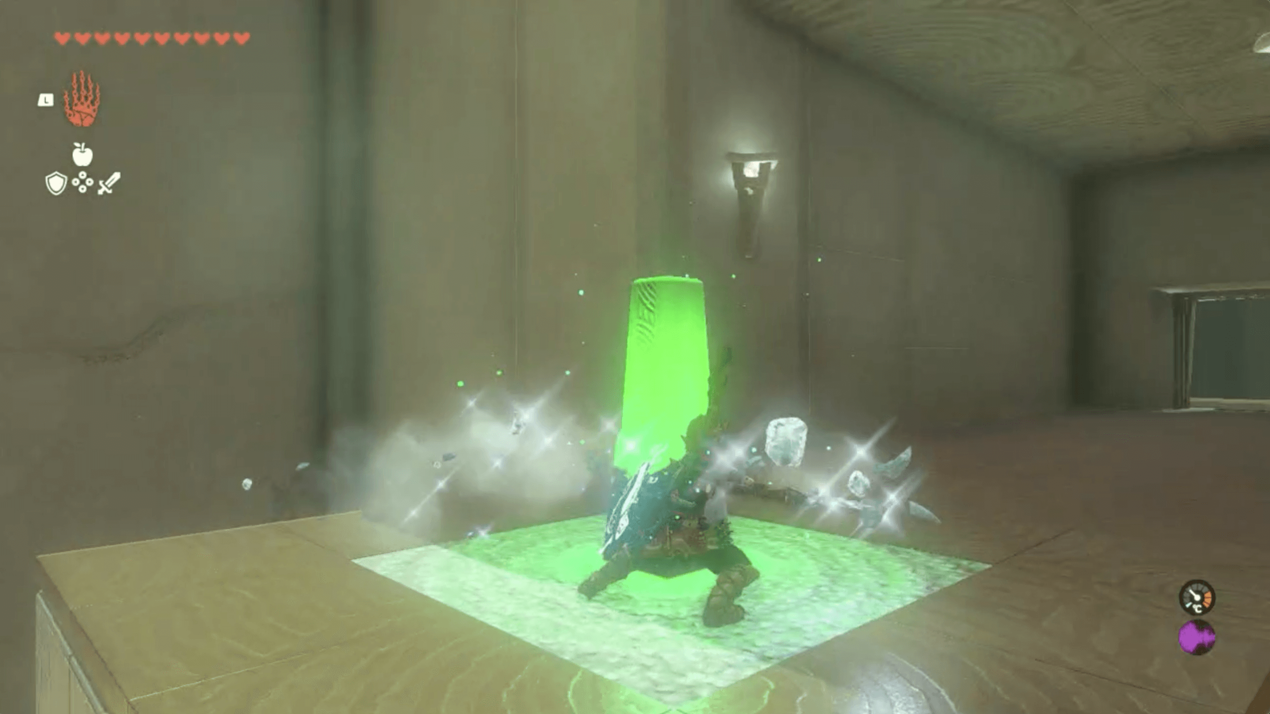 「マヤココの祠」の宝箱は、2つ目のエリアに入った場所で左上を向くとロープで吊るされている。そのため、矢を放ってロープを切ると下に落として回収できる。しかし、宝箱は左右に激しく揺れているので、矢に「キースの目玉」を付けて確実に当たるようにすると良い。