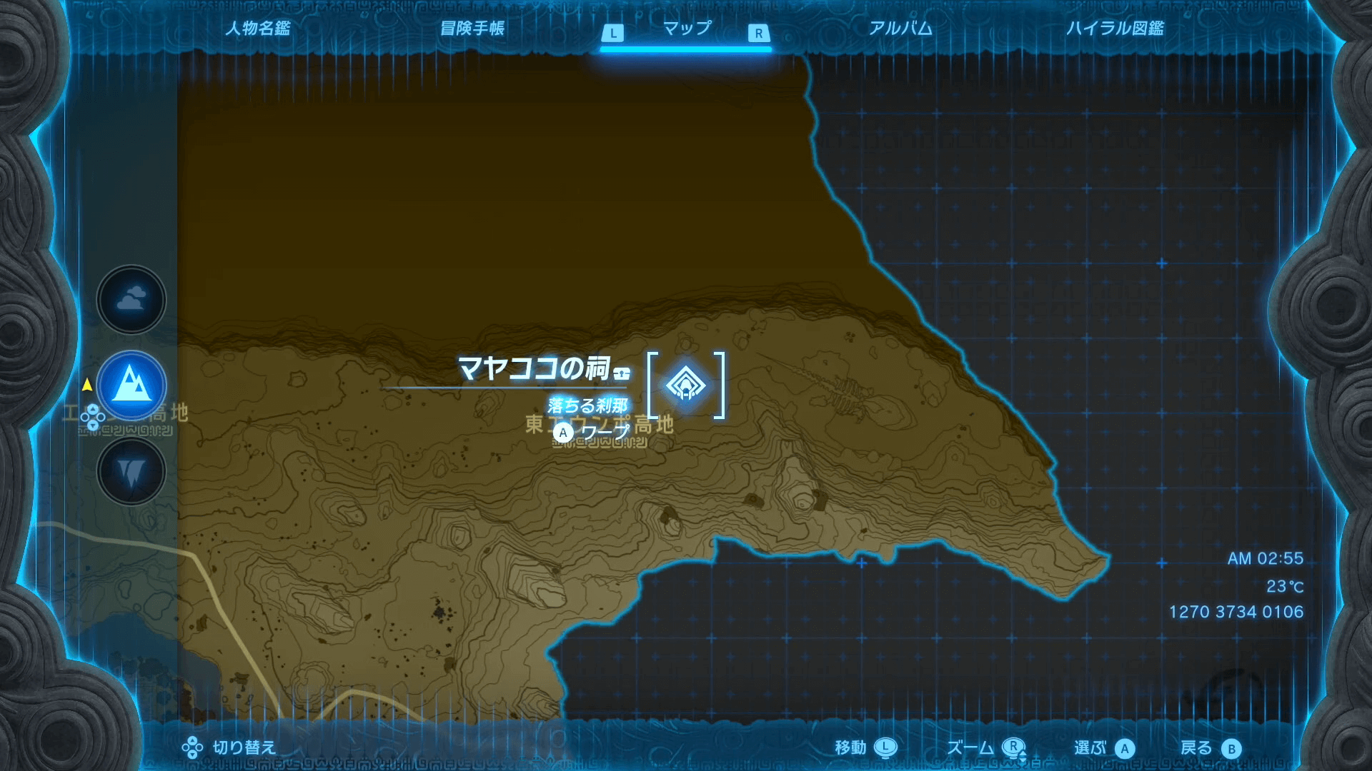 「マヤココの祠」は、近くの「ドイブラン遺跡鳥望台」から北東へ飛ぶと最短で行ける。北東へ飛んだら、こまめにマップを開いて「東エウンポ高地」の場所を確認しておこう。巨大な骨が見えてきたら、「マヤココの祠」も見つけられる。