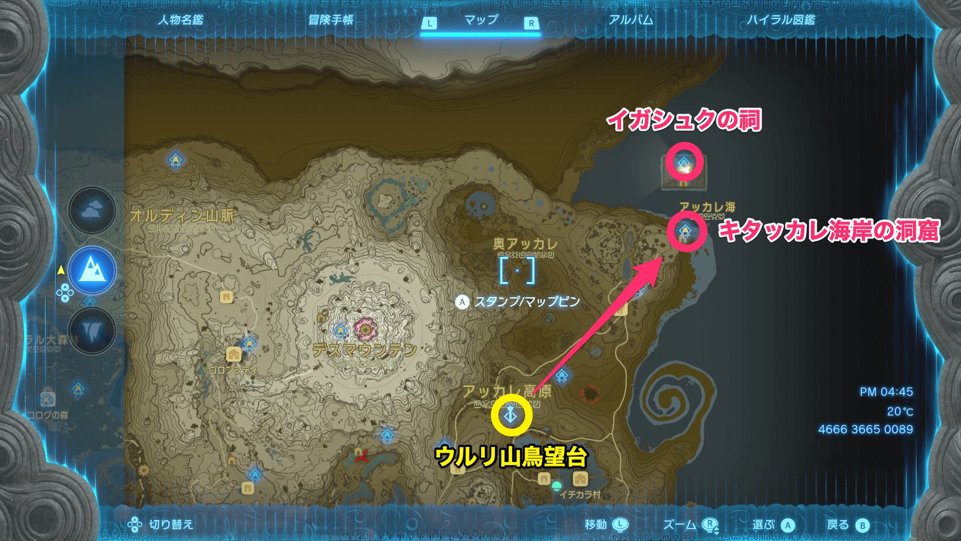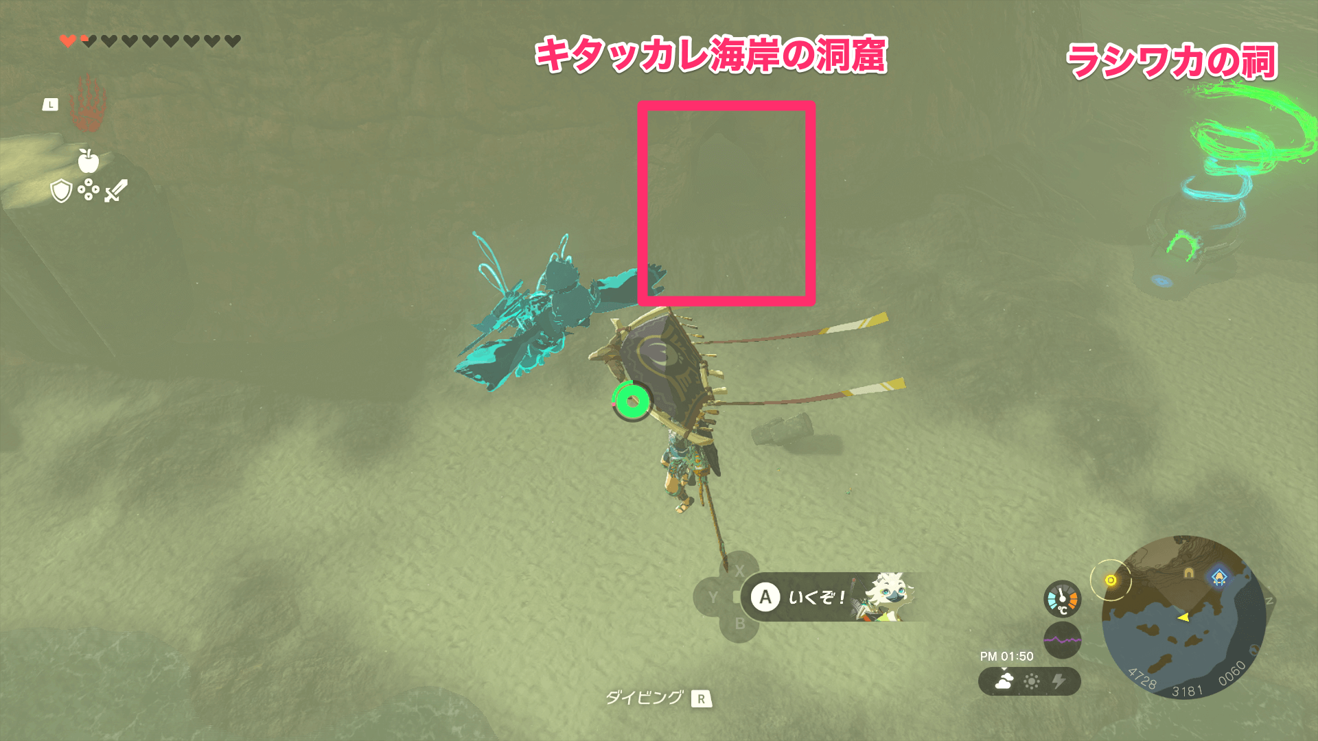イガシュクの祠がある「ローメイ島」は、キタッカレ海岸の洞窟から進入できる。鳥望台からアッカレ古代研究所まで飛んだら、崖から飛び降りて洞窟の入り口を探そう。なお、洞窟の側にはラシワカの祠があるので、ついでに立ち寄っておくと良い。
