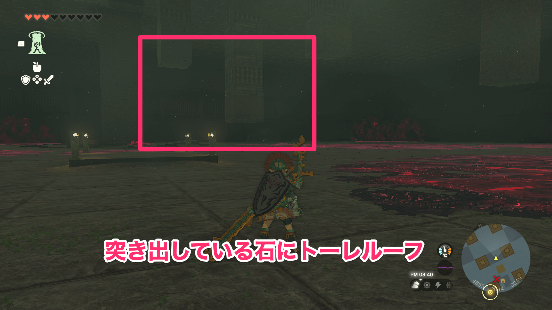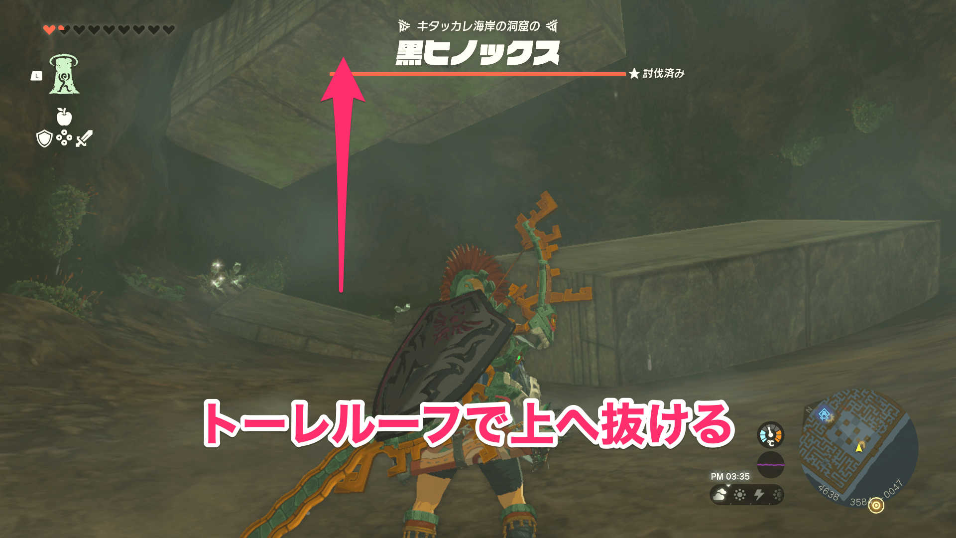 ローメイ島の地下には瘴気の手が出現するが、祠へ行くだけなら倒す必要は無い。倒したい場合は、バクダン花を矢で飛ばしてまとめてダメージを与えよう。