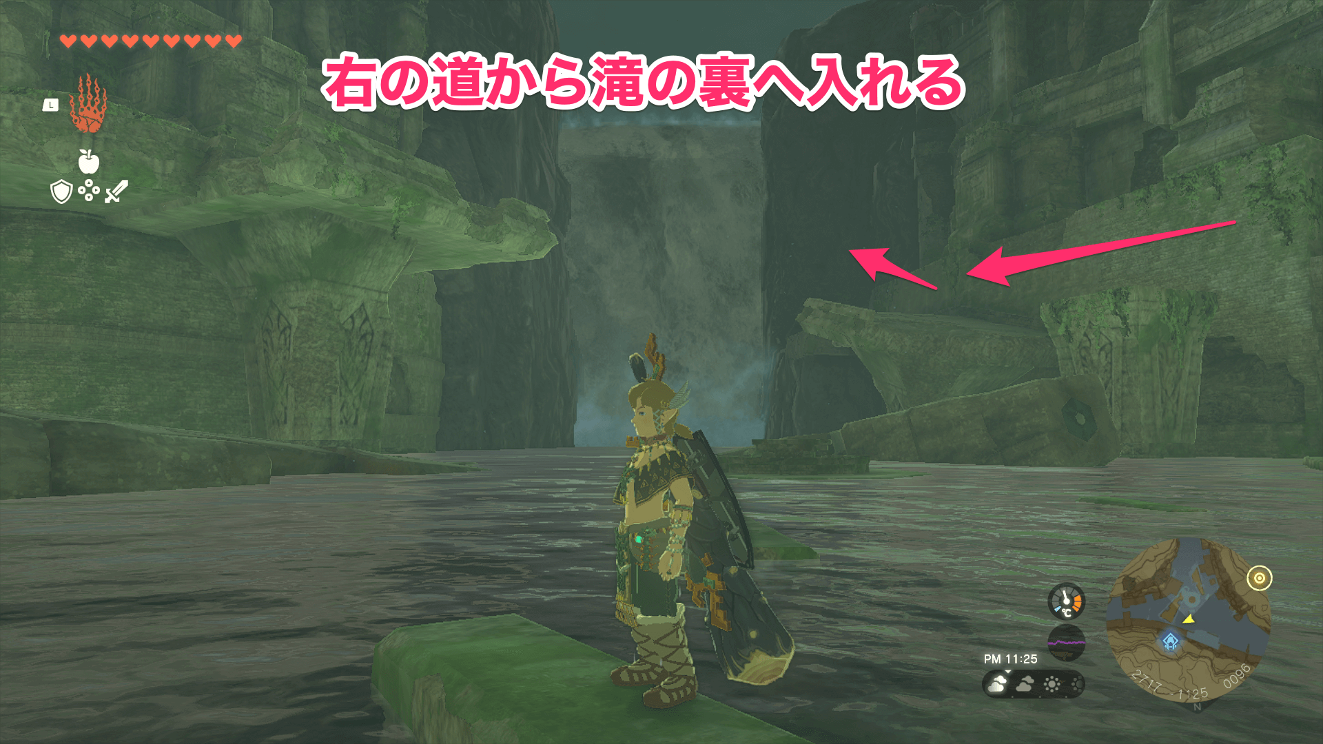 オオギンの祠の水晶は、滝の裏にある「ラネール参道滝の洞窟」にある。滝の右にある道から洞窟に入れるので、チャレンジを開始したら崩れた足場を伝って洞窟へ向かおう。