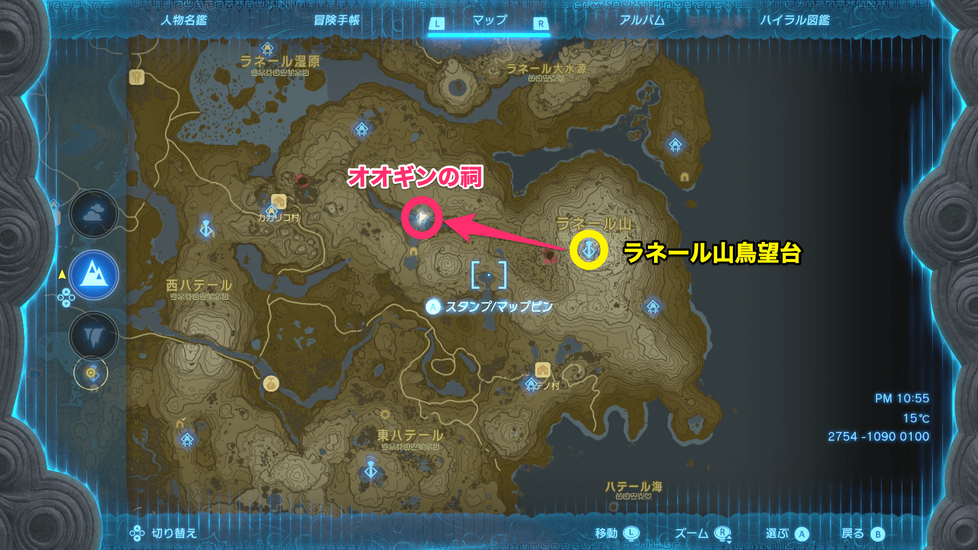 ラネール参道の祠と水晶の受注場所は、ラネール山鳥望台から西へジャンプして進むと辿り着ける。まだ鳥望台を解放していない場合は、先に訪れておこう。