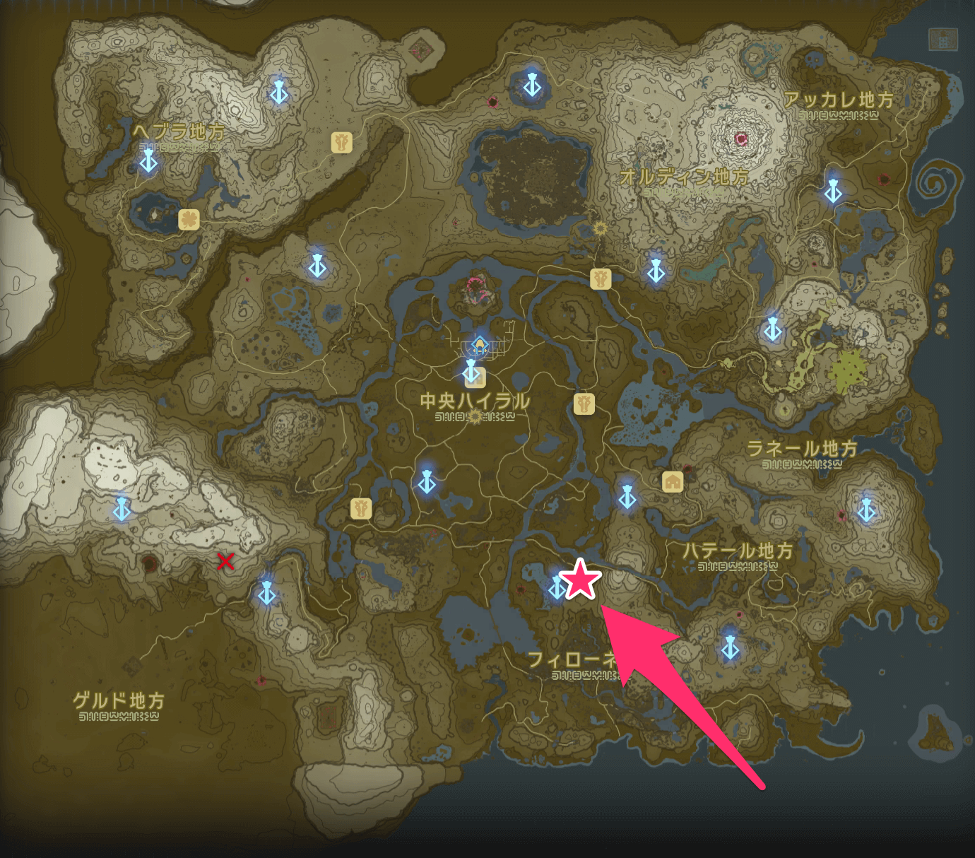 「水から生まれし鍵」の受注場所へ行くために、まずマップにピンを打とう。受注場所は、ノッケ川の南にある街道の側にある。