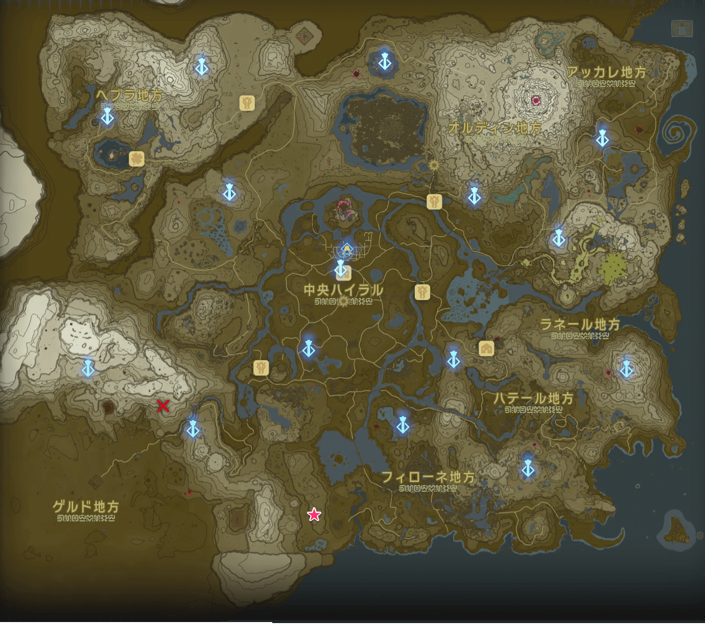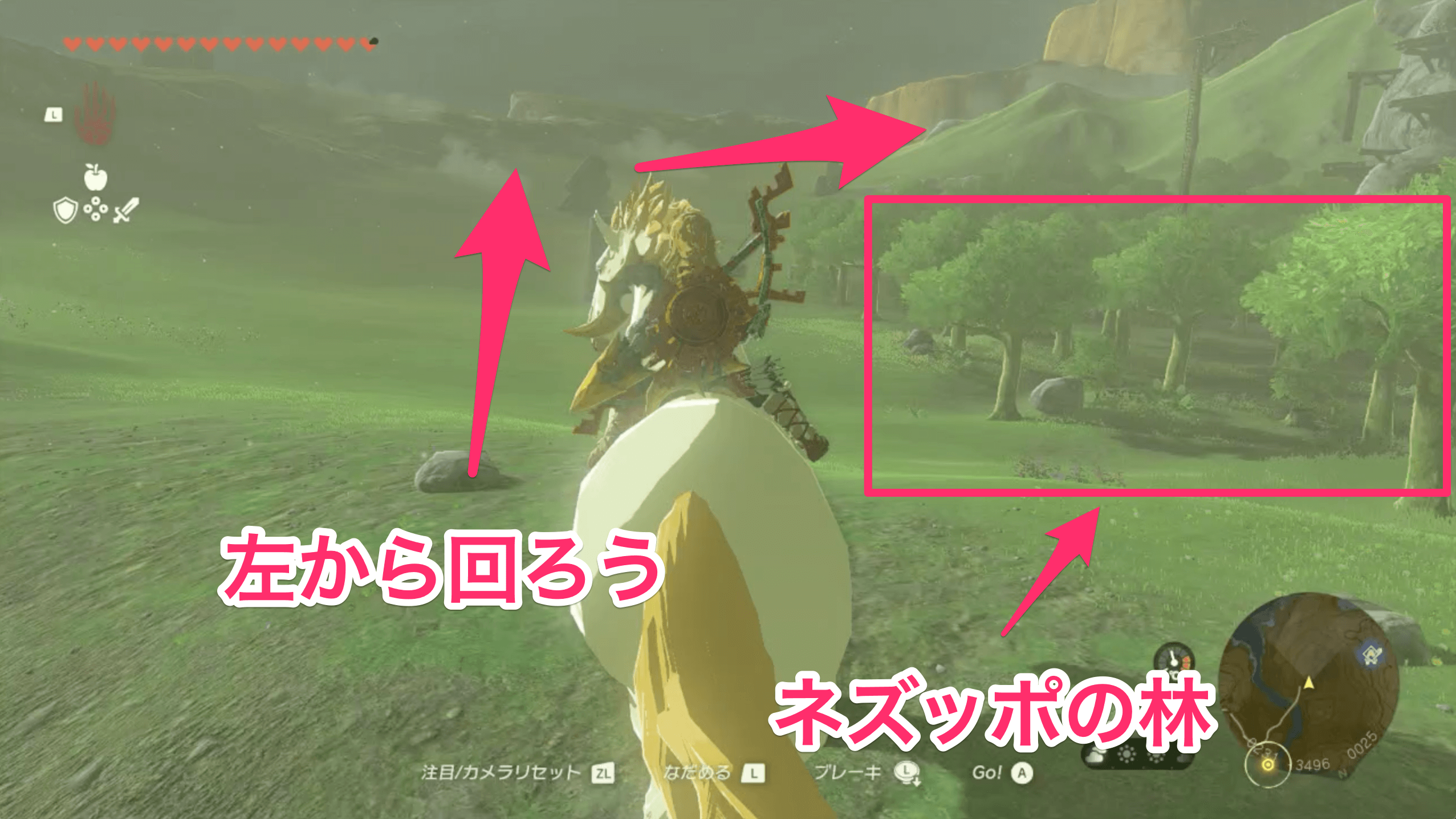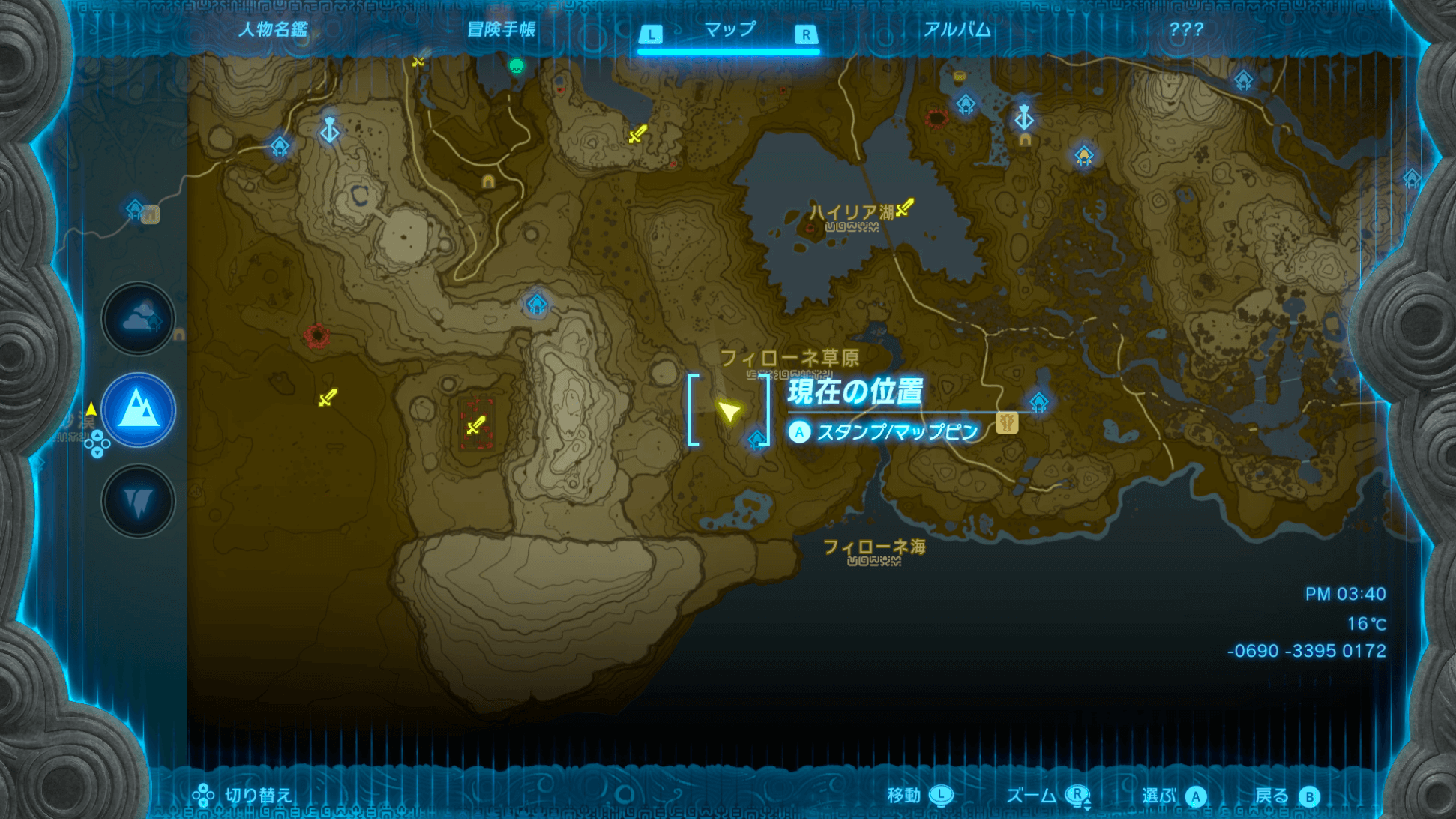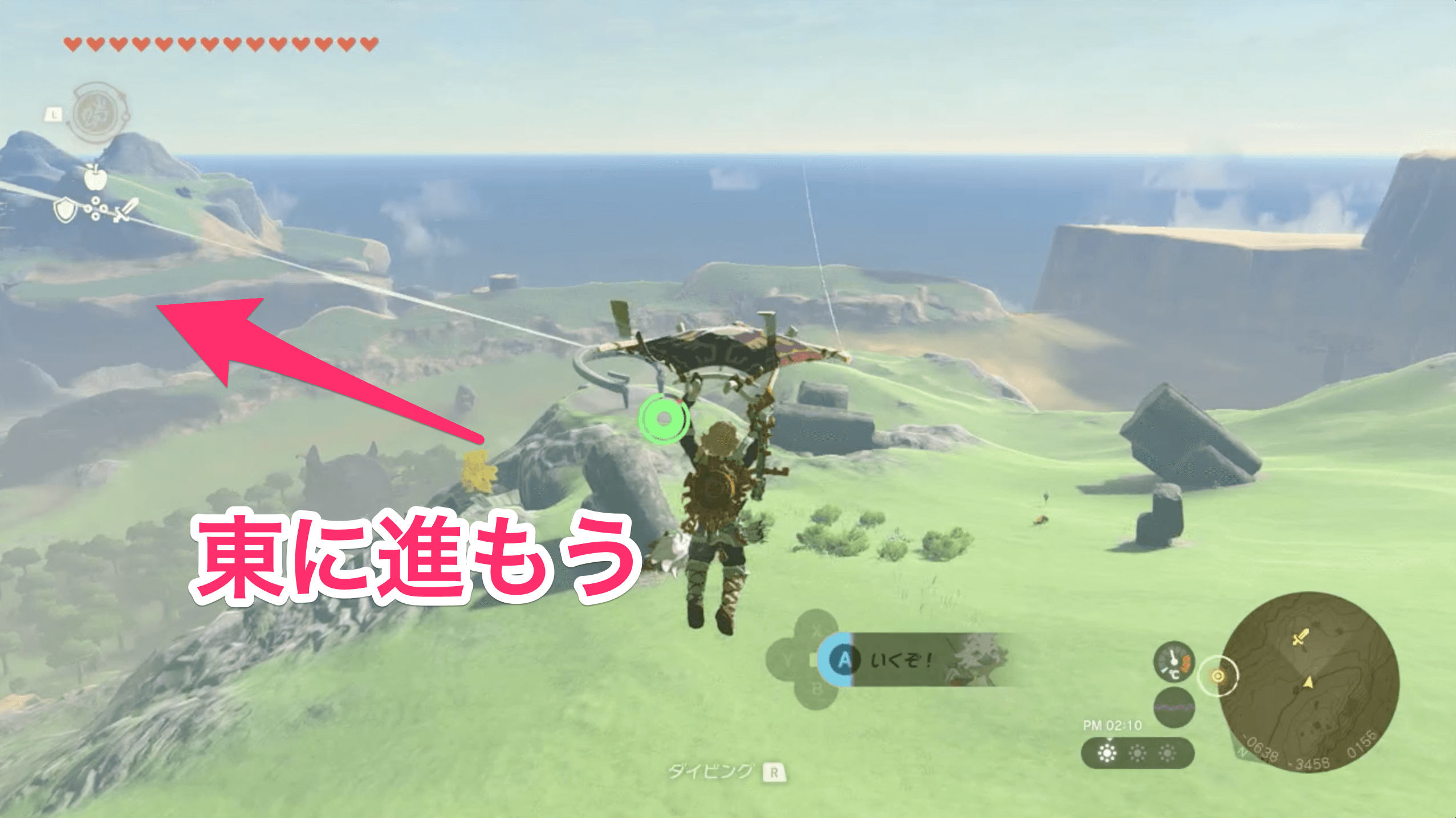 鳥望台から南西に飛んで、パラセールを使って「ハイラル湖」を超えたらフィローネ草原へ向かおう。なお、フィローネ草原には各所に丘があるため、走るより丘に登ってからパラセールを使うと速く移動できる。