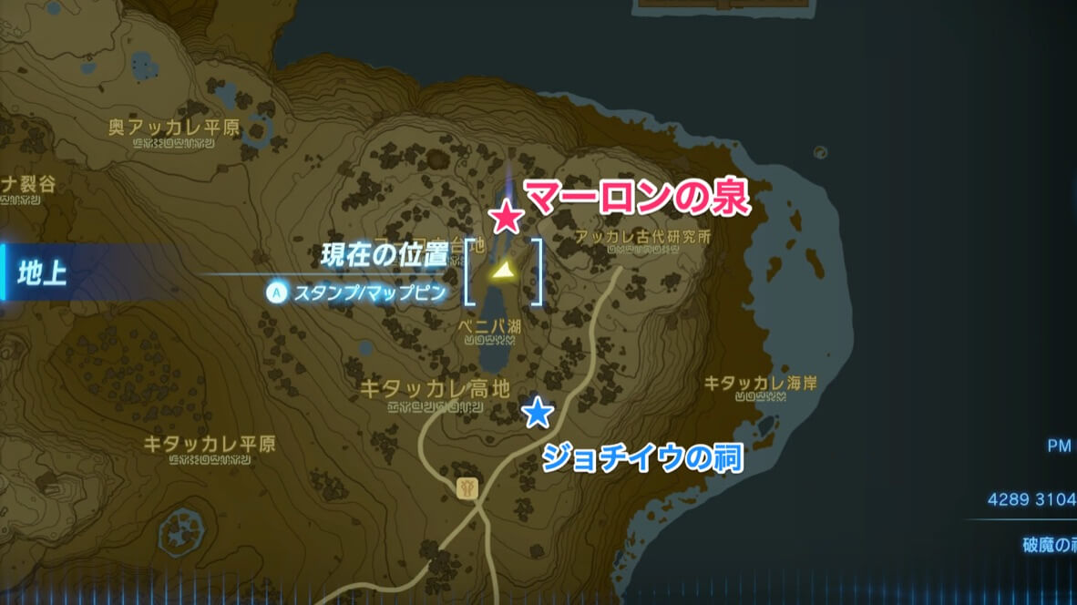 馬神マーロンはマップ最北東のアッカレ地方にある、蹄鉄の形をした「マーロンの泉」に出現する。マップ中央から向かうとかなり遠いため、馬やエアロバイクに乗り、道中の祠や鳥望台を解放しながら向かおう。