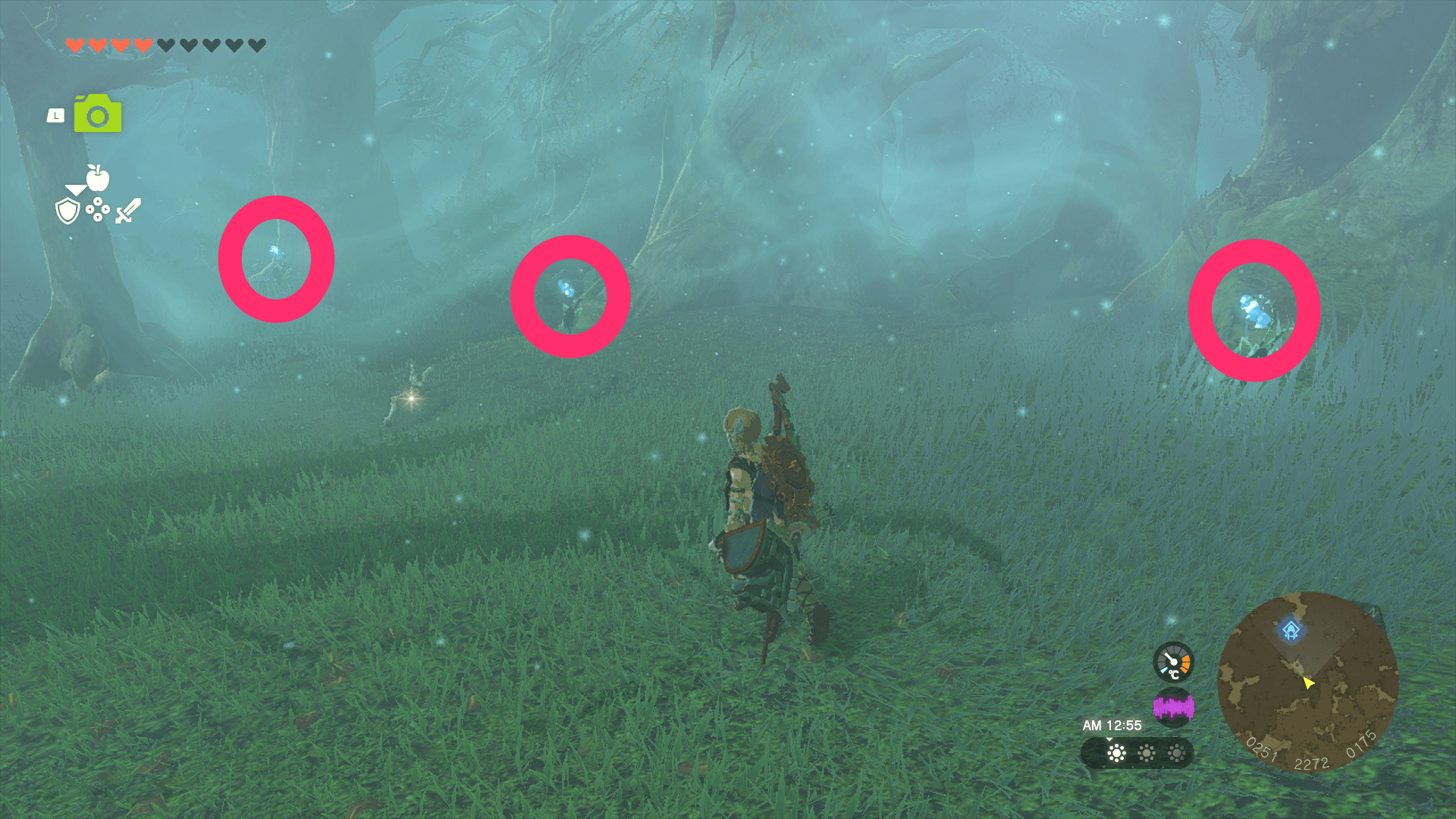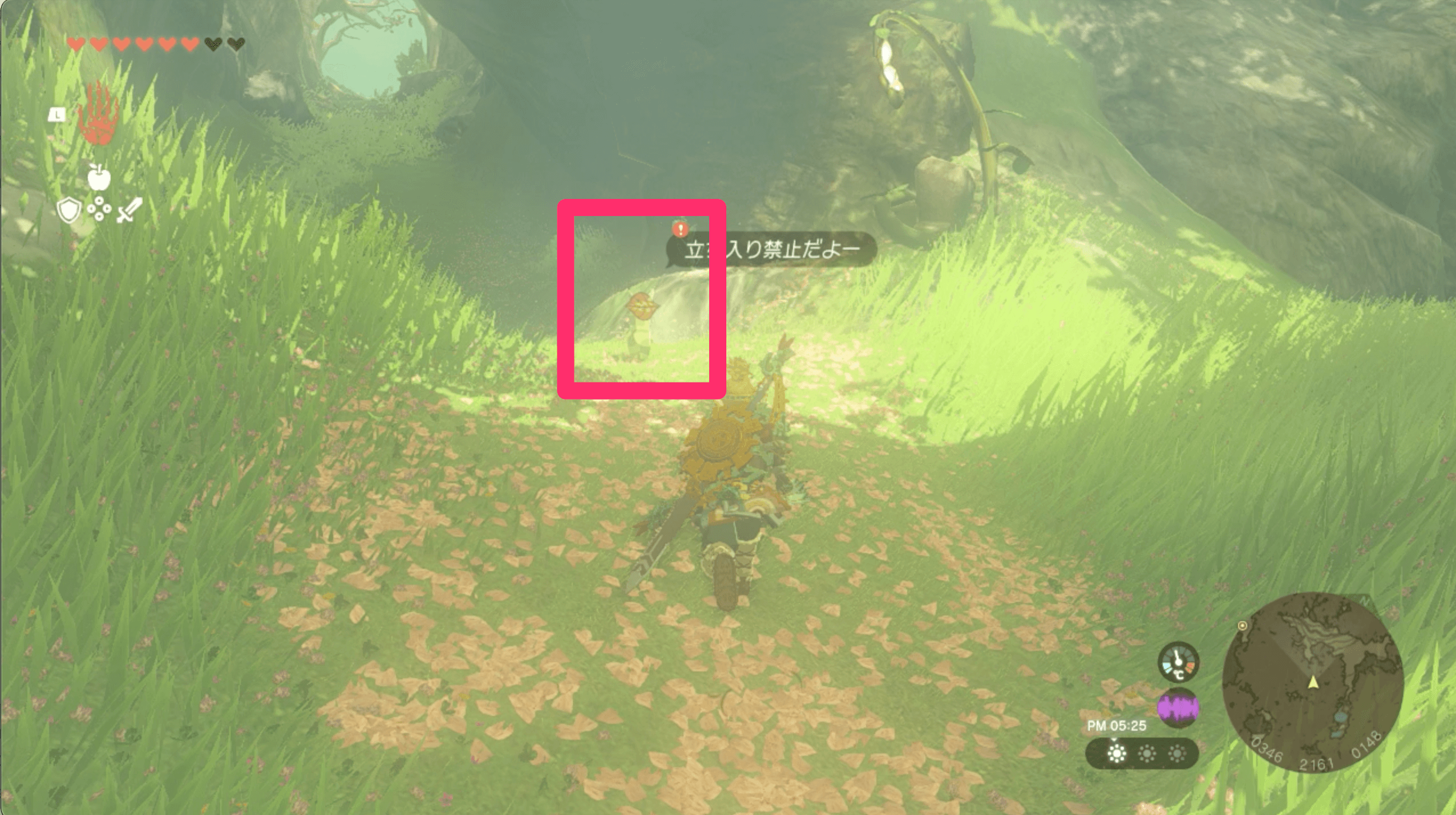 セクンボマラの祠に辿り着くには、ハイラル大森林を進んでほこらチャレンジ「この先立ち入り禁止?」をクリアする必要がある。しかし、ハイラル大森林では間違った道を選ぶと、スタート地点に戻されてしまう。迷わないように、目印として生えているしのび草を頼りに進んでいこう。