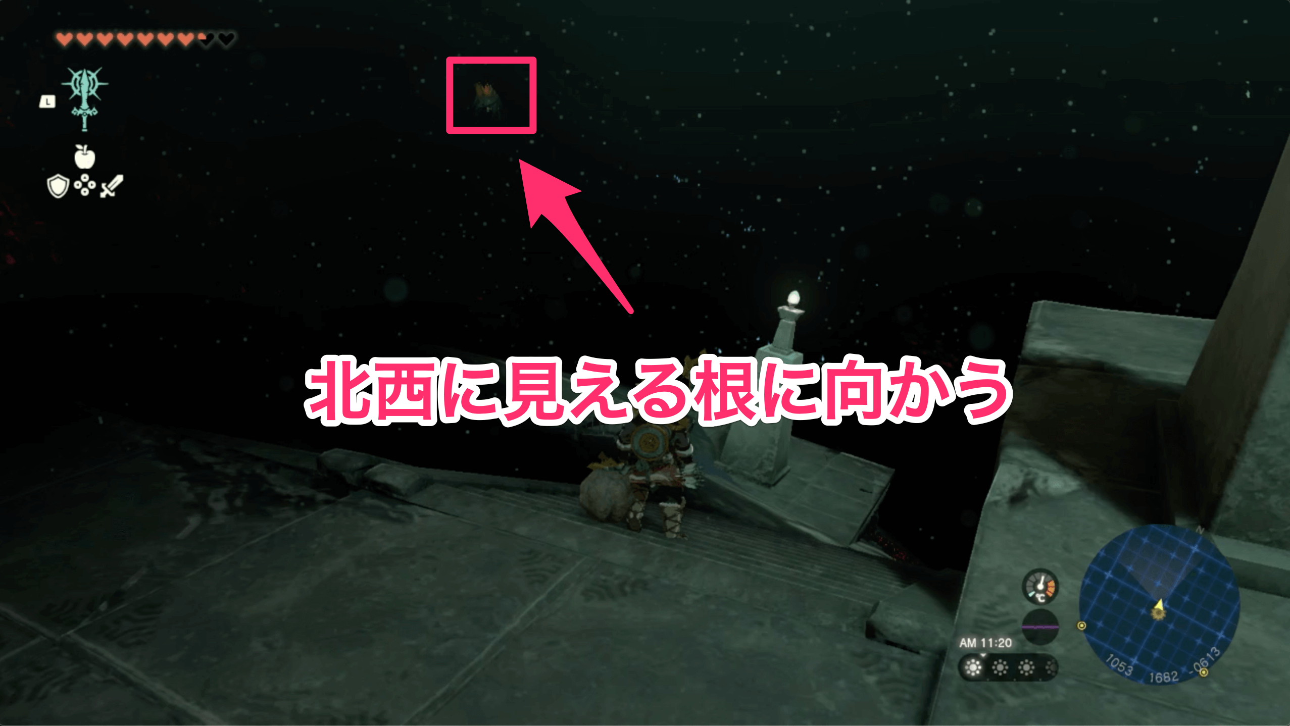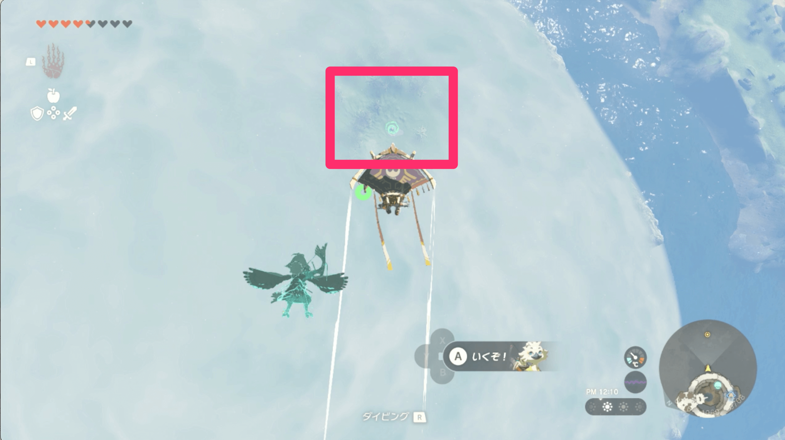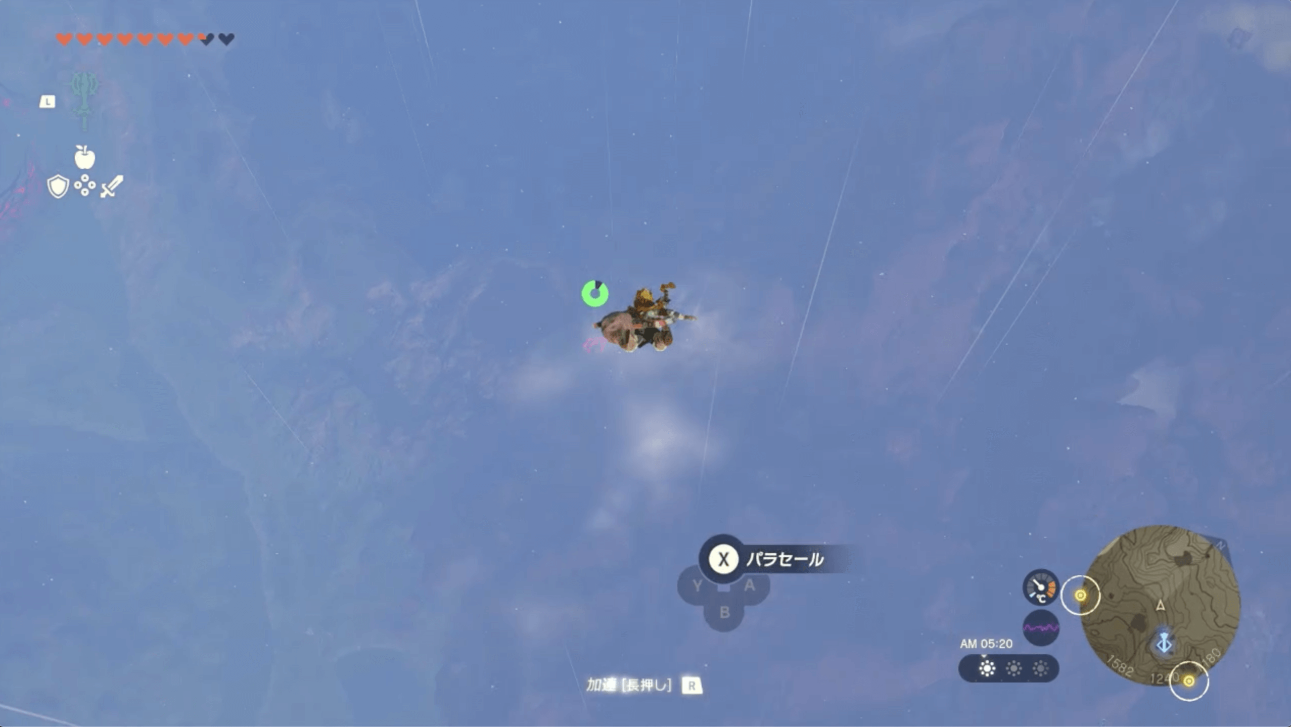 ハイラル大森林の上空から飛び降りたら、ニンジシの祠を目指して滑空しよう。高度が下がると霧に包まれて祠を目視できないので、マップ上に表示されているマーカーを目印にすると良い。