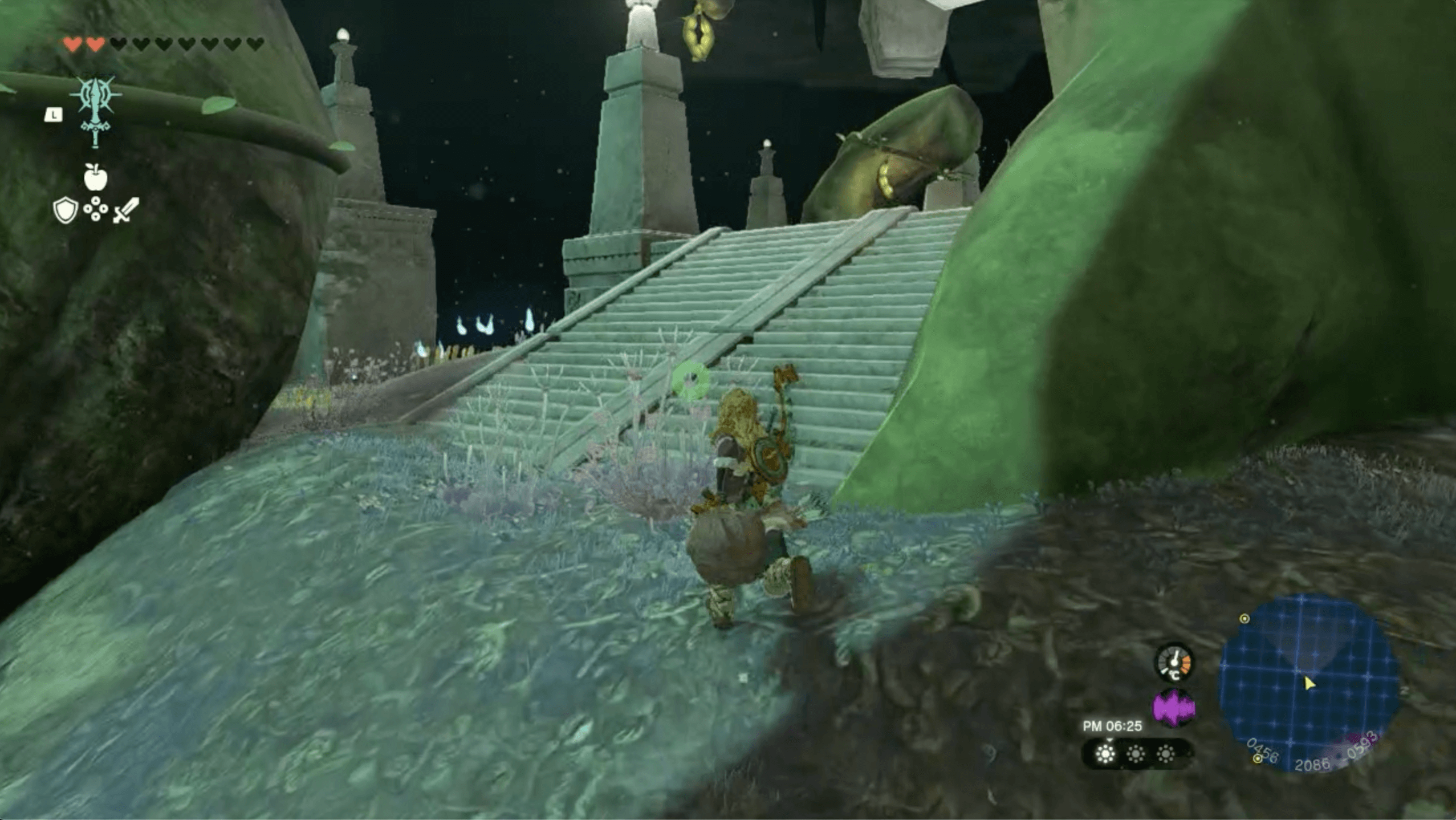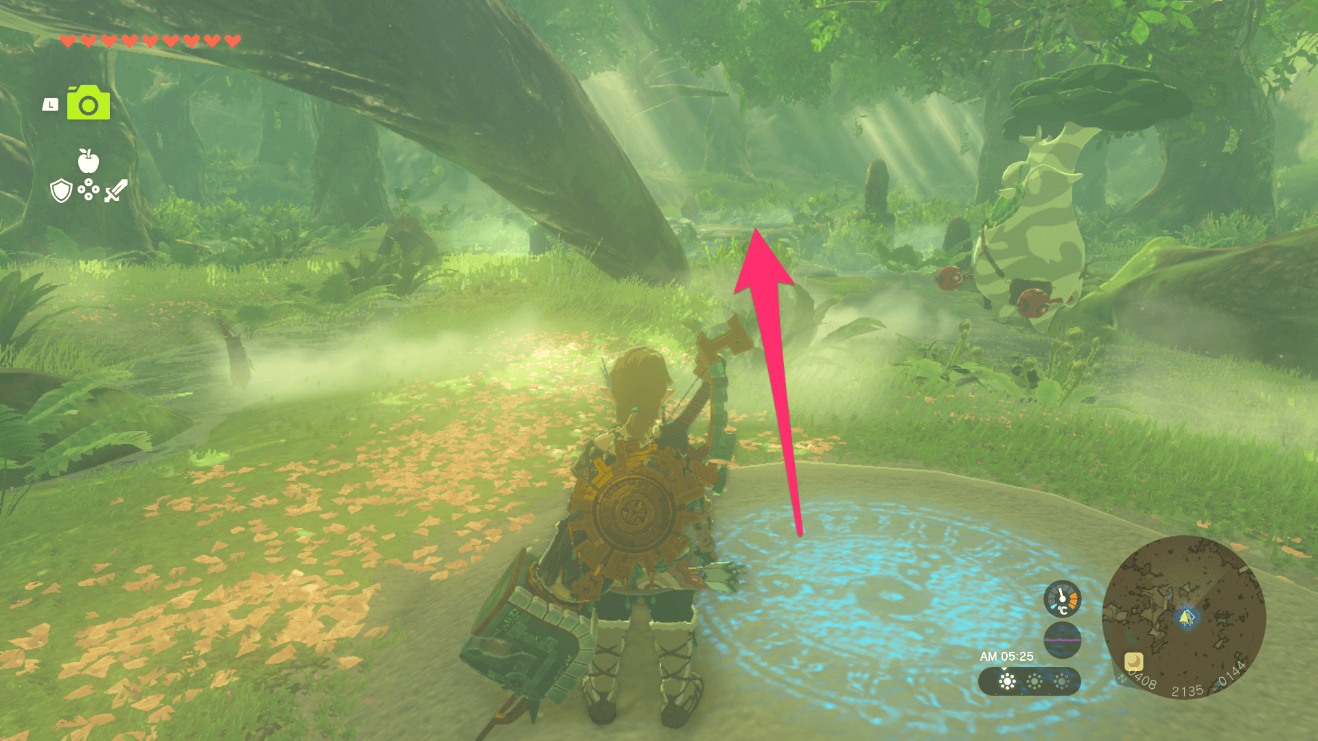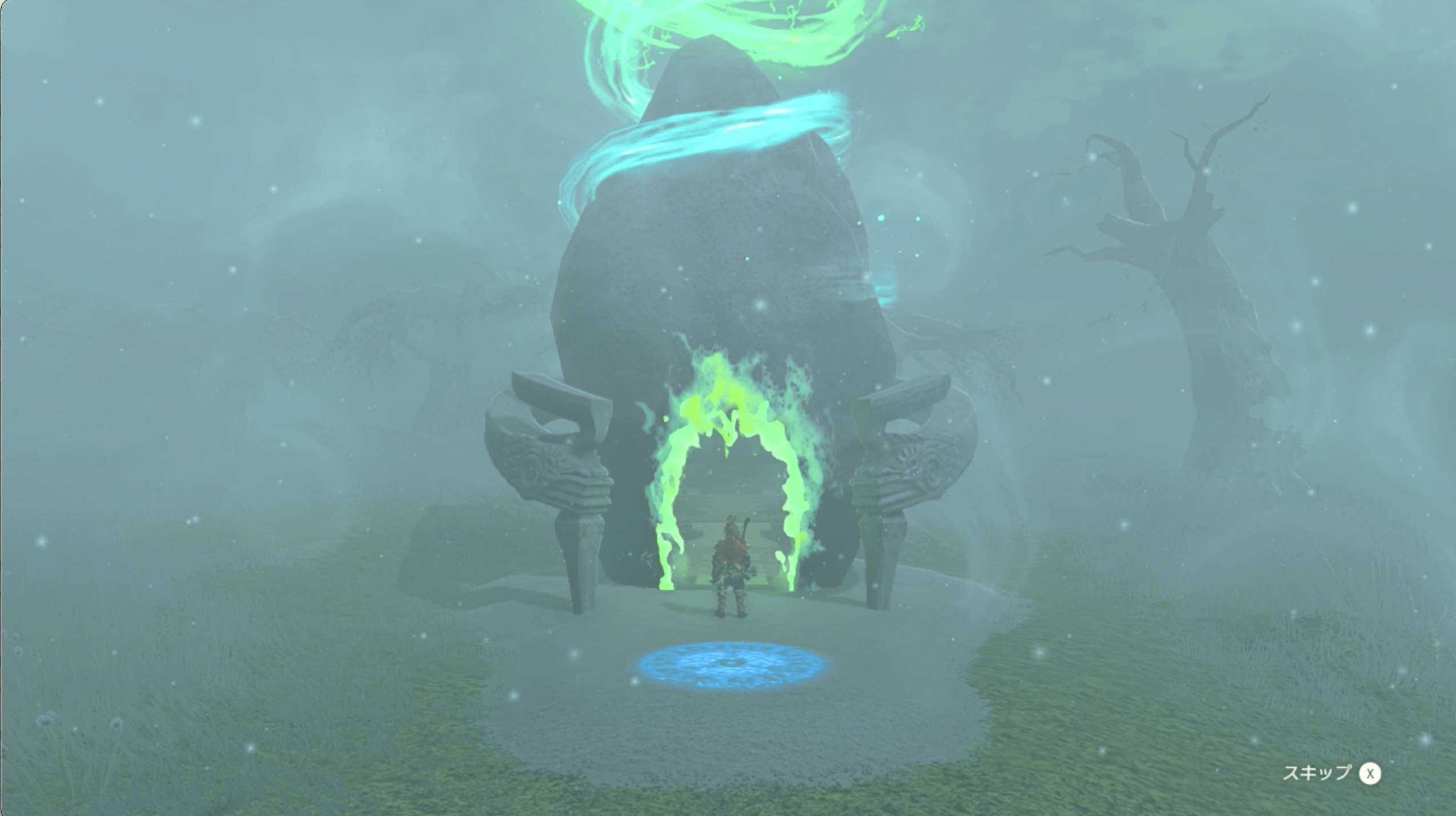 ハイラル大森林の上空から飛び降りたら、ニンジシの祠を目指して滑空しよう。高度が下がると霧に包まれて祠を目視できないので、マップ上に表示されているマーカーを目印にすると良い。