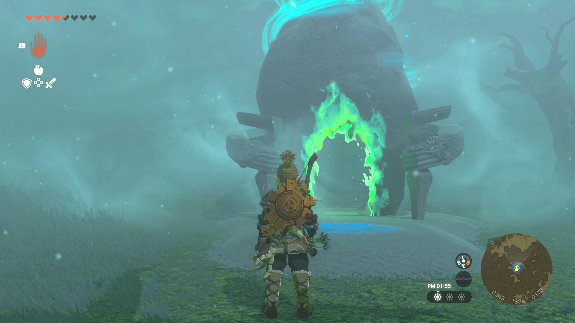 ニンジシの祠は、祝福の祠なので奥にある紋章に触れるとクリアとなる。ただし、紋章までの道中に「ゴーレムの剛弓」を回収できる宝箱があるため、忘れずに回収しておこう。