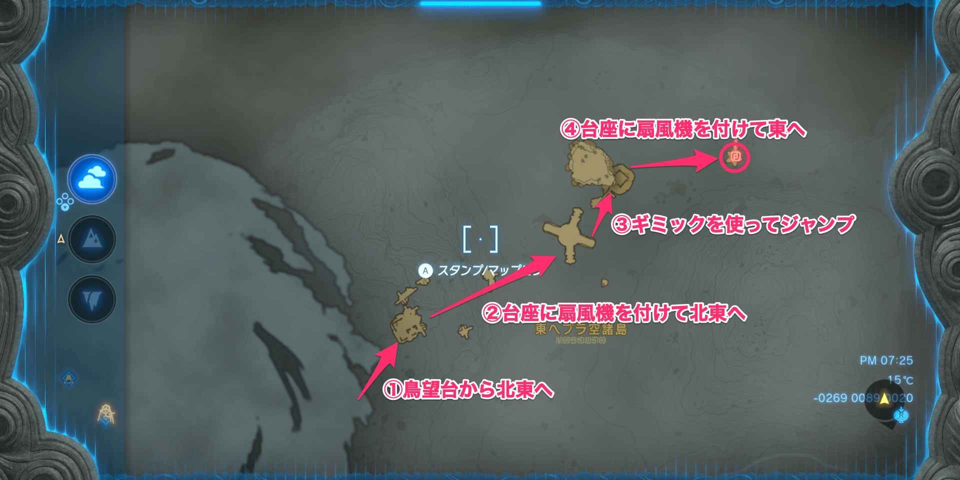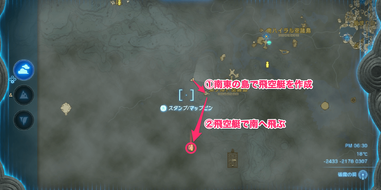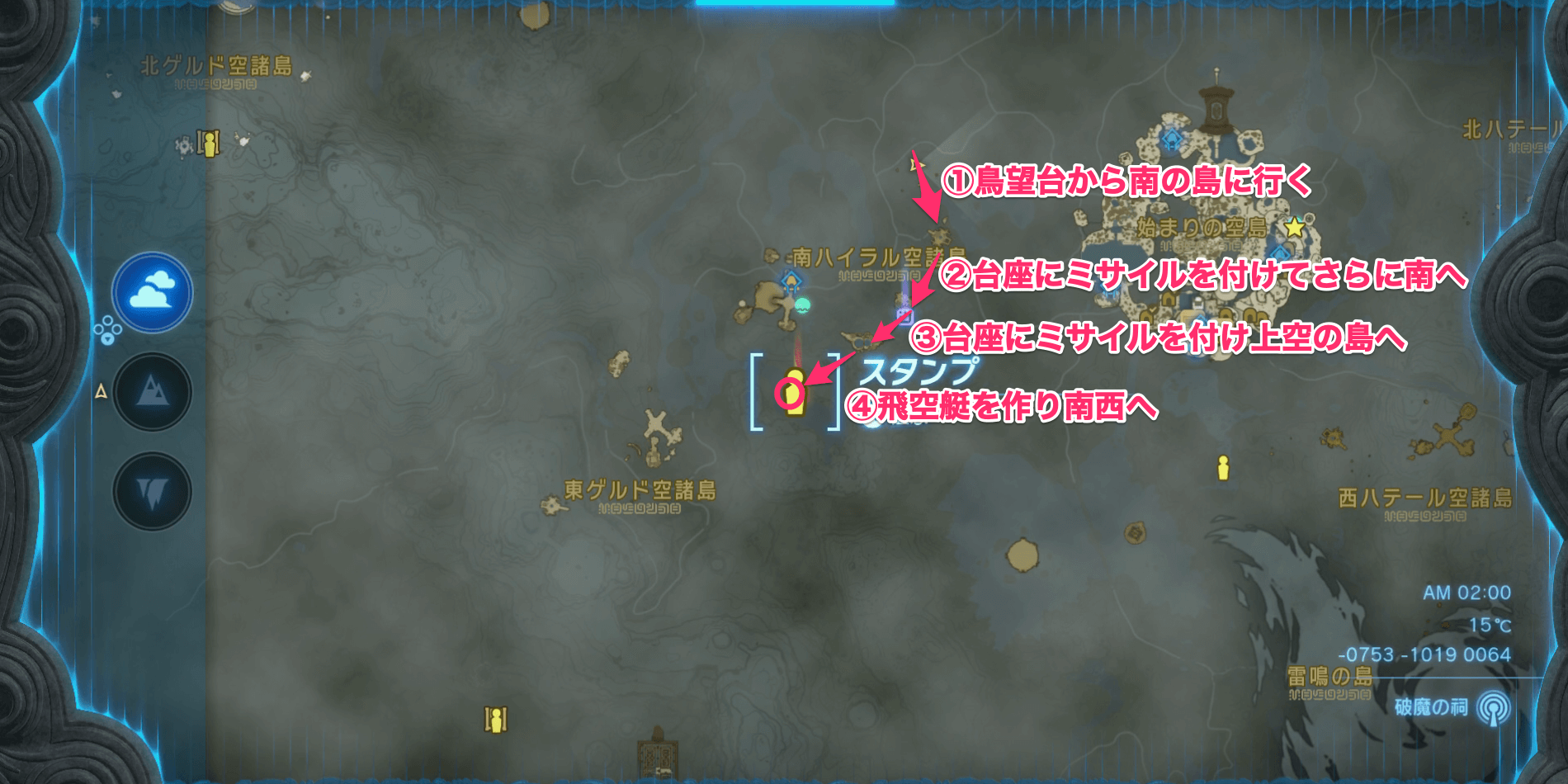 6番目の石碑へは、ゲルドキャニオン鳥望台から南東に飛び、空島にある飛行機を組み上げて南に向かおう。自身でロケットなどを追加しておくと、安定して石碑の場所に向かえる。