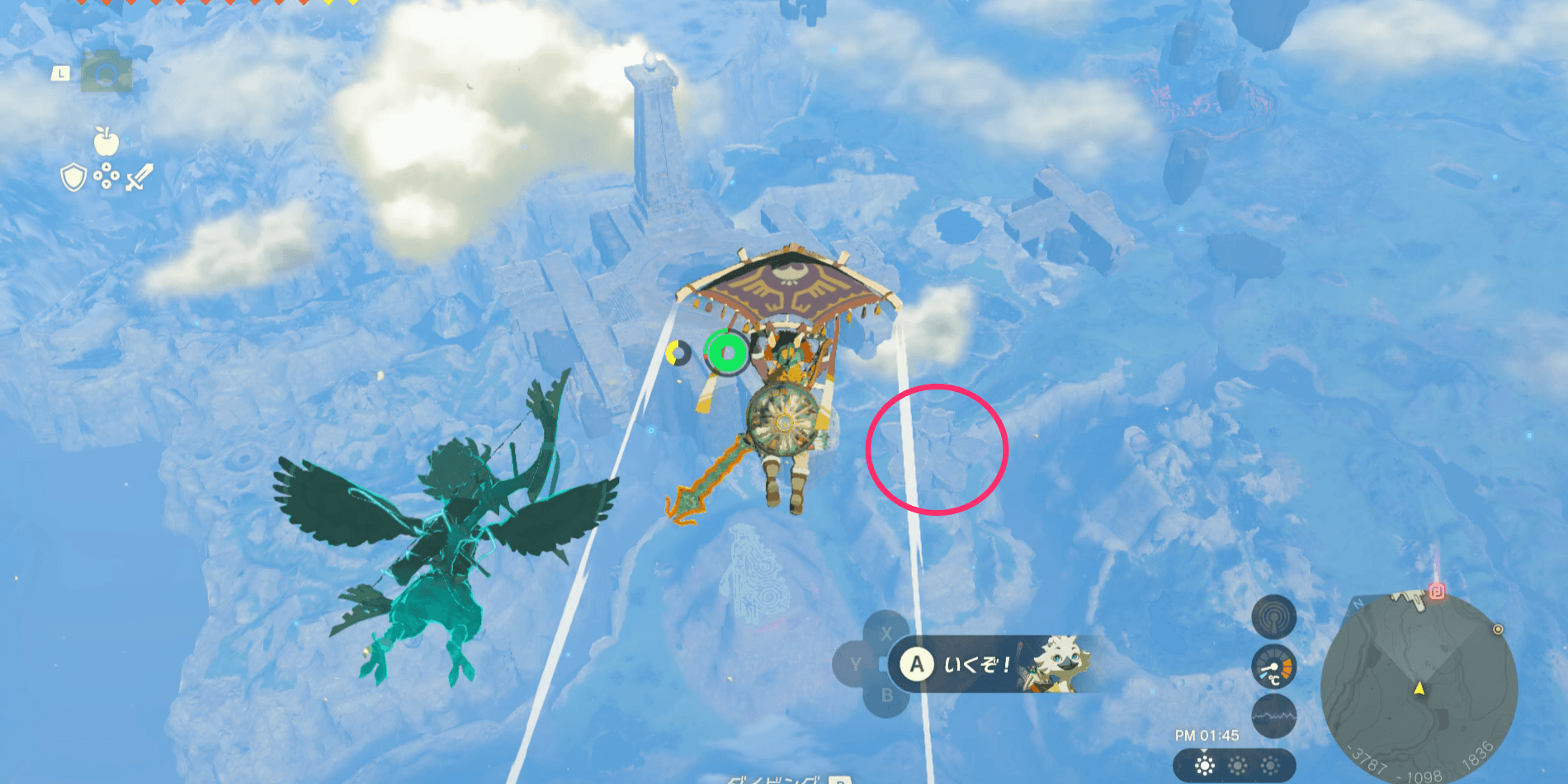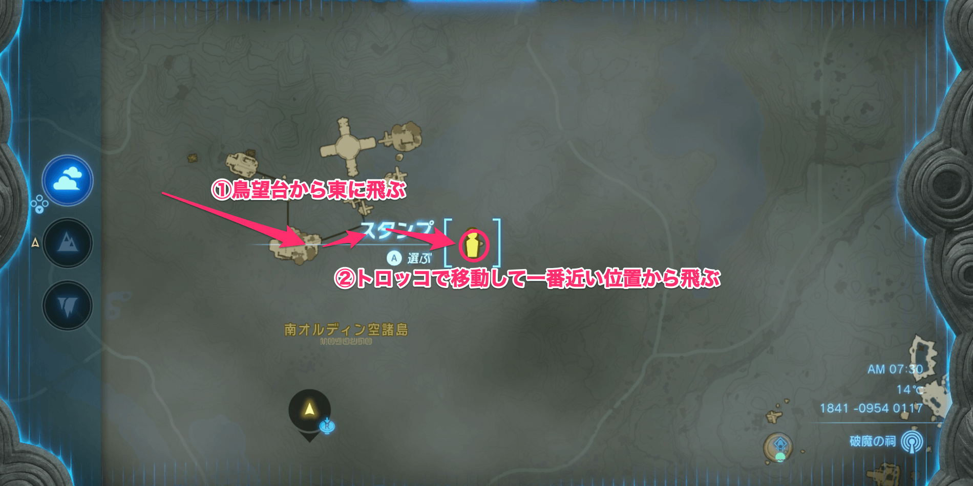 1番目の石碑は、オルディン峡谷鳥望台東の空島から飛んでいけばOKだ。空島の上をトロッコで移動し、石碑に一番近い位置からパラセールで飛ぼう。