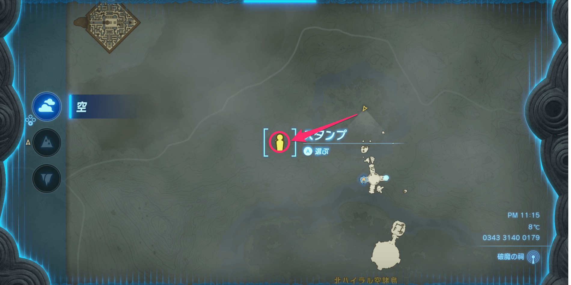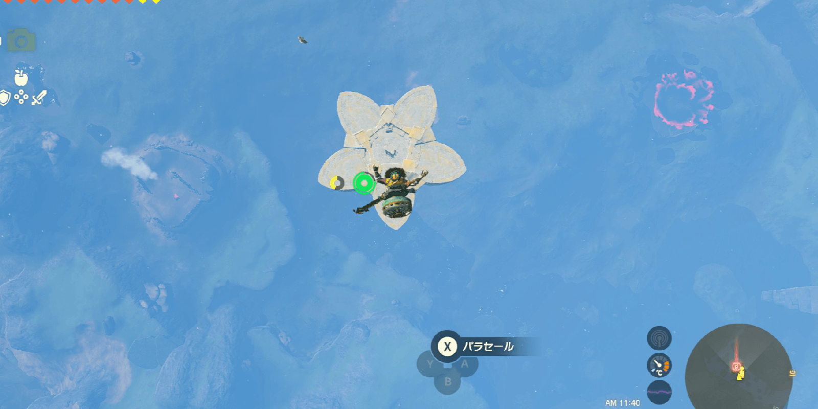 9番目の石碑には、ゲルド高地鳥望台から飛び、北東に向かえばパラセールで直行可能だ。付近に島があり、さらに高度が下の方に石碑がある。