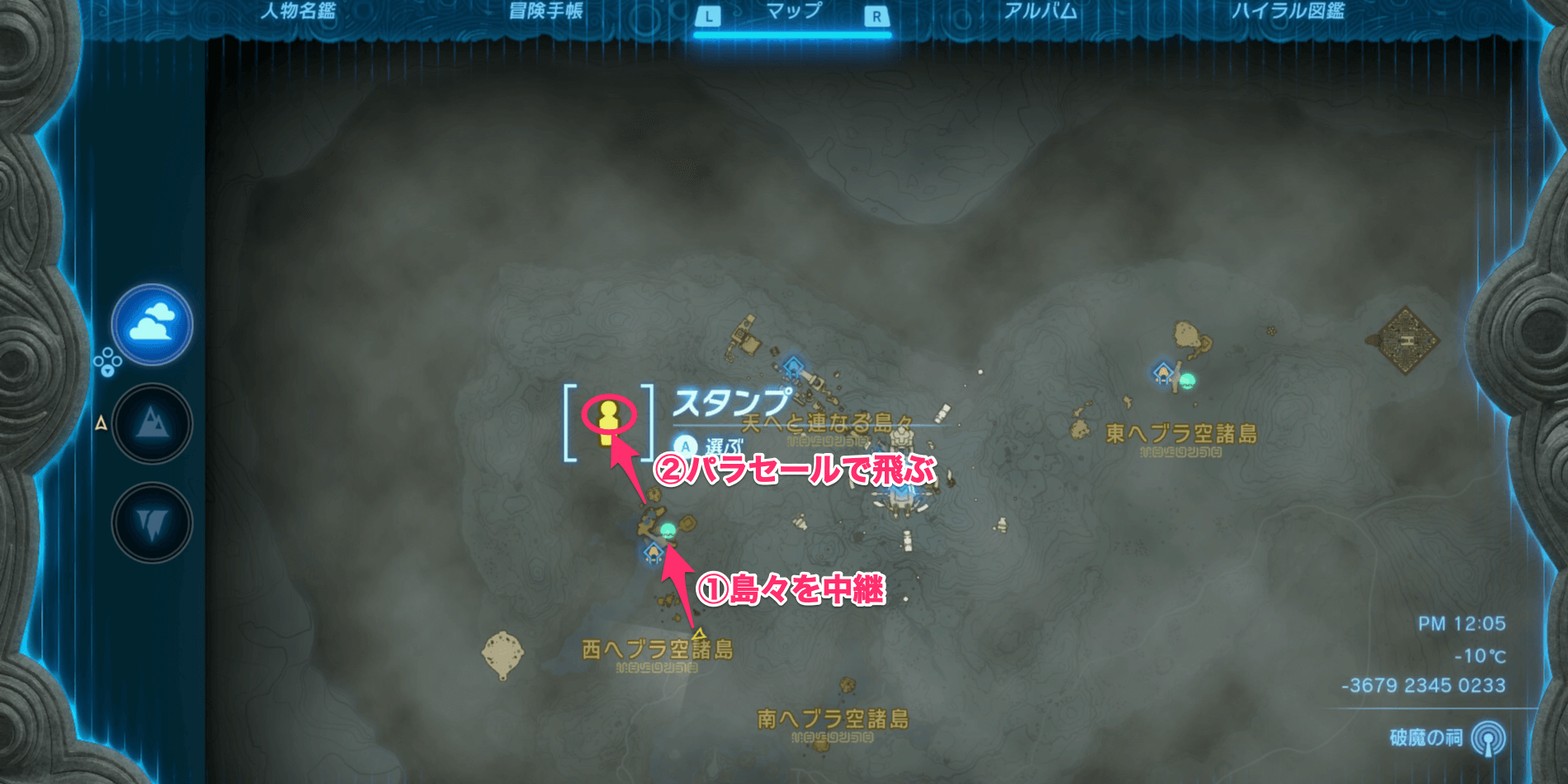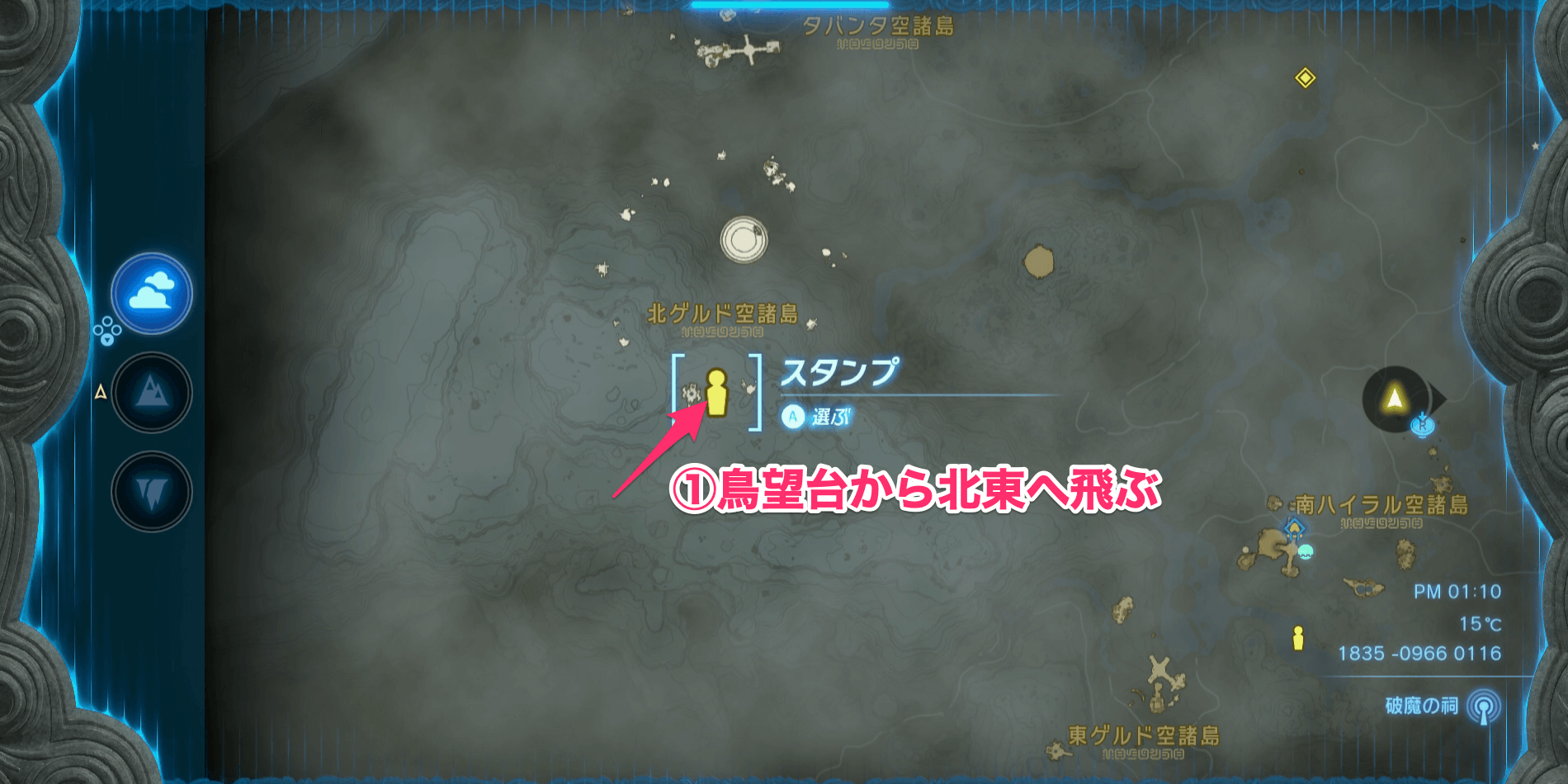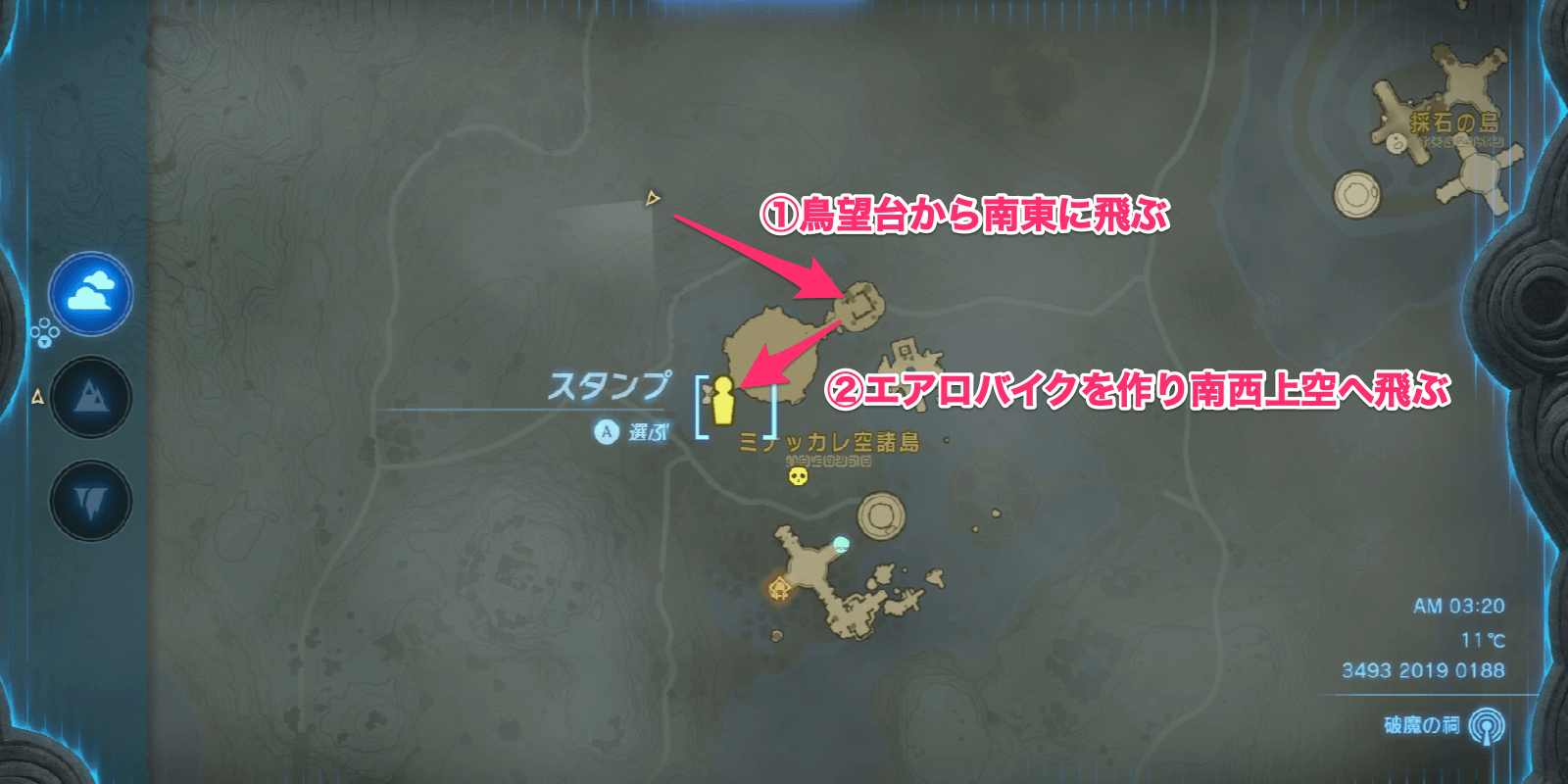 12番目の石碑には、アッカレ地方にあるウルリ山鳥望台から南東へ飛び、途中の島でエアロバイクを作って行こう。石碑は途中の島よりも遙か上空にあるため、エアロバイクに必要なゾナウギアがまとめて置いてある島から飛んでいけばOKだ。