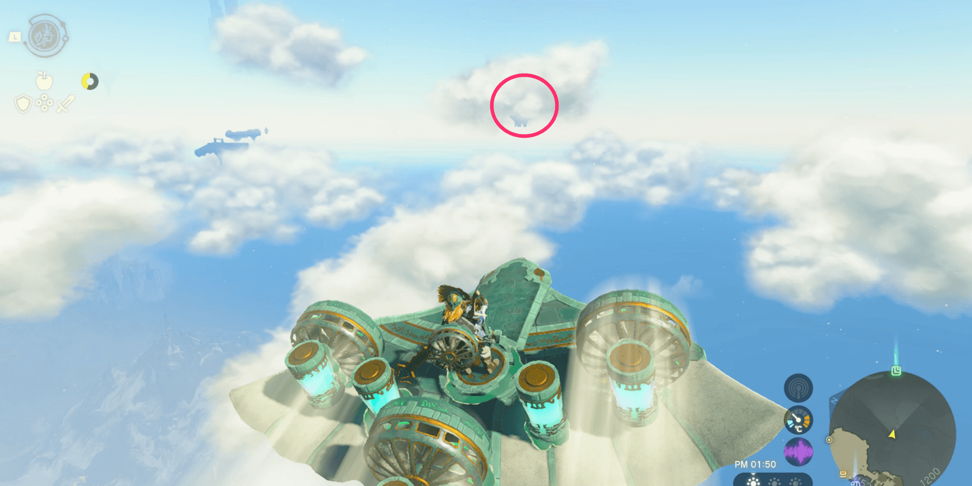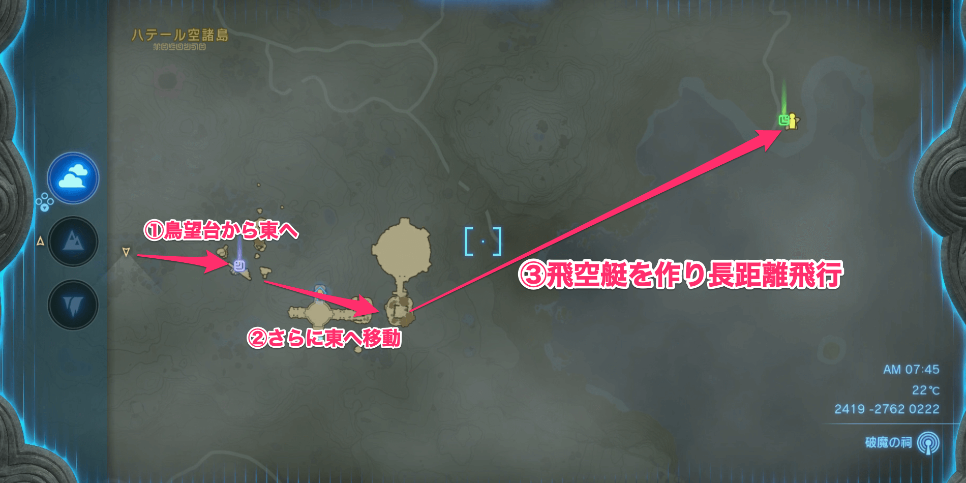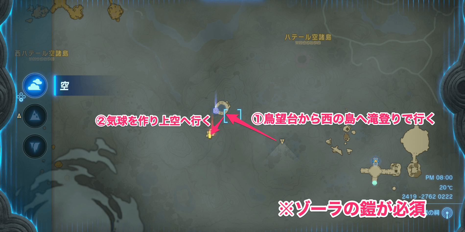 7番目の石碑には、ラベラ湿地帯鳥望台から西へ飛び、空島を経由して気球で行こう。経由する空島には、滝登りで行く必要があるため、ゾーラの鎧が必須だ。滝を登った先で気球を作り、上空にある石碑の場所へ行こう。
