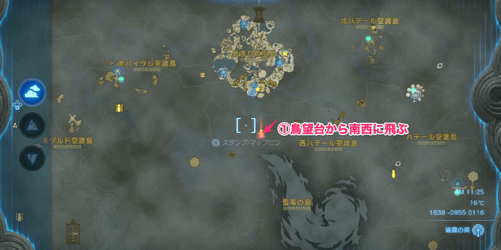11番目の石碑には、ハイラル平原鳥望台から飛び、空島を経由しながら向かおう。南西方向へ空島を経由し、2つ目の島ではミサイルを上方向に付け、上空の島へ行く必要がある。上空の島から飛空艇で南西に向かえば、石碑のある場所に辿り着く。