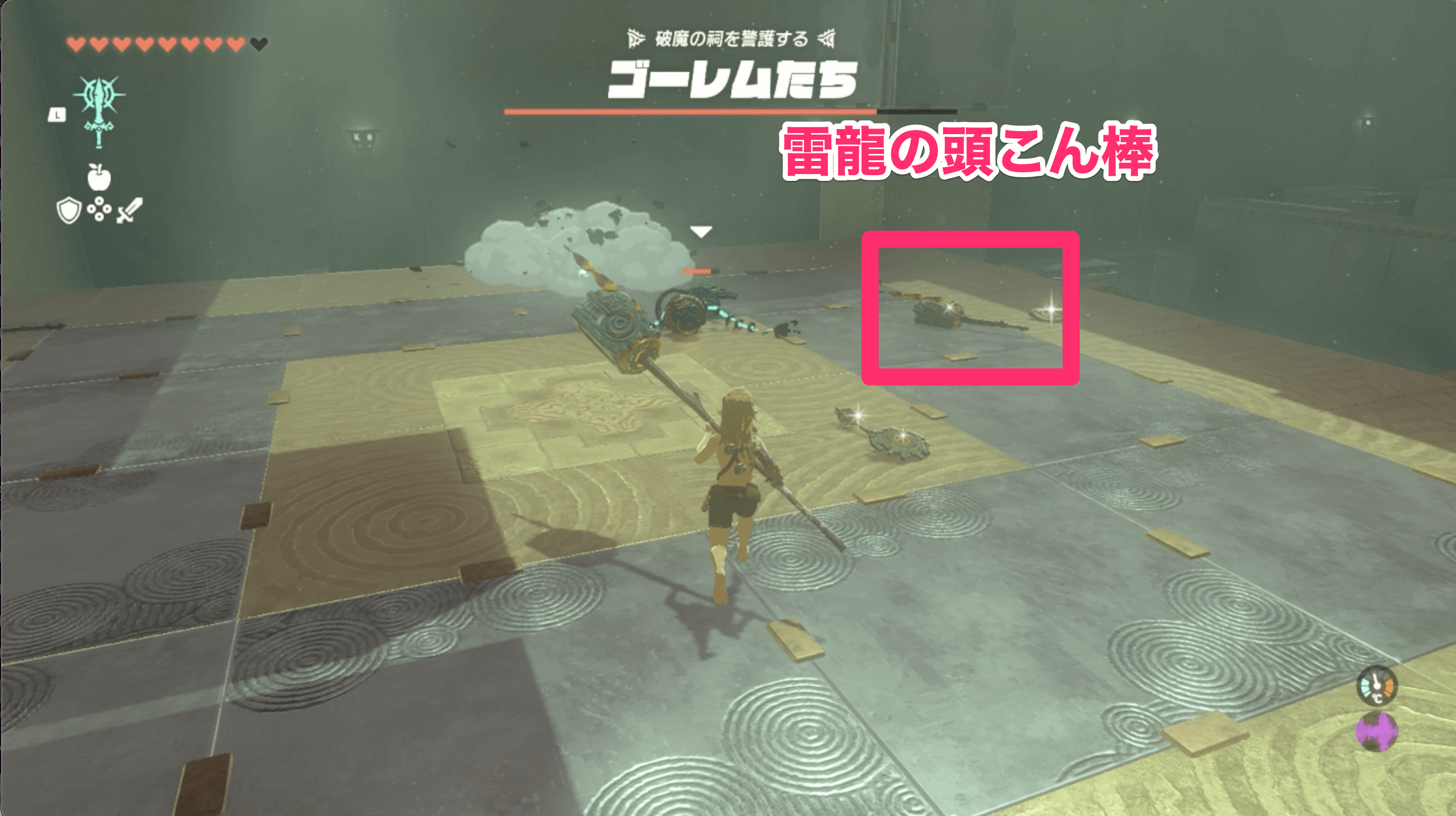 試練が始まったら、部屋の奥に落ちている「雷龍の頭こん棒」を拾おう。雷龍の頭で攻撃するとゴーレムが感電するので、一方的なバトルができる。もしこん棒が壊れたら、ゴールへの扉の前に落ちている雷龍の頭をスクラビルドすると良い。
