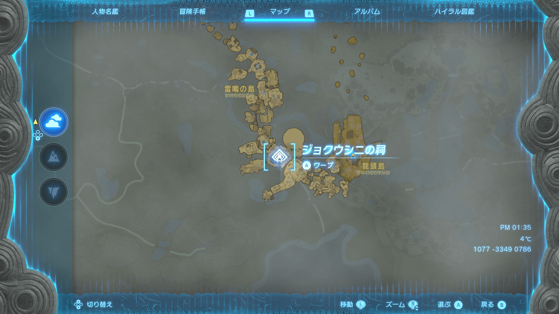 ジョクウシニの祠は、雷雲に包まれている「雷鳴の島」にある。雷鳴の島はメインチャレンジ「五人目の賢者を探せ」を進めないと解放されないので、まだの場合は先にストーリーを進めておこう。